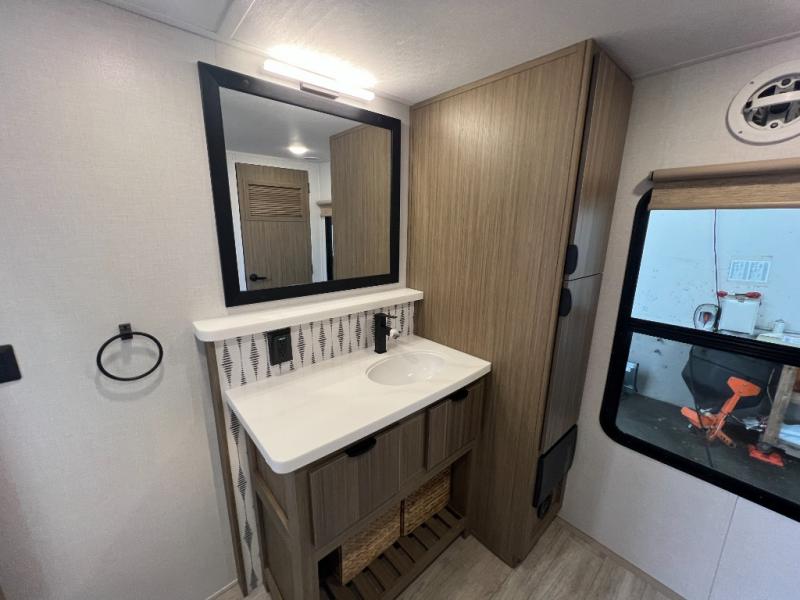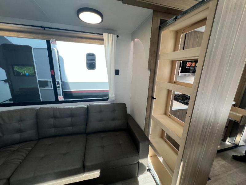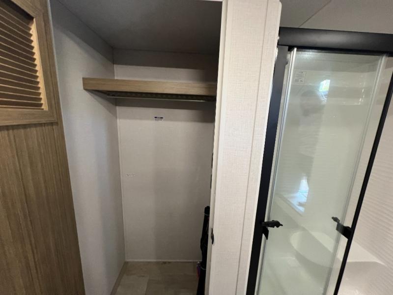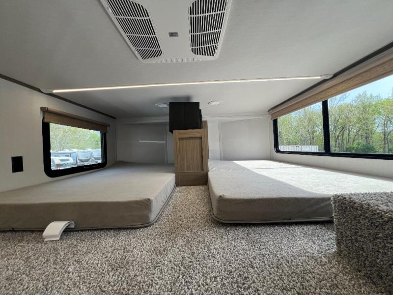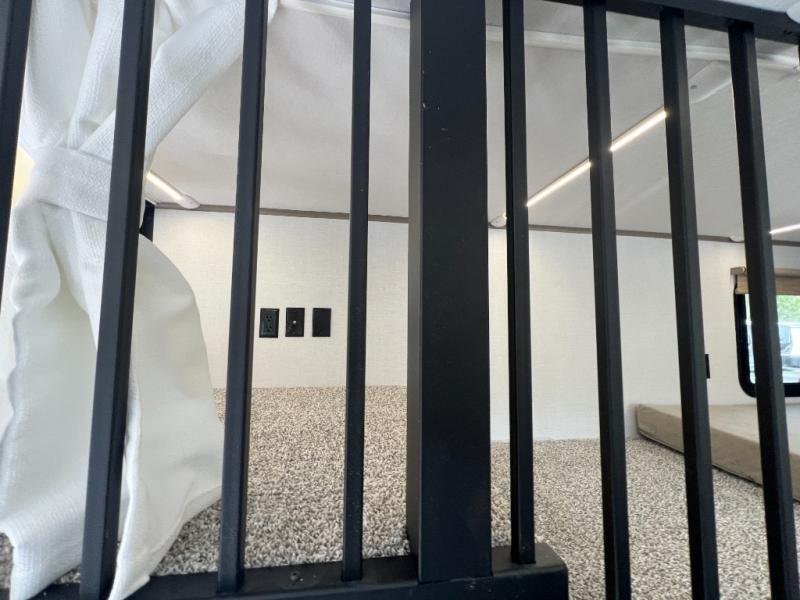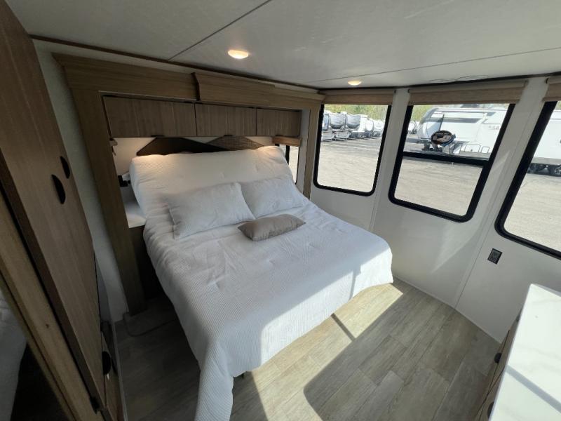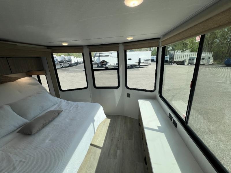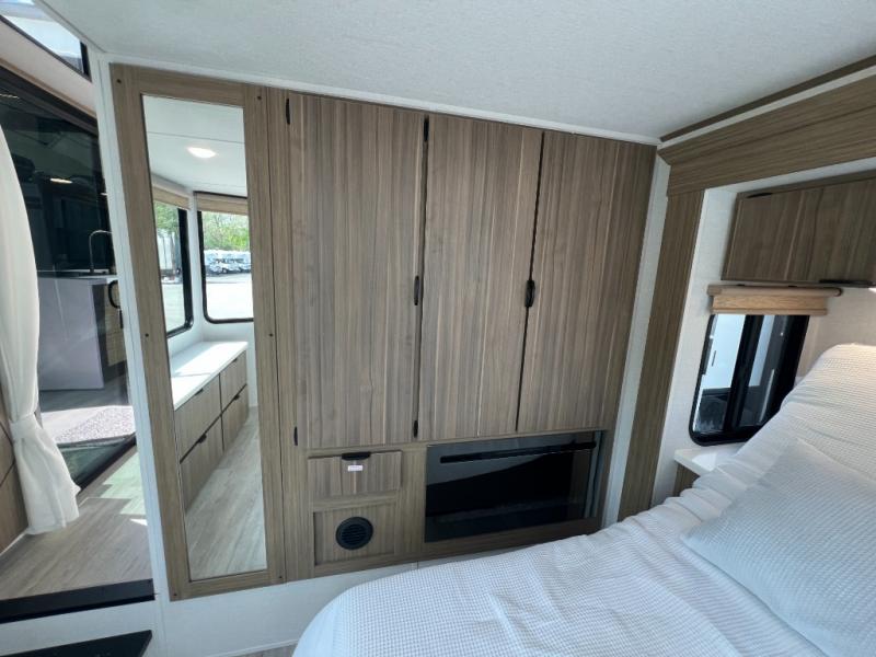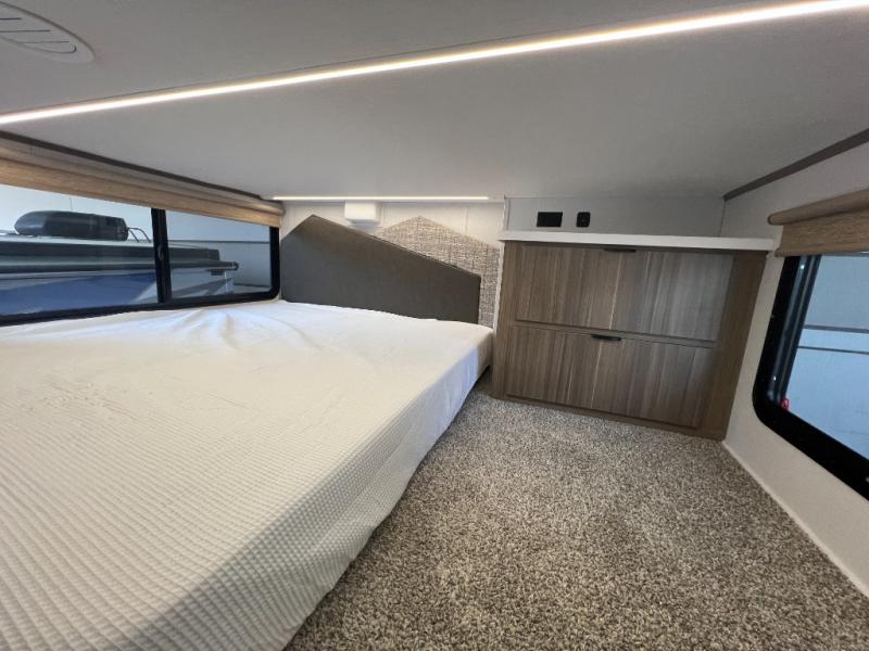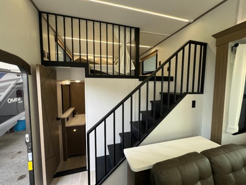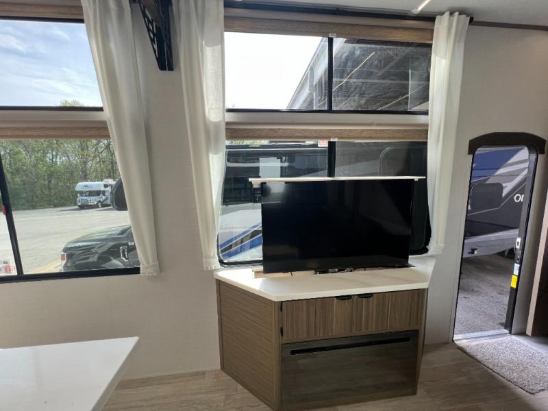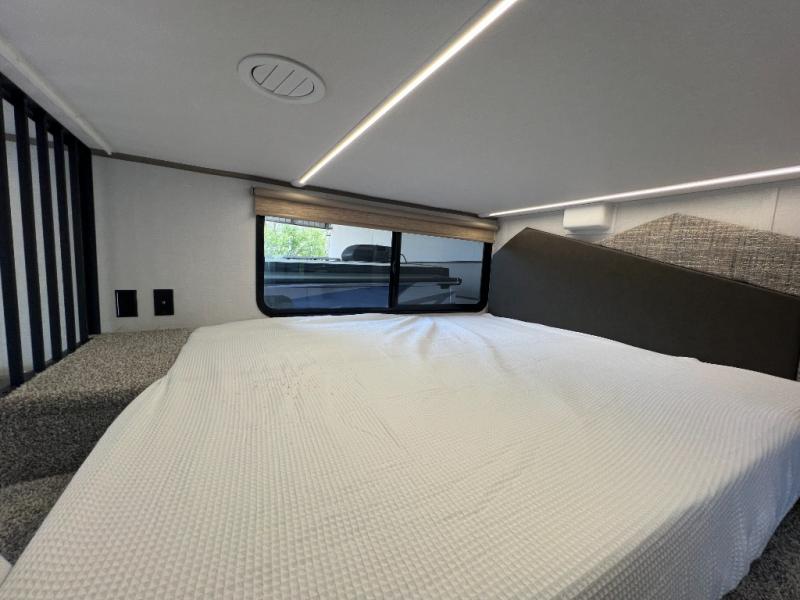 You will feel like you are home when you step inside! Not only will you be impressed with the super large slide in the main combined kitchen and living area, but check out the island with four counter height seats! The main entry closest to the front features a private bedroom with a custom king bed with Versa-Tilt within a slide, plus a fireplace and a dresser for your belongings. Just outside this door is a spiral staircase to the front loft with two 42" x 74" bunk mats above. The kitchen is fully equipped for you to provide the best home cooked meals with a pull-out pantry, range and microwave, plus side-by-side refrigerator. There is also a half bath off of the kitchen for added convenience! An L-shaped sectional sofa with an ottoman provides a cozy space to relax, and there is an entertainment center with a fireplace for a relaxing evenings indoors. A full rear bath features a spacious walk-in shower, a linen closet plus washer and dryer prep for the option to make laundry day easier. And the second loft with stairs is above the bath for even more sleeping space!