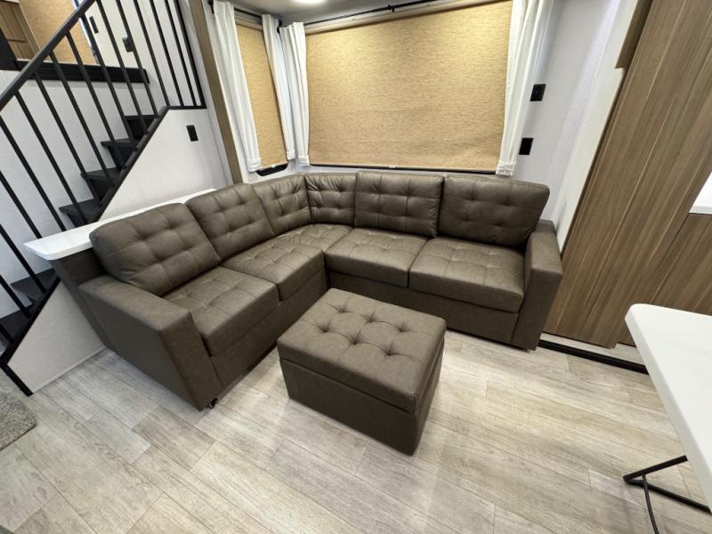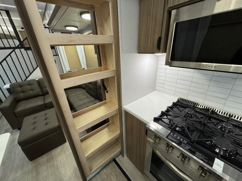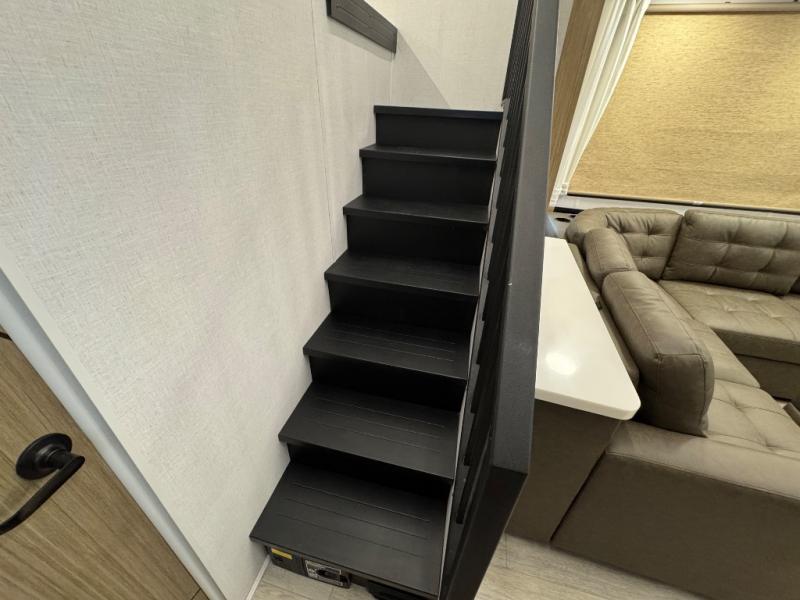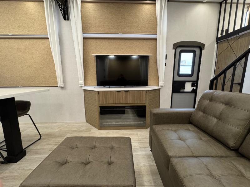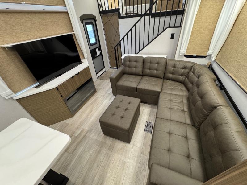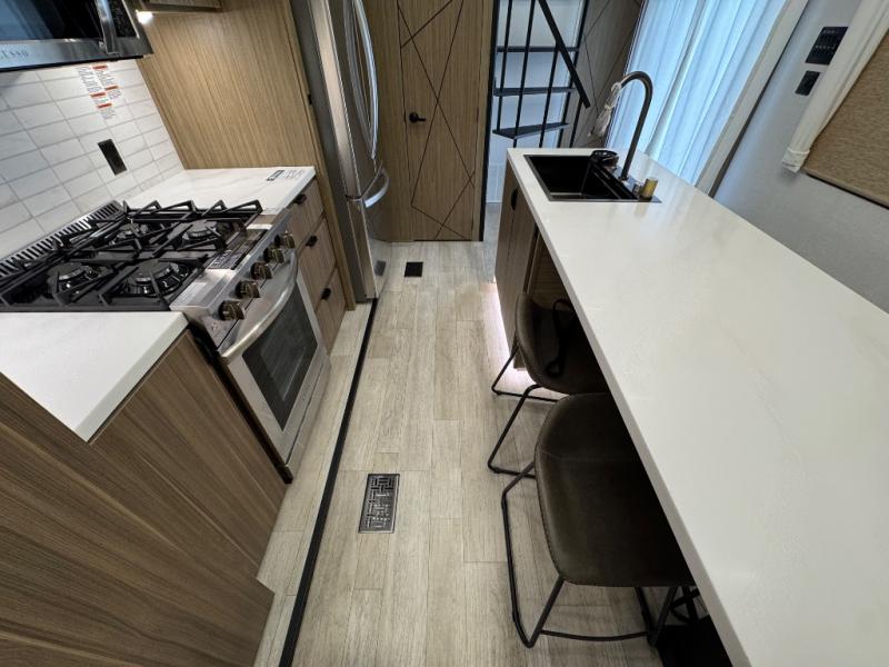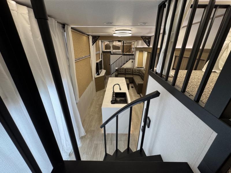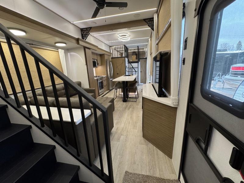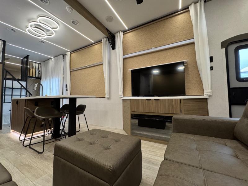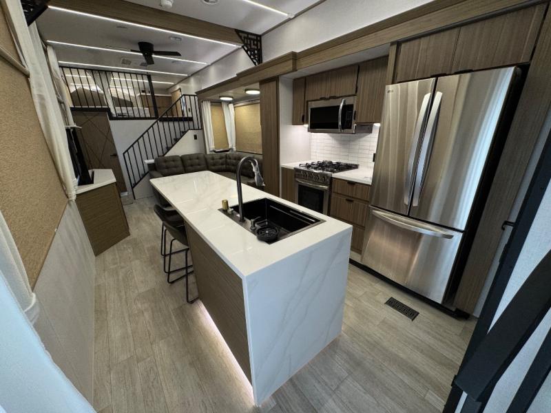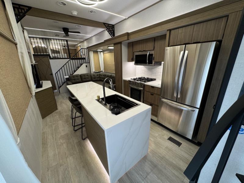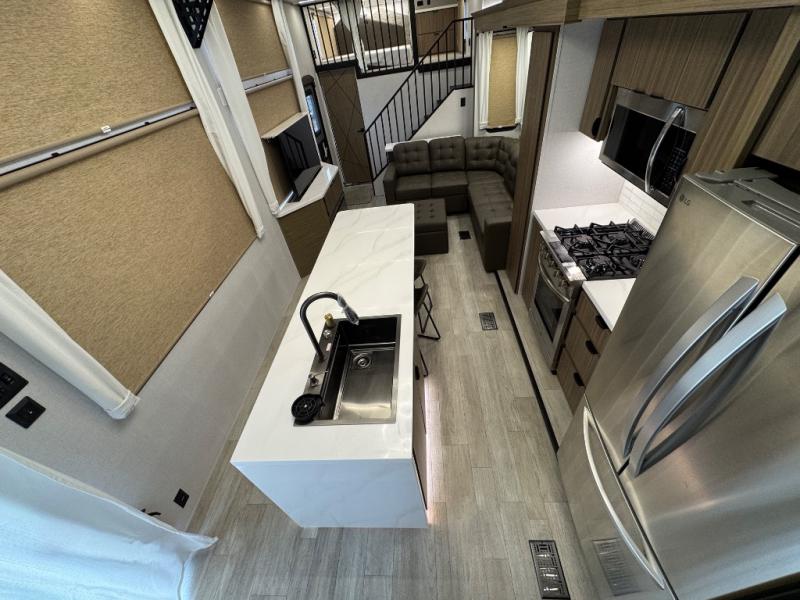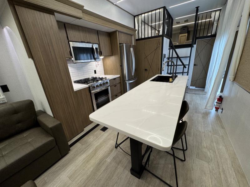 You will feel like you are home when you step inside! Not only will you be impressed with the super large slide in the main combined kitchen and living area, but check out the island with four counter height seats! The main entry closest to the front features a private bedroom with a custom king bed with Versa-Tilt within a slide, plus a fireplace and a dresser for your belongings. Just outside this door is a spiral staircase to the front loft with two 42" x 74" bunk mats above. The kitchen is fully equipped for you to provide the best home cooked meals with a pull-out pantry, range and microwave, plus side-by-side refrigerator. There is also a half bath off of the kitchen for added convenience! An L-shaped sectional sofa with an ottoman provides a cozy space to relax, and there is an entertainment center with a fireplace for a relaxing evenings indoors. A full rear bath features a spacious walk-in shower, a linen closet plus washer and dryer prep for the option to make laundry day easier. And the second loft with stairs is above the bath for even more sleeping space!