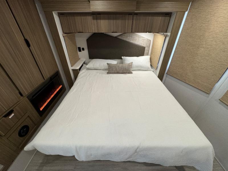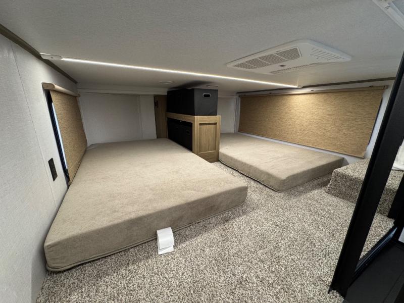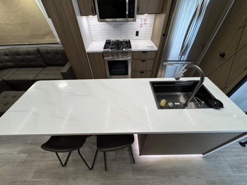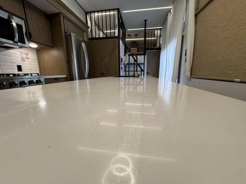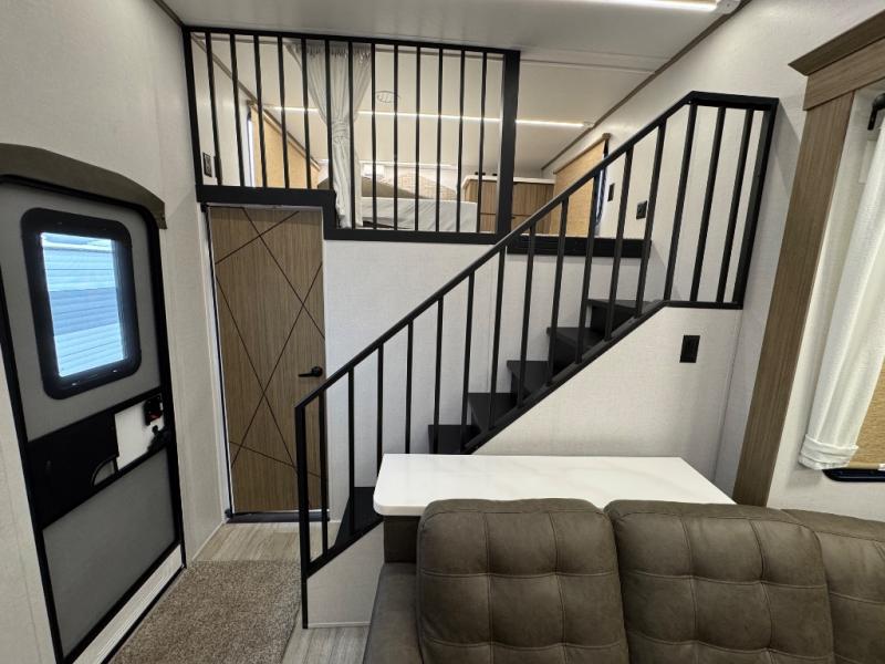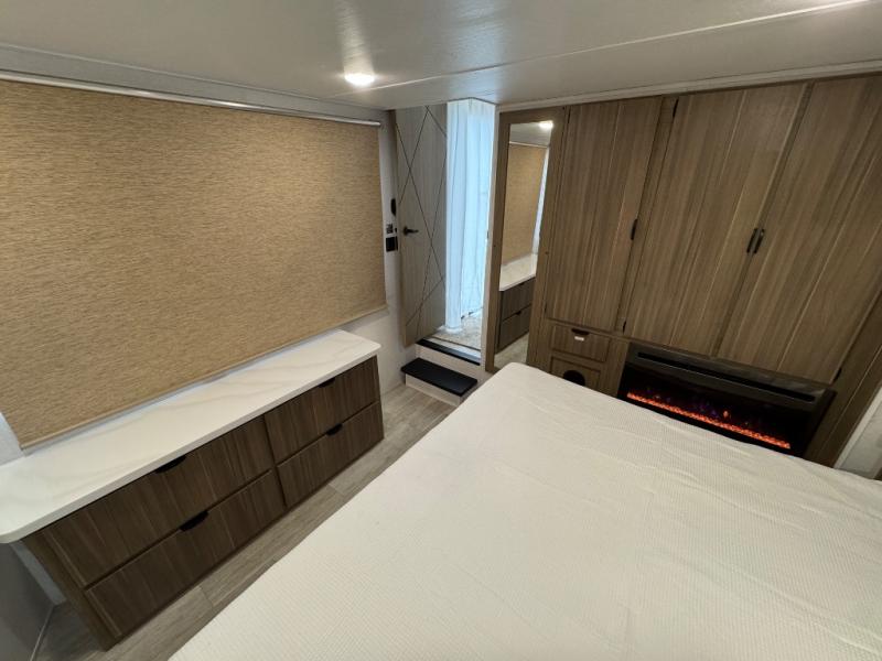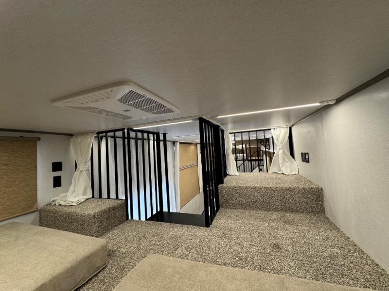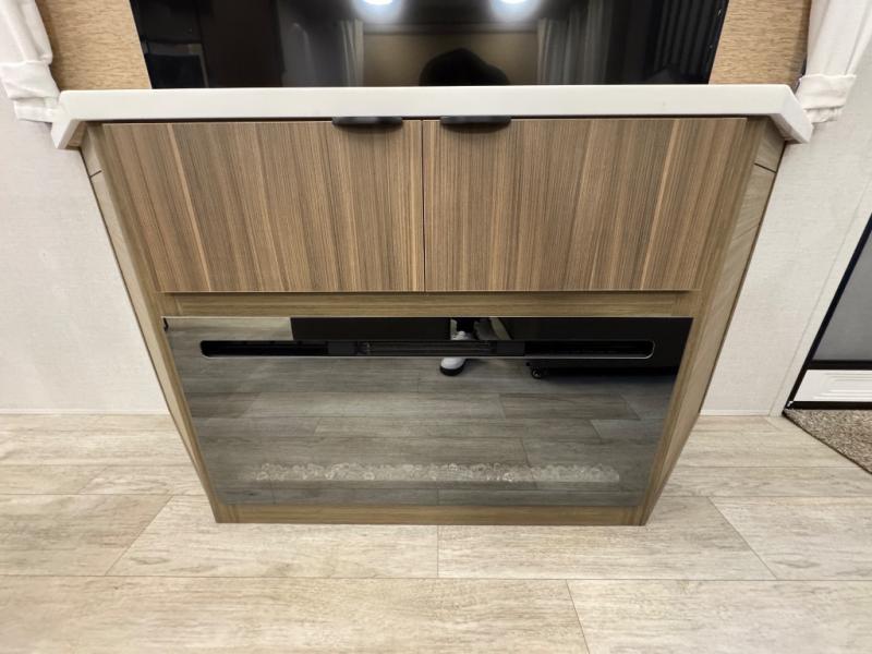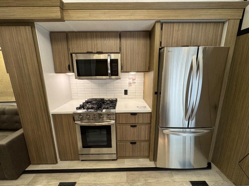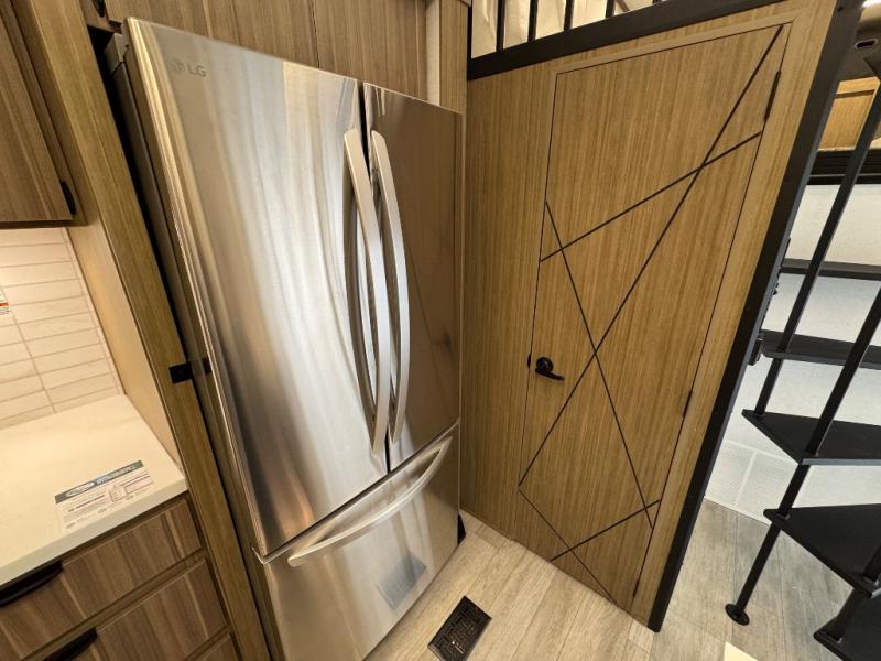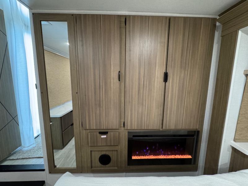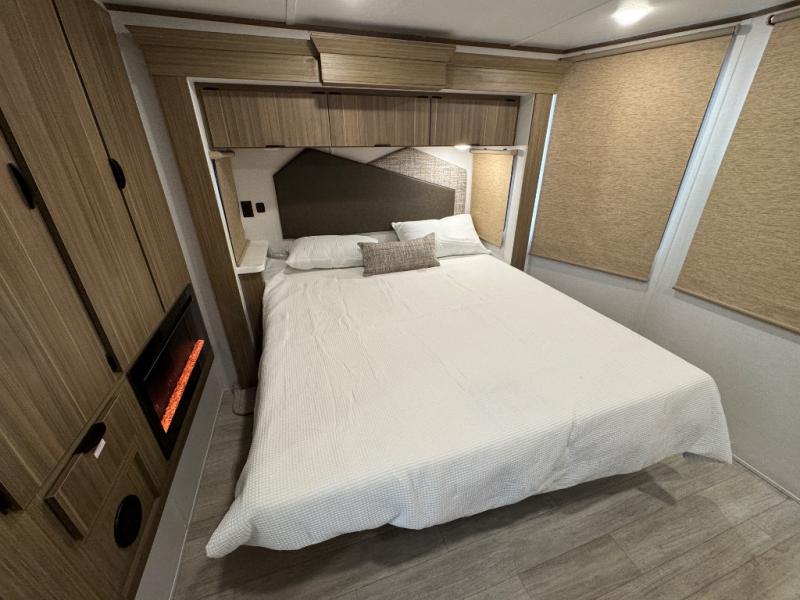 You will feel like you are home when you step inside! Not only will you be impressed with the super large slide in the main combined kitchen and living area, but check out the island with four counter height seats! The main entry closest to the front features a private bedroom with a custom king bed with Versa-Tilt within a slide, plus a fireplace and a dresser for your belongings. Just outside this door is a spiral staircase to the front loft with two 42" x 74" bunk mats above. The kitchen is fully equipped for you to provide the best home cooked meals with a pull-out pantry, range and microwave, plus side-by-side refrigerator. There is also a half bath off of the kitchen for added convenience! An L-shaped sectional sofa with an ottoman provides a cozy space to relax, and there is an entertainment center with a fireplace for a relaxing evenings indoors. A full rear bath features a spacious walk-in shower, a linen closet plus washer and dryer prep for the option to make laundry day easier. And the second loft with stairs is above the bath for even more sleeping space!
