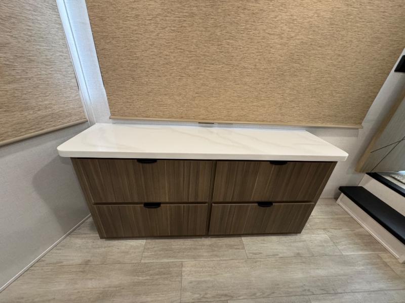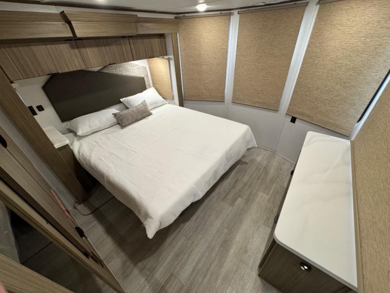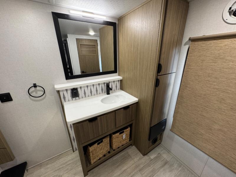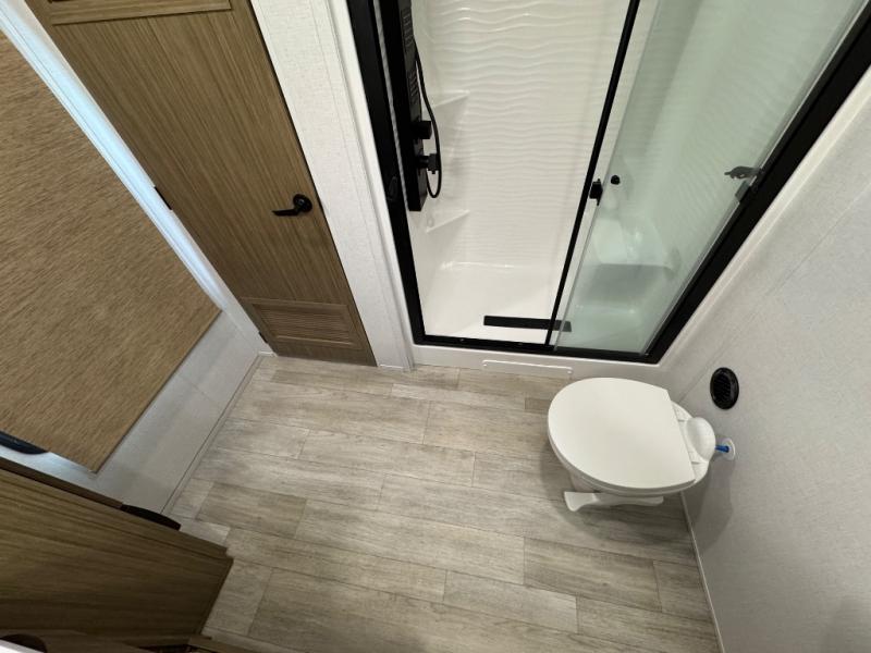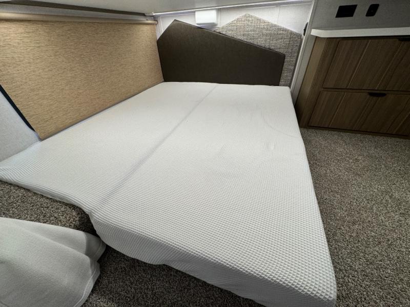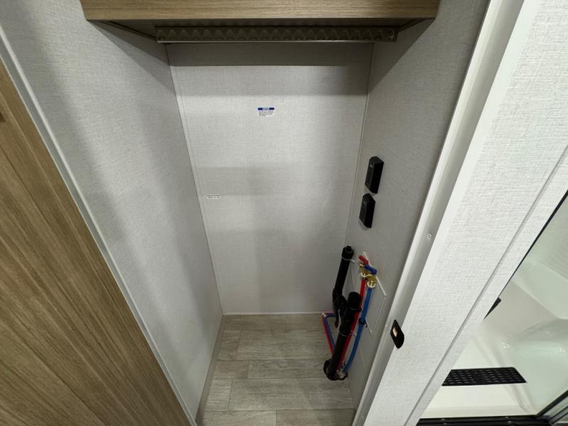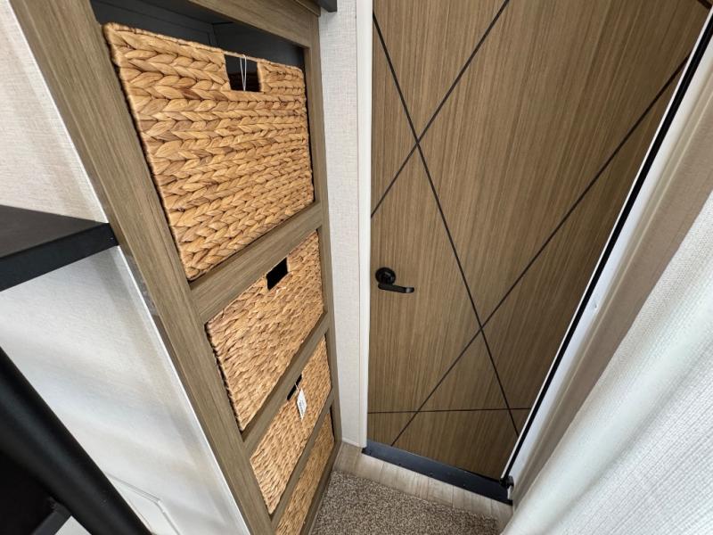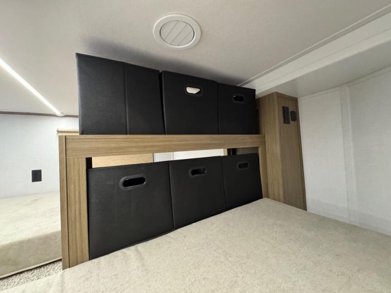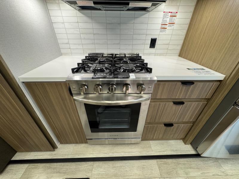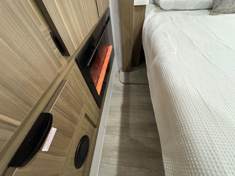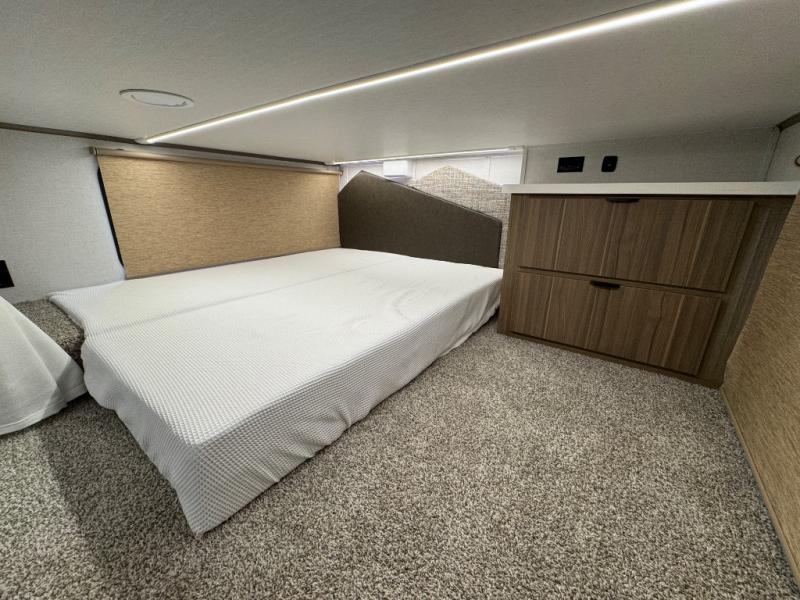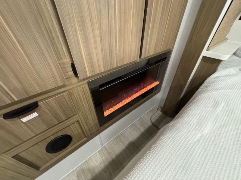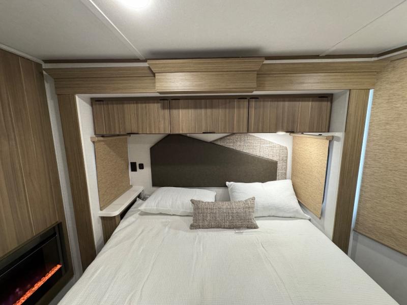 You will feel like you are home when you step inside! Not only will you be impressed with the super large slide in the main combined kitchen and living area, but check out the island with four counter height seats! The main entry closest to the front features a private bedroom with a custom king bed with Versa-Tilt within a slide, plus a fireplace and a dresser for your belongings. Just outside this door is a spiral staircase to the front loft with two 42" x 74" bunk mats above. The kitchen is fully equipped for you to provide the best home cooked meals with a pull-out pantry, range and microwave, plus side-by-side refrigerator. There is also a half bath off of the kitchen for added convenience! An L-shaped sectional sofa with an ottoman provides a cozy space to relax, and there is an entertainment center with a fireplace for a relaxing evenings indoors. A full rear bath features a spacious walk-in shower, a linen closet plus washer and dryer prep for the option to make laundry day easier. And the second loft with stairs is above the bath for even more sleeping space!