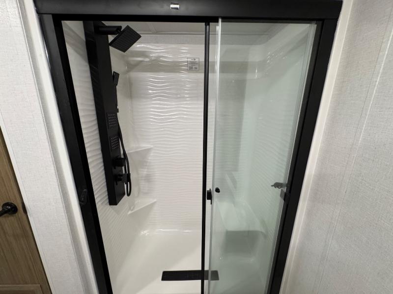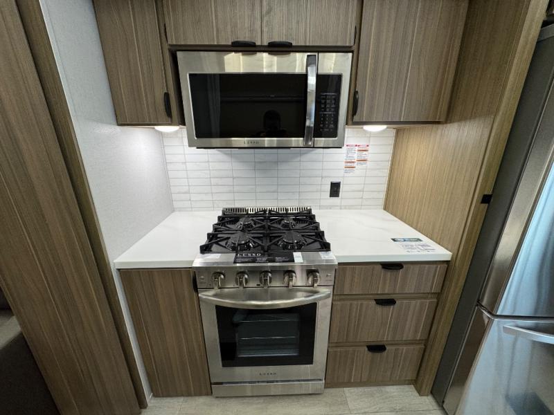 With any Wildwood Grand Lodge destination trailer by Forest River, you can enjoy extended stays wherever you go! There is 4K awning blade lighting outside, along with slide out awning toppers, plus a heated and enclosed Accessibelly for added protection. Inside, you'll love the stylish backsplash update, elegant curtain rods and curtains, TFL black walnut entertainment shelves, and stainless steel kitchen appliances. A Serta mattress in the bedroom(s) will provide comfort to each journey, and there is a tankless water heater for hot water when you need it.