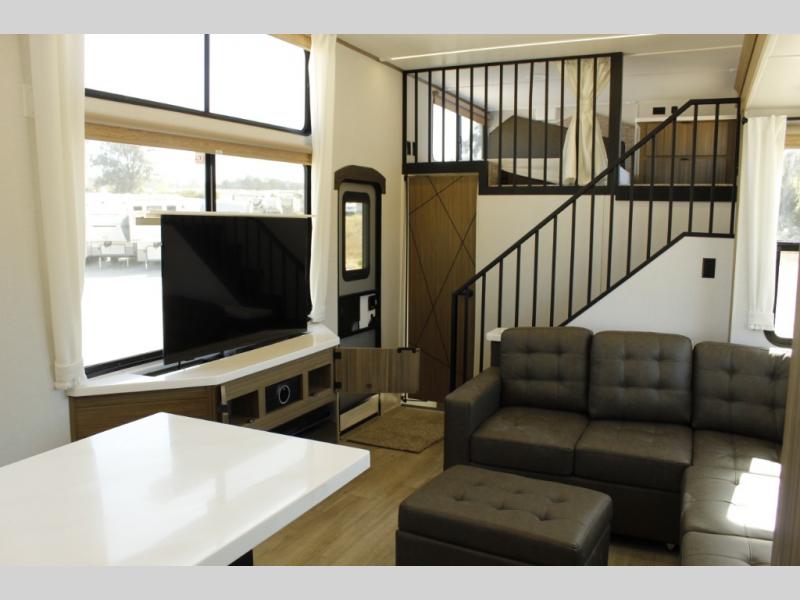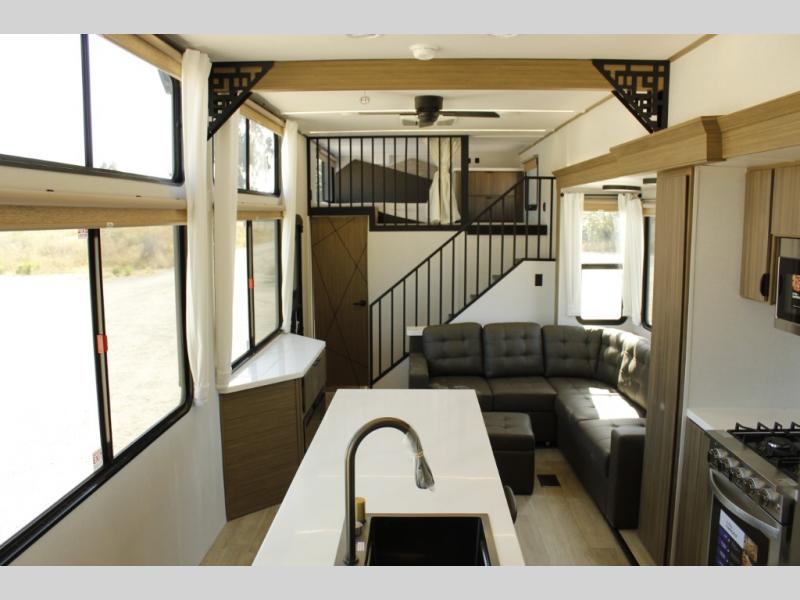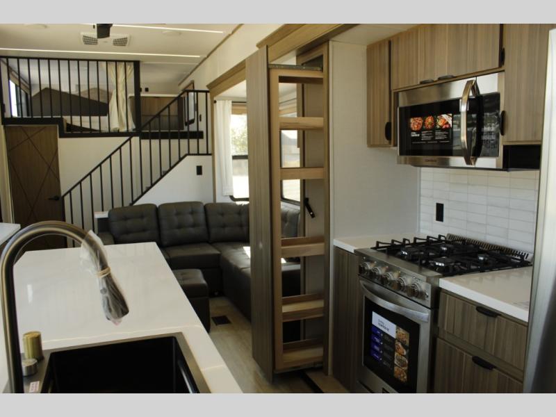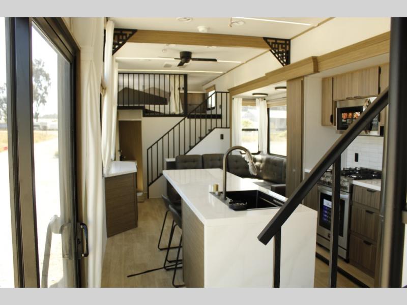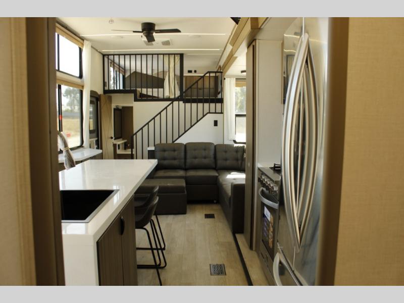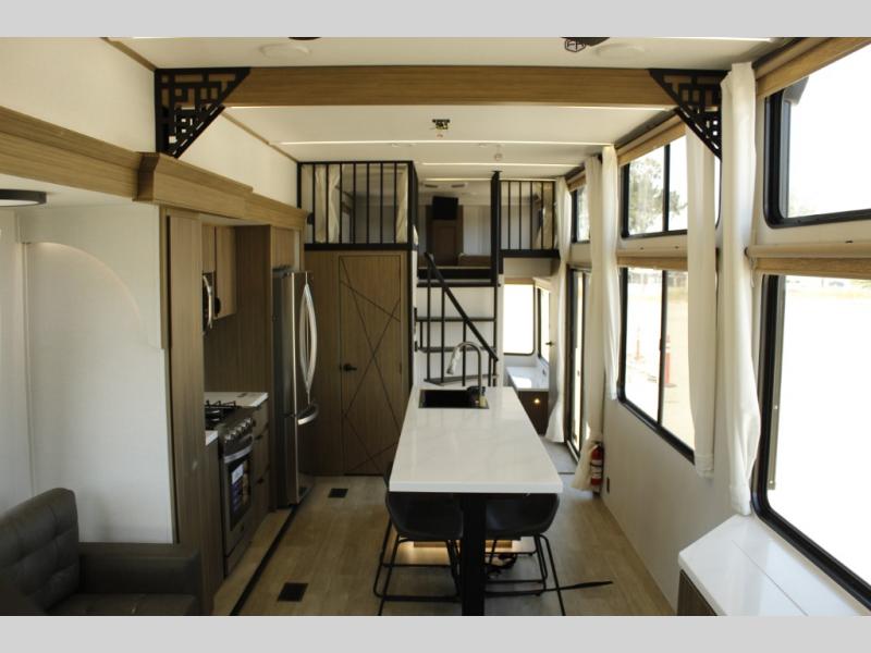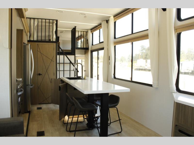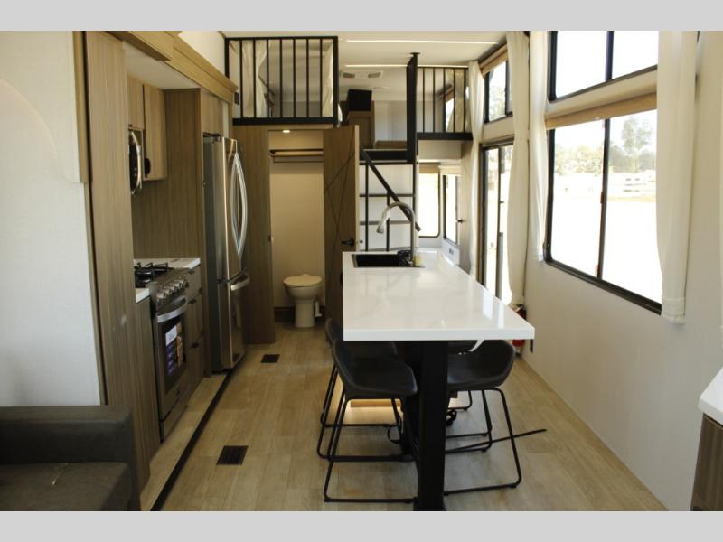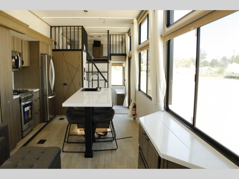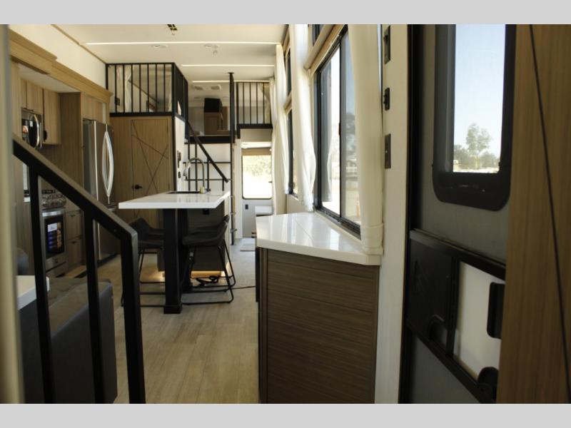 You will feel like you are home when you step inside! Not only will you be impressed with the super large slide in the main combined kitchen and living area, but check out the island with four counter height seats! The main entry closest to the front features a private bedroom with a custom king bed with Versa-Tilt within a slide, plus a fireplace and a dresser for your belongings. Just outside this door is a spiral staircase to the front loft with two 42" x 74" bunk mats above. The kitchen is fully equipped for you to provide the best home cooked meals with a pull-out pantry, range and microwave, plus side-by-side refrigerator. There is also a half bath off of the kitchen for added convenience! An L-shaped sectional sofa with an ottoman provides a cozy space to relax, and there is an entertainment center with a fireplace for a relaxing evenings indoors. A full rear bath features a spacious walk-in shower, a linen closet plus washer and dryer prep for the option to make laundry day easier. And the second loft with stairs is above the bath for even more sleeping space!