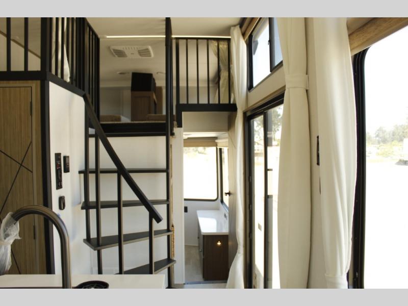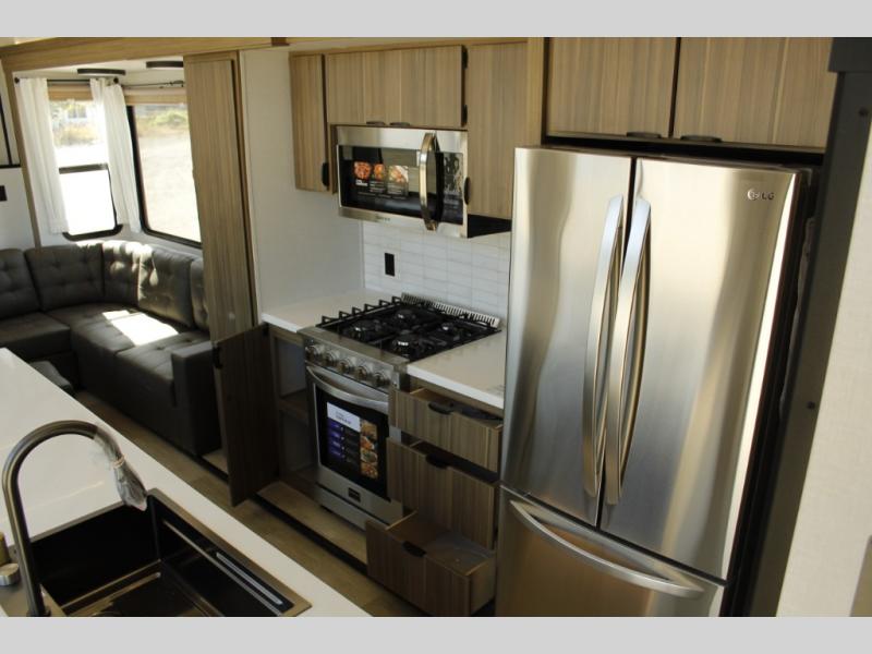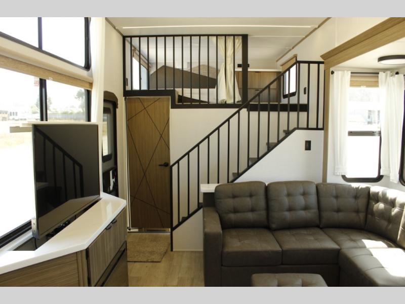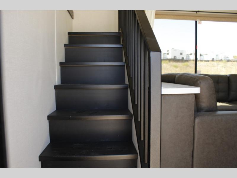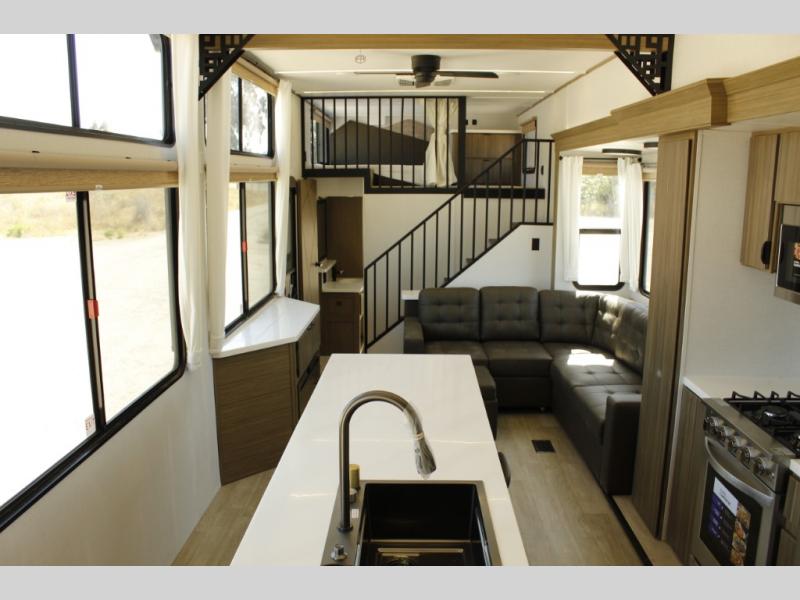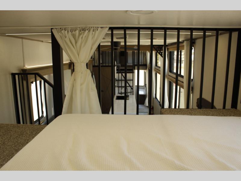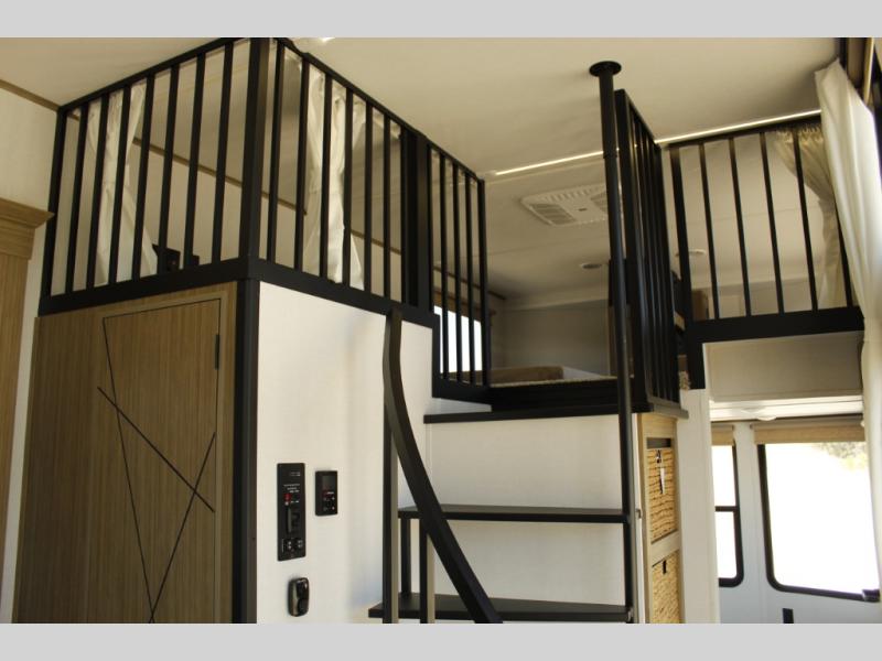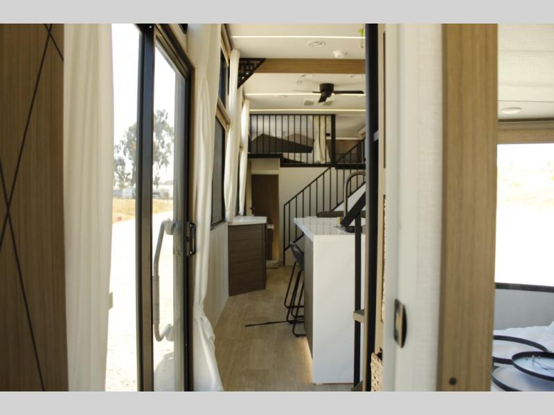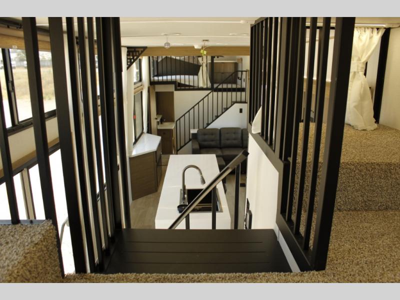 You will feel like you are home when you step inside! Not only will you be impressed with the super large slide in the main combined kitchen and living area, but check out the island with four counter height seats! The main entry closest to the front features a private bedroom with a custom king bed with Versa-Tilt within a slide, plus a fireplace and a dresser for your belongings. Just outside this door is a spiral staircase to the front loft with two 42" x 74" bunk mats above. The kitchen is fully equipped for you to provide the best home cooked meals with a pull-out pantry, range and microwave, plus side-by-side refrigerator. There is also a half bath off of the kitchen for added convenience! An L-shaped sectional sofa with an ottoman provides a cozy space to relax, and there is an entertainment center with a fireplace for a relaxing evenings indoors. A full rear bath features a spacious walk-in shower, a linen closet plus washer and dryer prep for the option to make laundry day easier. And the second loft with stairs is above the bath for even more sleeping space!