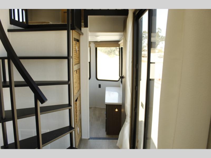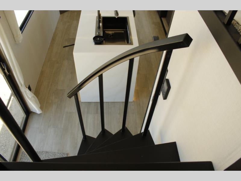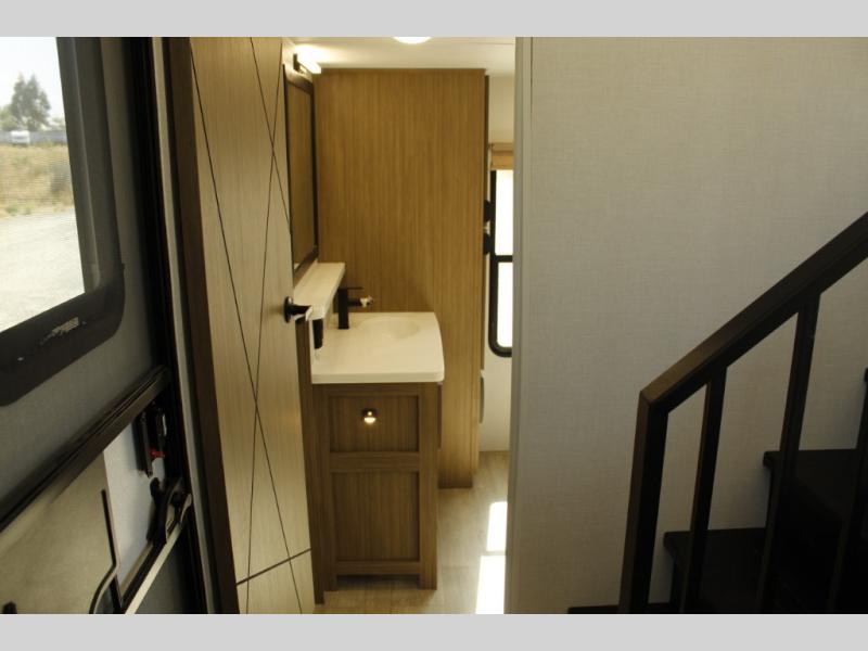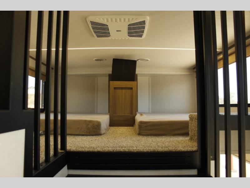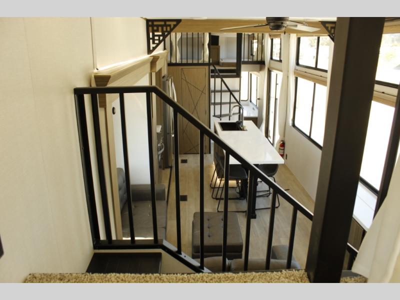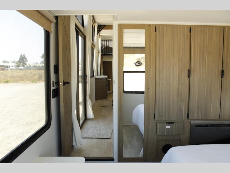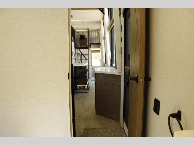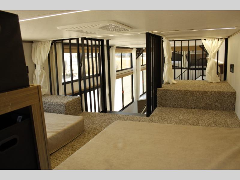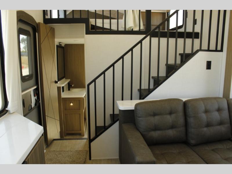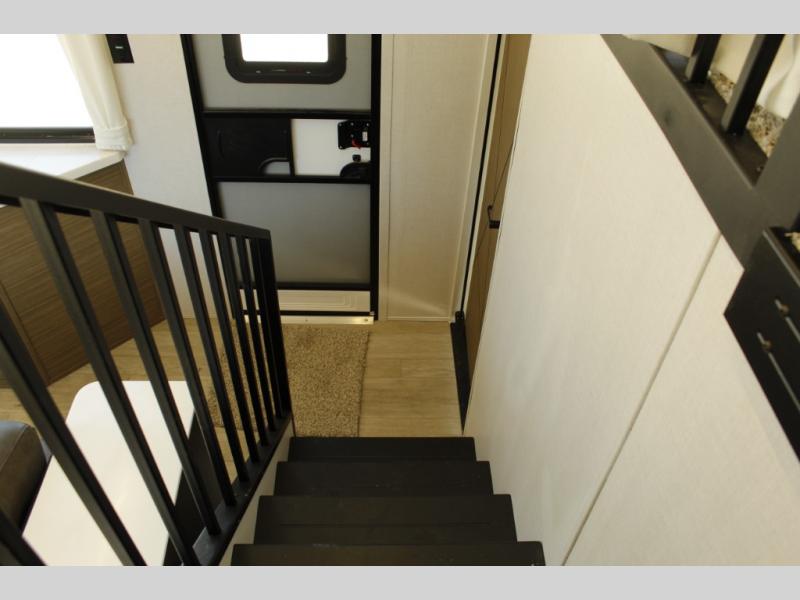 You will feel like you are home when you step inside! Not only will you be impressed with the super large slide in the main combined kitchen and living area, but check out the island with four counter height seats! The main entry closest to the front features a private bedroom with a custom king bed with Versa-Tilt within a slide, plus a fireplace and a dresser for your belongings. Just outside this door is a spiral staircase to the front loft with two 42" x 74" bunk mats above. The kitchen is fully equipped for you to provide the best home cooked meals with a pull-out pantry, range and microwave, plus side-by-side refrigerator. There is also a half bath off of the kitchen for added convenience! An L-shaped sectional sofa with an ottoman provides a cozy space to relax, and there is an entertainment center with a fireplace for a relaxing evenings indoors. A full rear bath features a spacious walk-in shower, a linen closet plus washer and dryer prep for the option to make laundry day easier. And the second loft with stairs is above the bath for even more sleeping space!