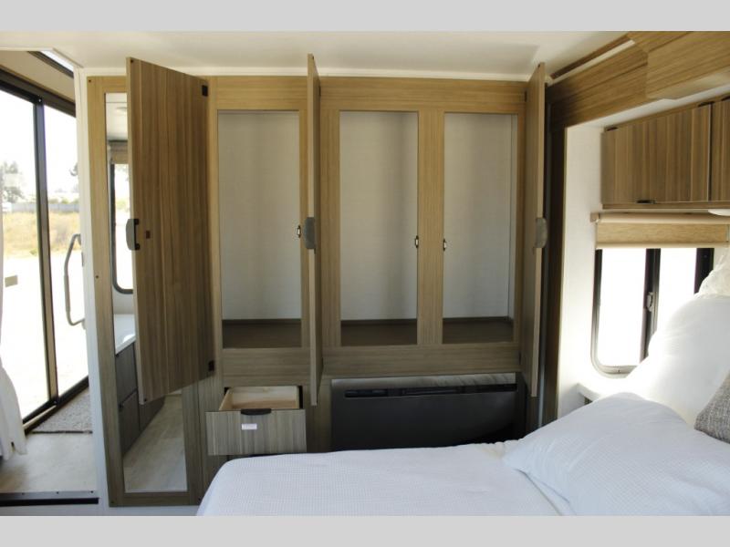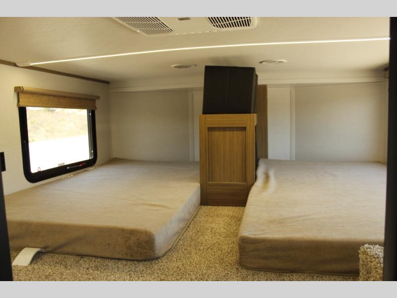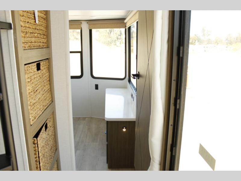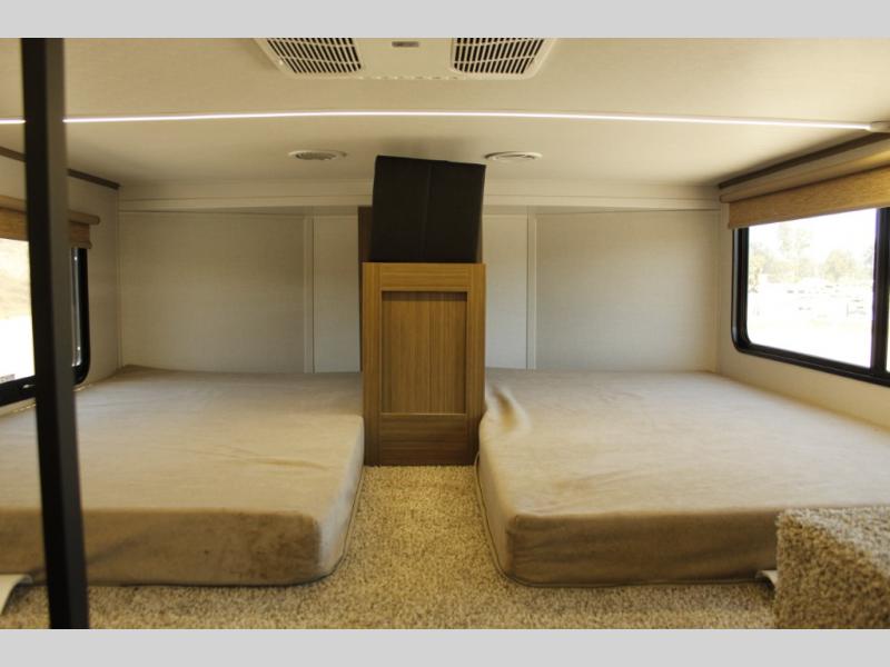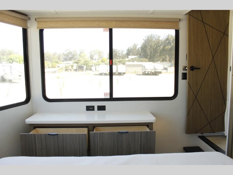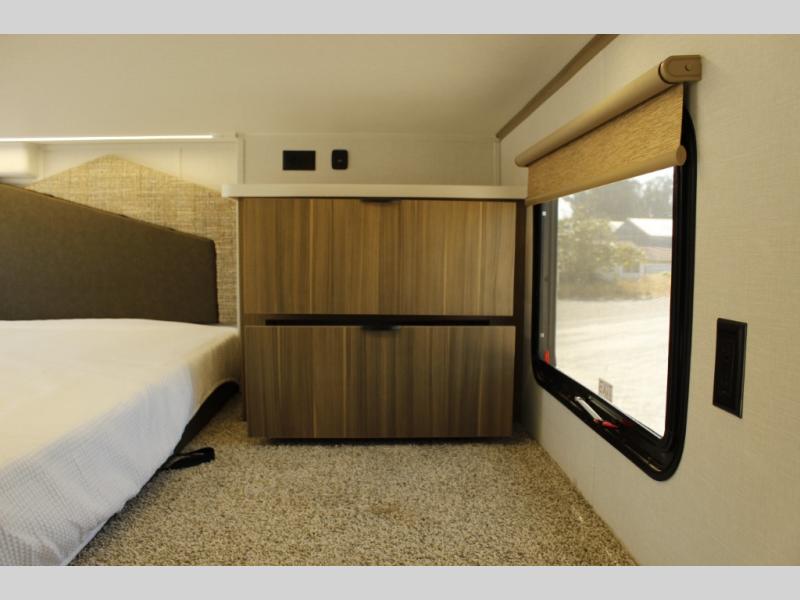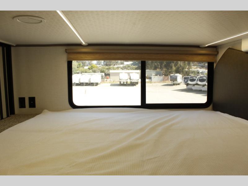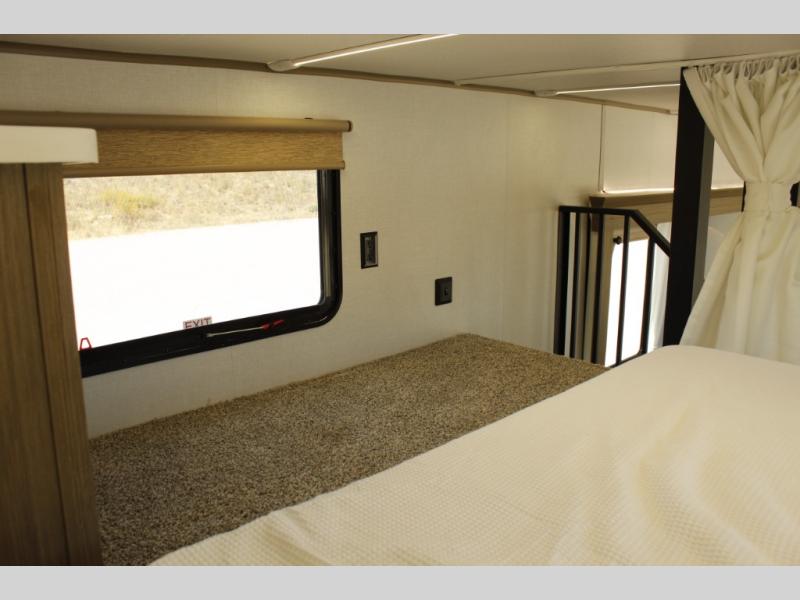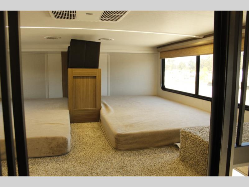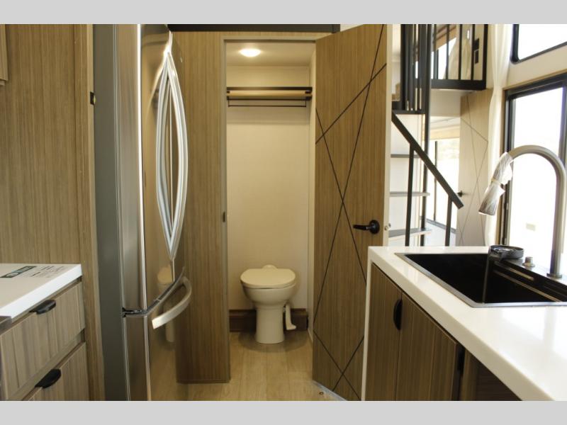 You will feel like you are home when you step inside! Not only will you be impressed with the super large slide in the main combined kitchen and living area, but check out the island with four counter height seats! The main entry closest to the front features a private bedroom with a custom king bed with Versa-Tilt within a slide, plus a fireplace and a dresser for your belongings. Just outside this door is a spiral staircase to the front loft with two 42" x 74" bunk mats above. The kitchen is fully equipped for you to provide the best home cooked meals with a pull-out pantry, range and microwave, plus side-by-side refrigerator. There is also a half bath off of the kitchen for added convenience! An L-shaped sectional sofa with an ottoman provides a cozy space to relax, and there is an entertainment center with a fireplace for a relaxing evenings indoors. A full rear bath features a spacious walk-in shower, a linen closet plus washer and dryer prep for the option to make laundry day easier. And the second loft with stairs is above the bath for even more sleeping space!