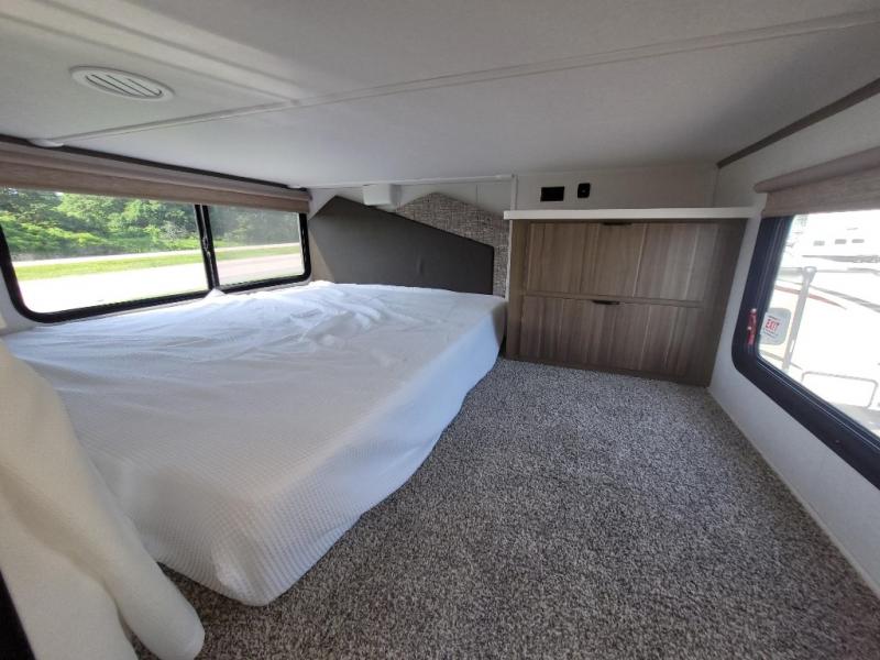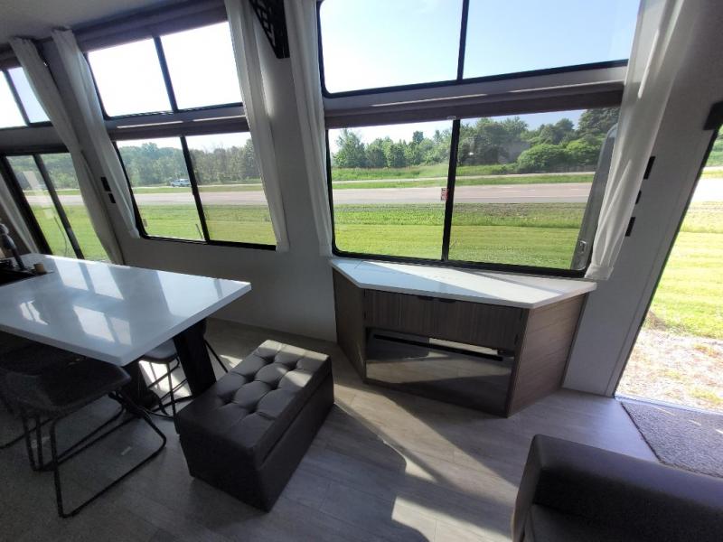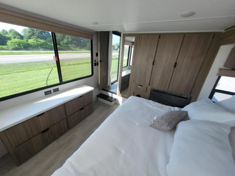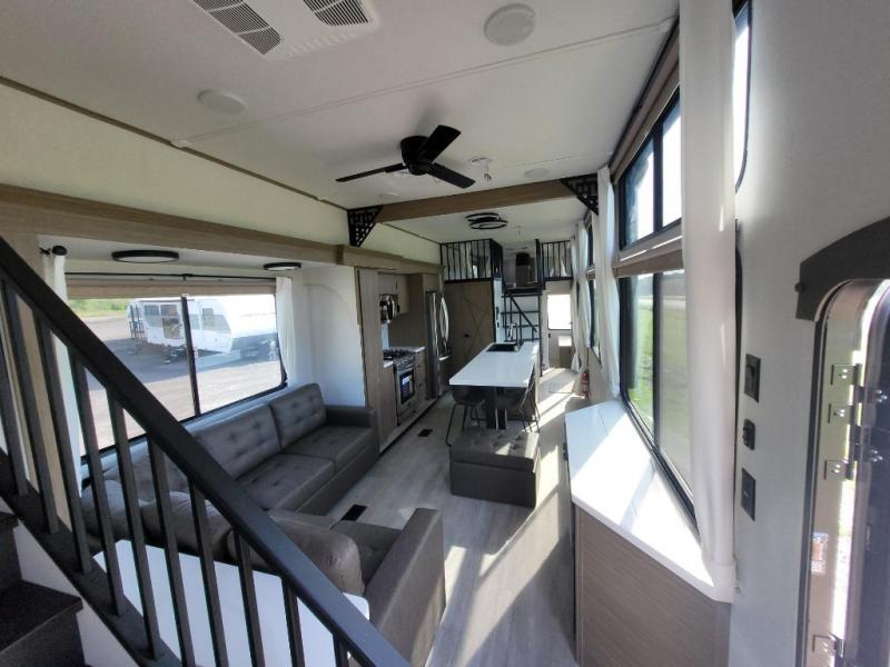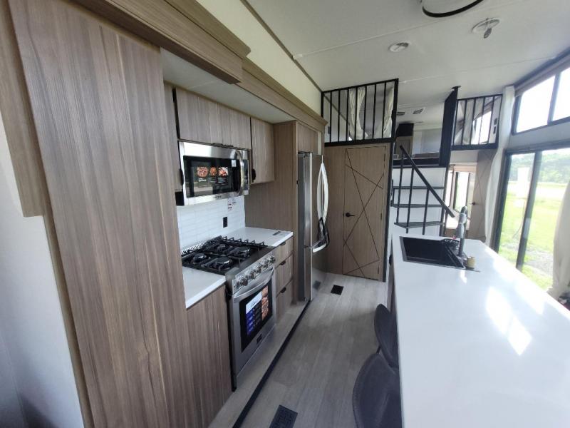 You will feel like you are home when you step inside! Not only will you be impressed with the super large slide in the main combined kitchen and living area, but check out the island with four counter height seats! The main entry closest to the front features a private bedroom with a custom king bed with Versa-Tilt within a slide, plus a fireplace and a dresser for your belongings. Just outside this door is a spiral staircase to the front loft with two 42" x 74" bunk mats above. The kitchen is fully equipped for you to provide the best home cooked meals with a pull-out pantry, range and microwave, plus side-by-side refrigerator. There is also a half bath off of the kitchen for added convenience! An L-shaped sectional sofa with an ottoman provides a cozy space to relax, and there is an entertainment center with a fireplace for a relaxing evenings indoors. A full rear bath features a spacious walk-in shower, a linen closet plus washer and dryer prep for the option to make laundry day easier. And the second loft with stairs is above the bath for even more sleeping space!