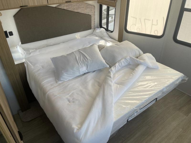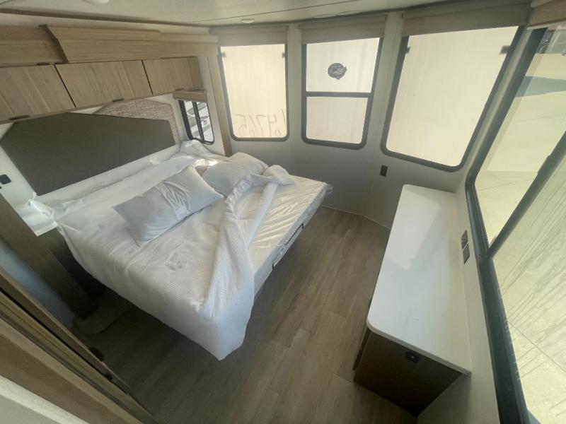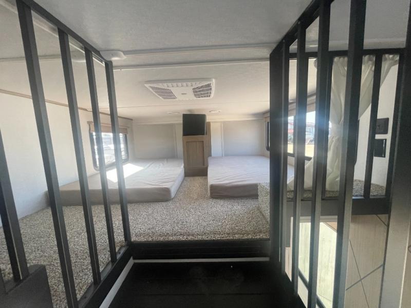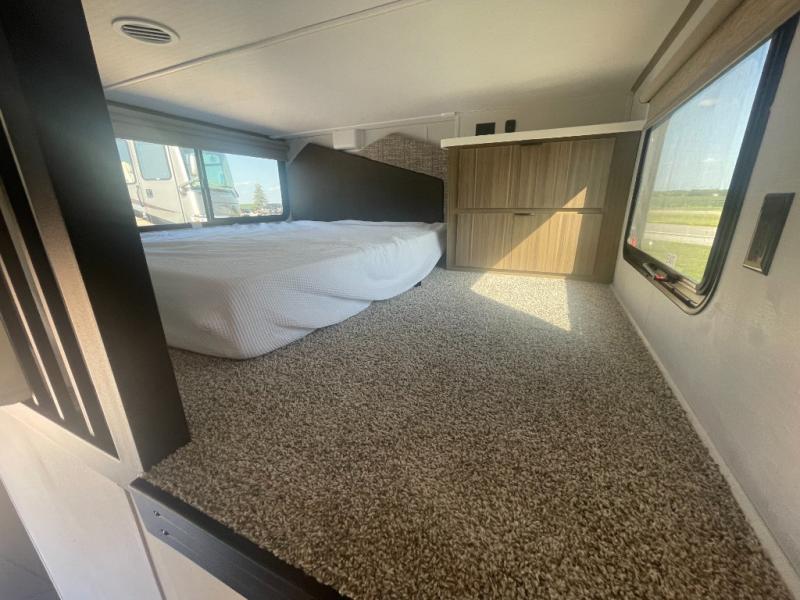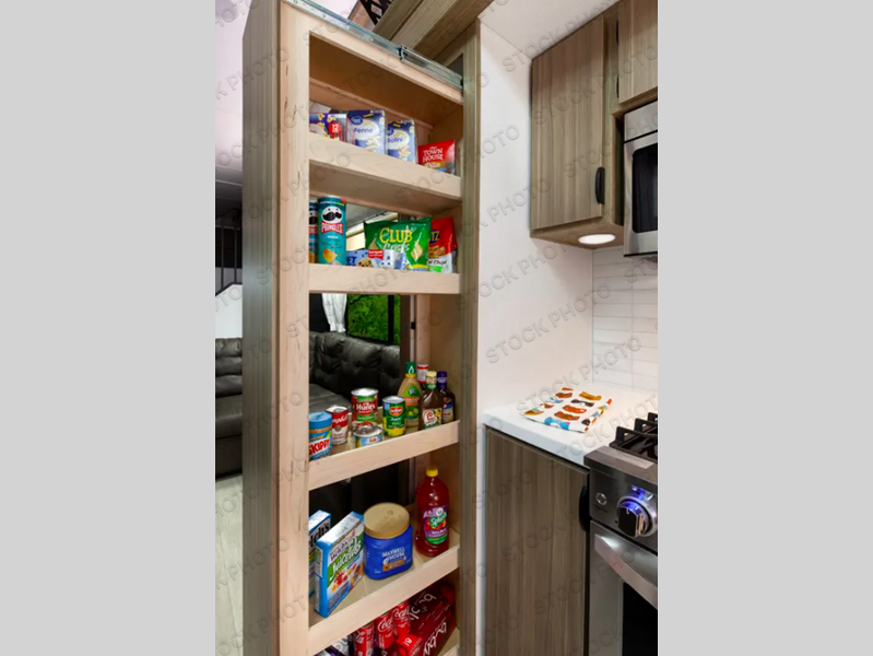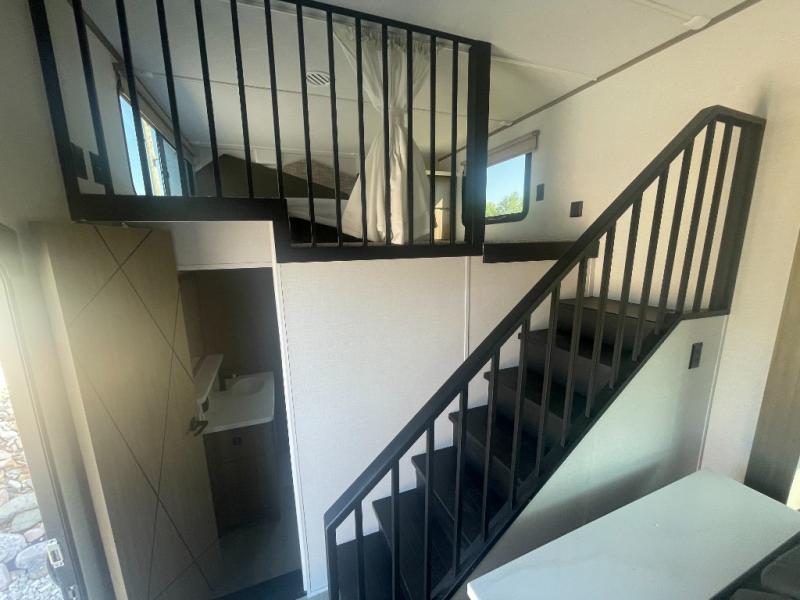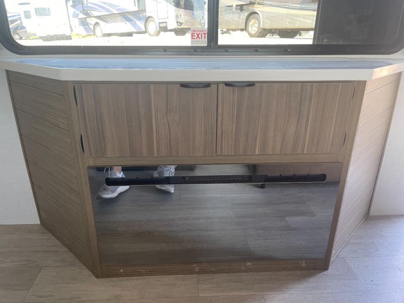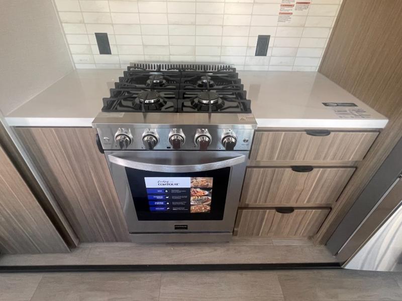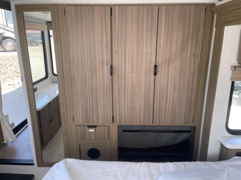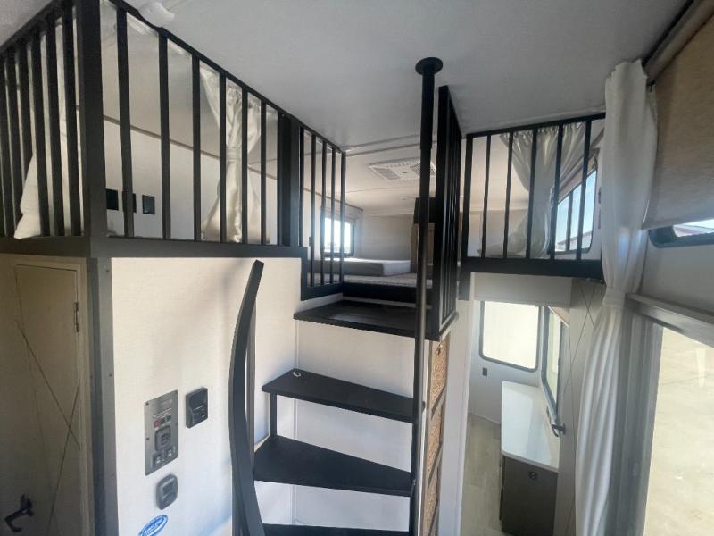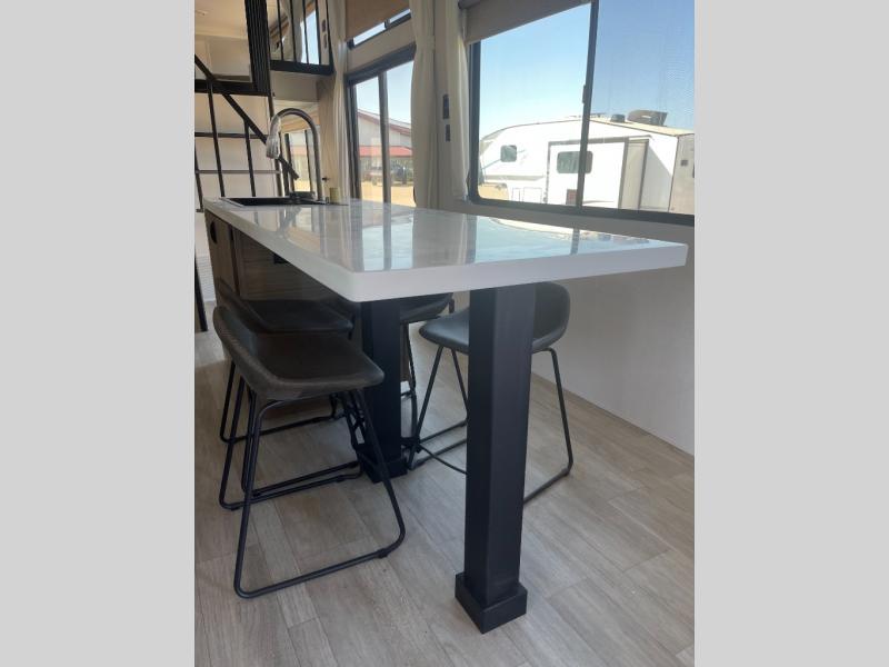 You will feel like you are home when you step inside! Not only will you be impressed with the super large slide in the main combined kitchen and living area, but check out the island with four counter height seats! The main entry closest to the front features a private bedroom with a custom king bed with Versa-Tilt within a slide, plus a fireplace and a dresser for your belongings. Just outside this door is a spiral staircase to the front loft with two 42" x 74" bunk mats above. The kitchen is fully equipped for you to provide the best home cooked meals with a pull-out pantry, range and microwave, plus side-by-side refrigerator. There is also a half bath off of the kitchen for added convenience! An L-shaped sectional sofa with an ottoman provides a cozy space to relax, and there is an entertainment center with a fireplace for a relaxing evenings indoors. A full rear bath features a spacious walk-in shower, a linen closet plus washer and dryer prep for the option to make laundry day easier. And the second loft with stairs is above the bath for even more sleeping space!