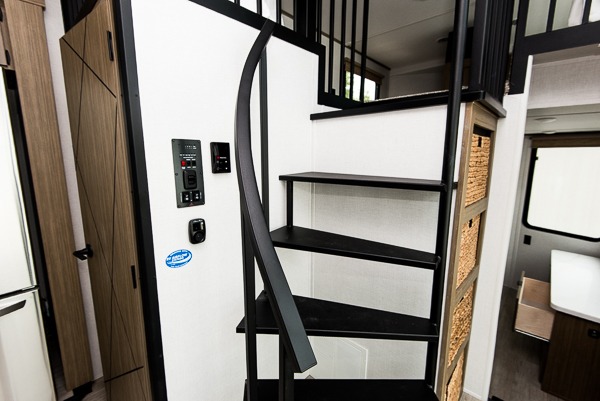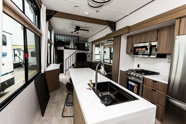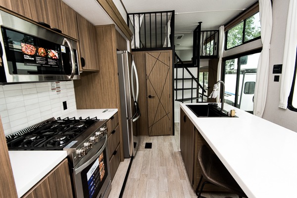 You will feel like you are home when you step inside! Not only will you be impressed with the super large slide in the main combined kitchen and living area, but check out the island with four counter height seats! The main entry closest to the front features a private bedroom with a custom king bed with Versa-Tilt within a slide, plus a fireplace and a dresser for your belongings. Just outside this door is a spiral staircase to the front loft with two 42" x 74" bunk mats above. The kitchen is fully equipped for you to provide the best home cooked meals with a pull-out pantry, range and microwave, plus side-by-side refrigerator. There is also a half bath off of the kitchen for added convenience! An L-shaped sectional sofa with an ottoman provides a cozy space to relax, and there is an entertainment center with a fireplace for a relaxing evenings indoors. A full rear bath features a spacious walk-in shower, a linen closet plus washer and dryer prep for the option to make laundry day easier. And the second loft with stairs is above the bath for even more sleeping space!