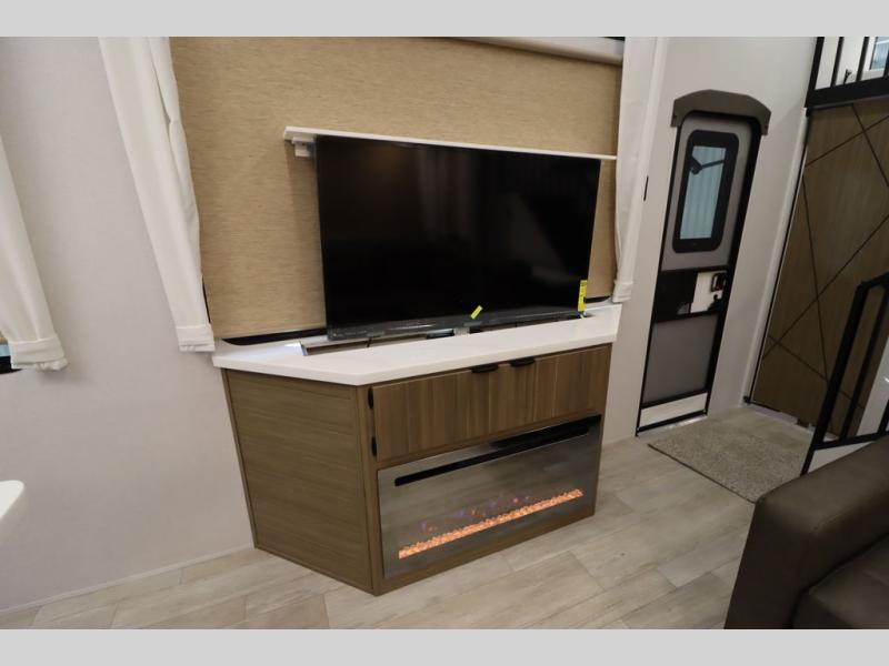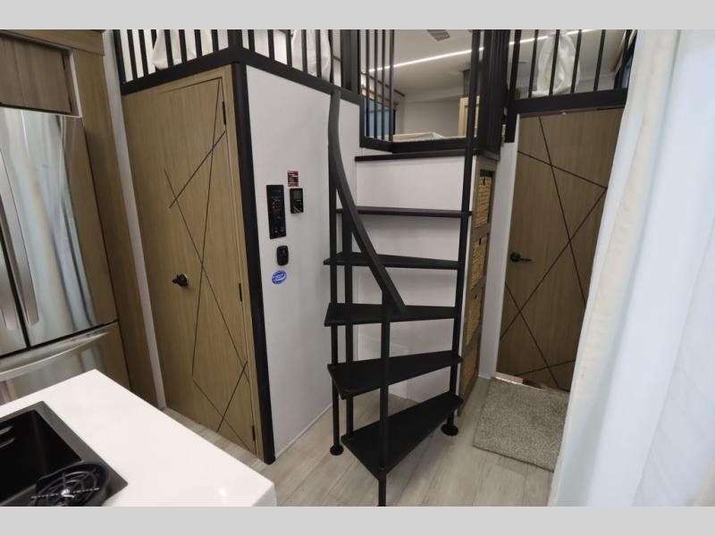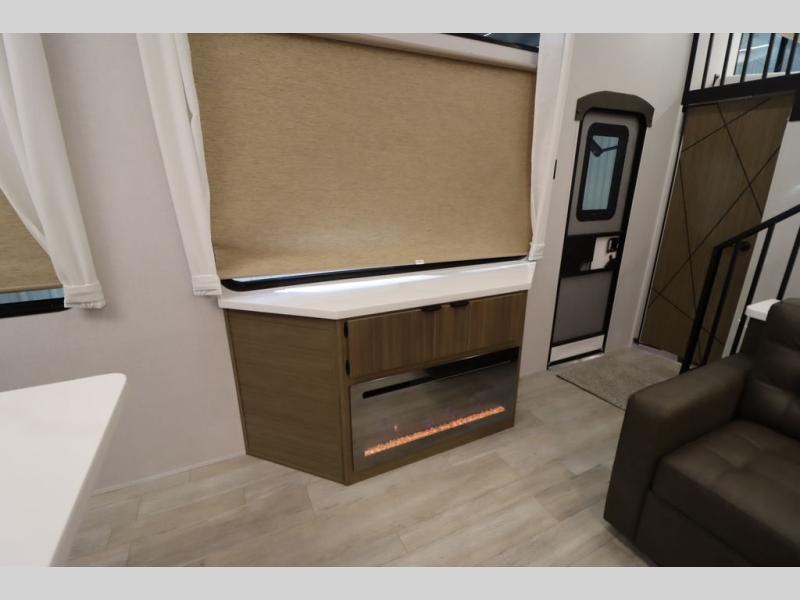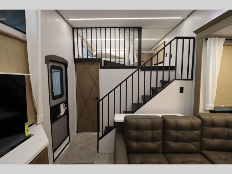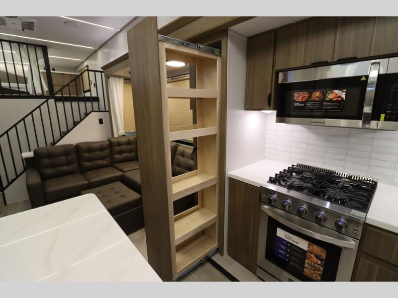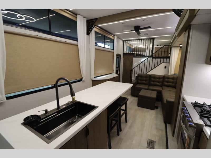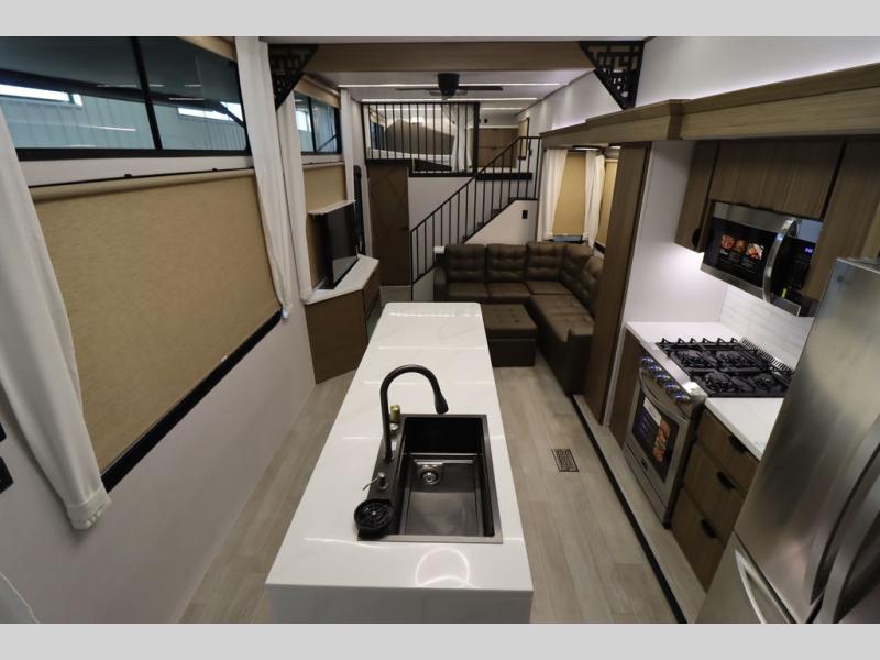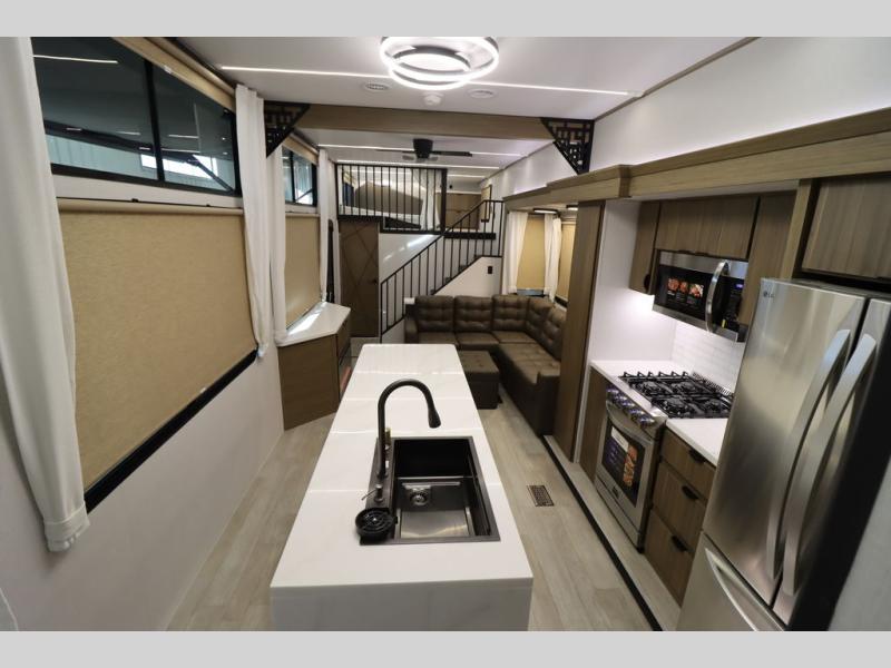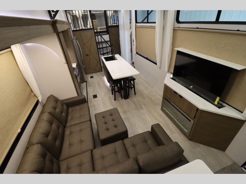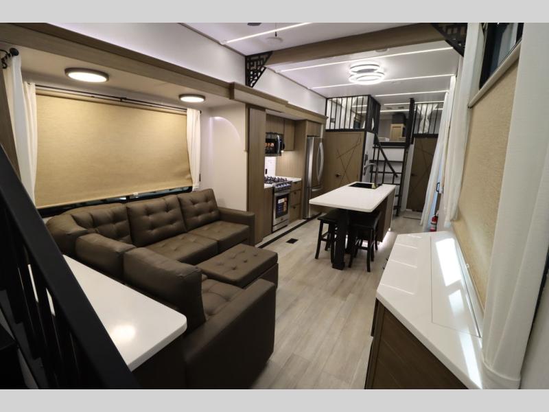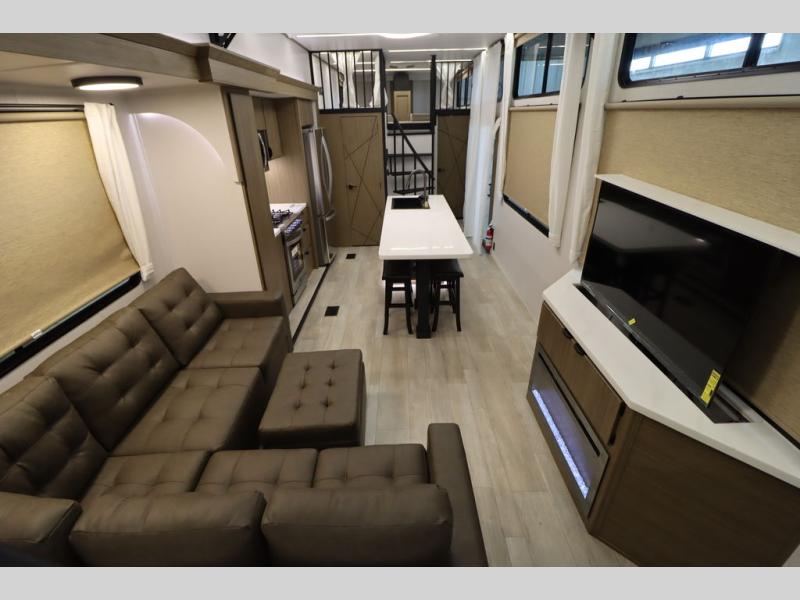 You will feel like you are home when you step inside! Not only will you be impressed with the super large slide in the main combined kitchen and living area, but check out the island with four counter height seats! The main entry closest to the front features a private bedroom with a custom king bed with Versa-Tilt within a slide, plus a fireplace and a dresser for your belongings. Just outside this door is a spiral staircase to the front loft with two 42" x 74" bunk mats above. The kitchen is fully equipped for you to provide the best home cooked meals with a pull-out pantry, range and microwave, plus side-by-side refrigerator. There is also a half bath off of the kitchen for added convenience! An L-shaped sectional sofa with an ottoman provides a cozy space to relax, and there is an entertainment center with a fireplace for a relaxing evenings indoors. A full rear bath features a spacious walk-in shower, a linen closet plus washer and dryer prep for the option to make laundry day easier. And the second loft with stairs is above the bath for even more sleeping space!