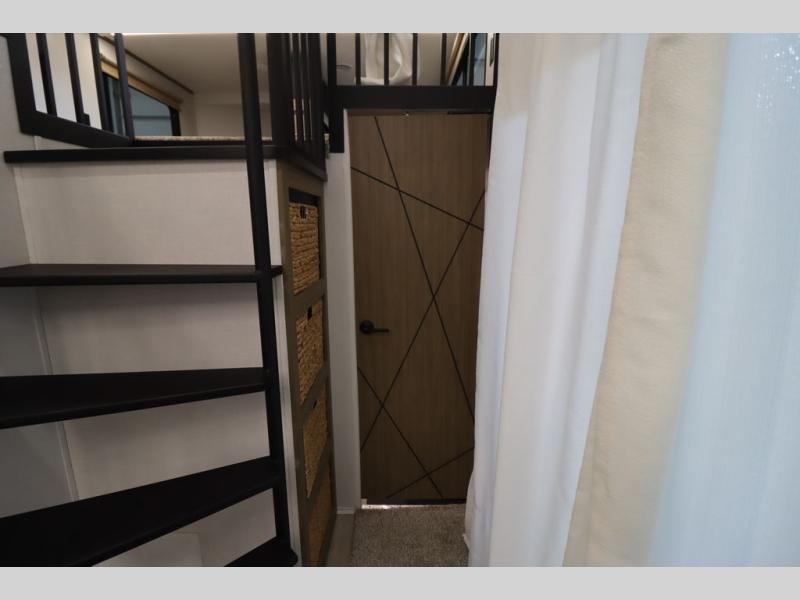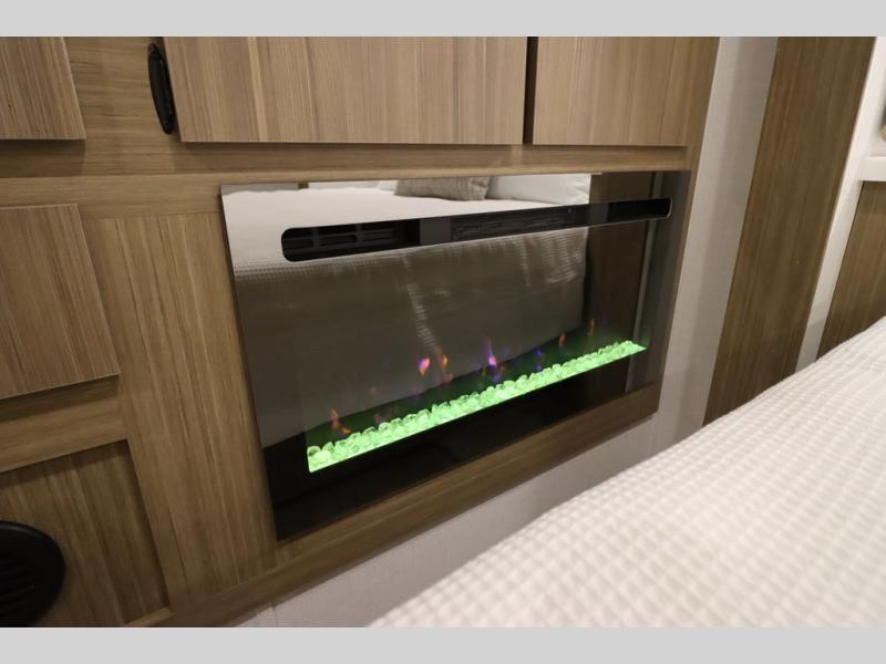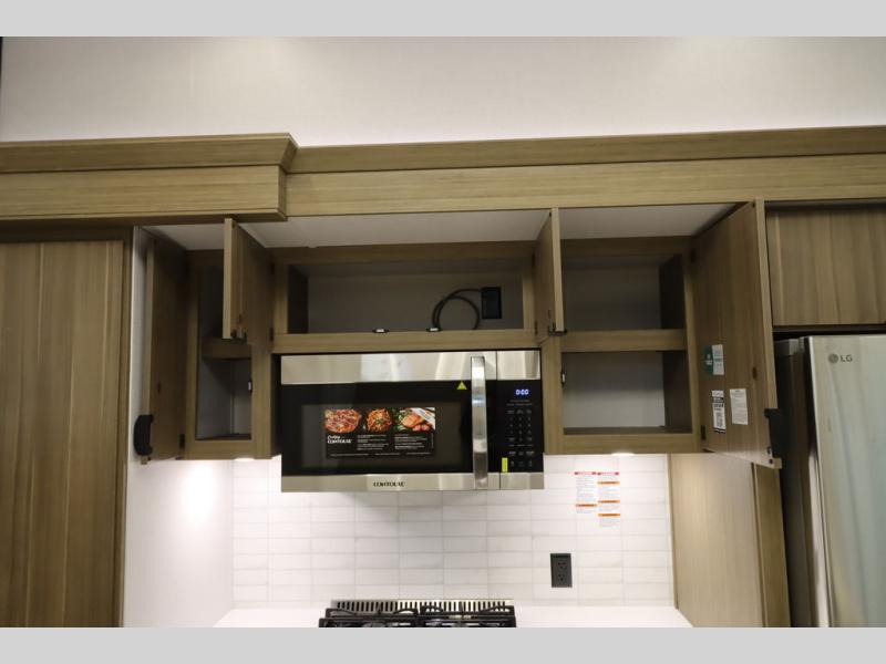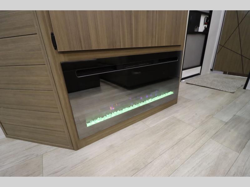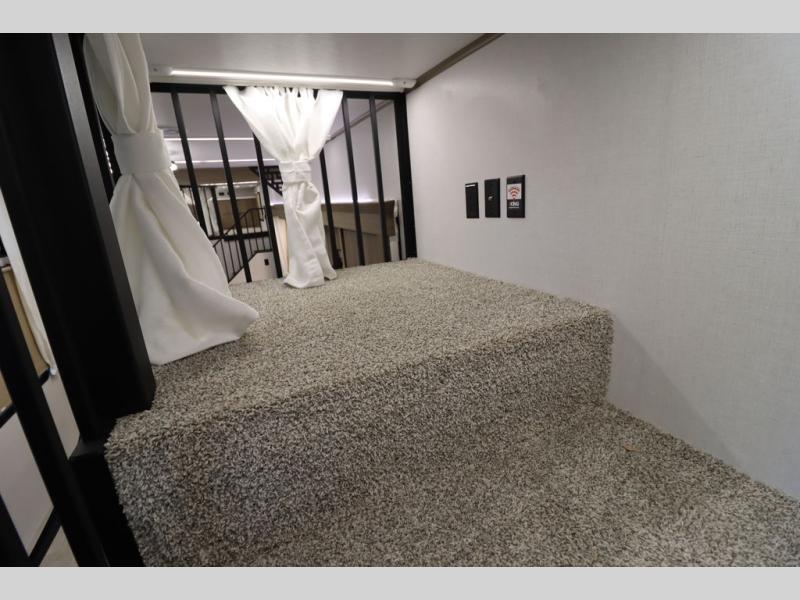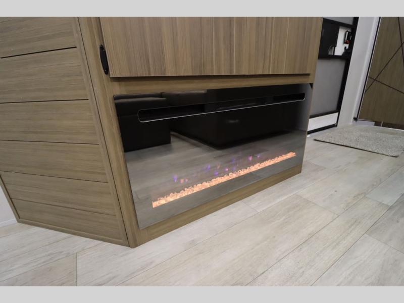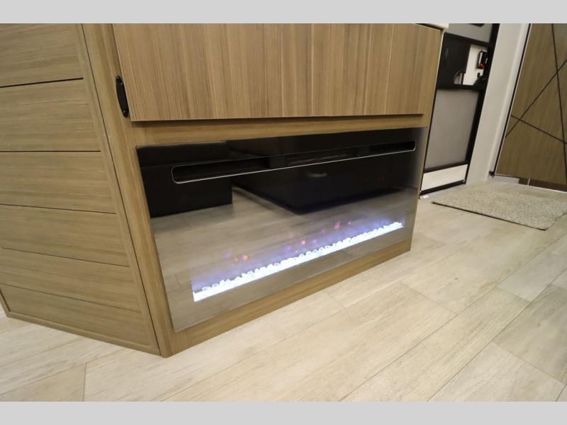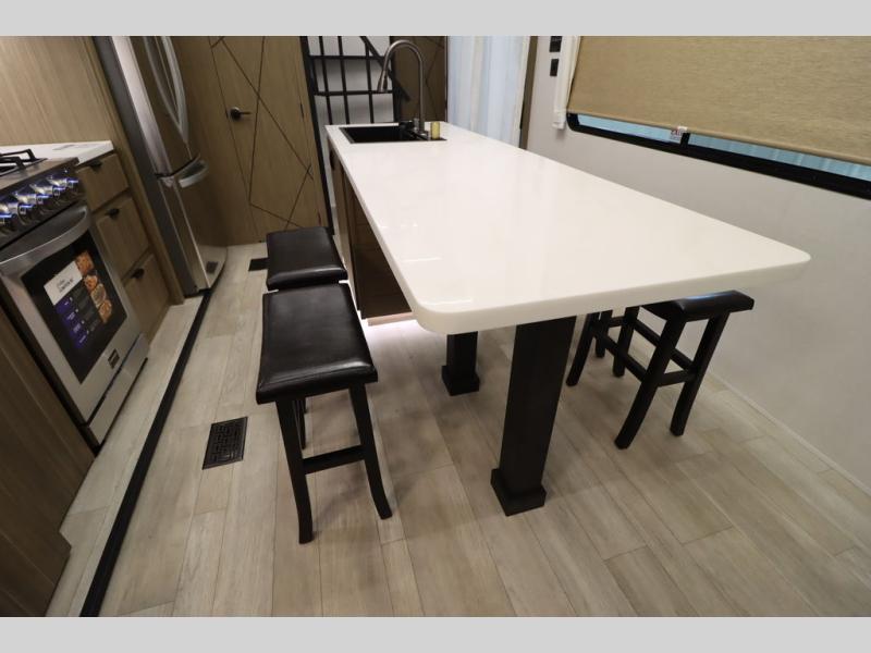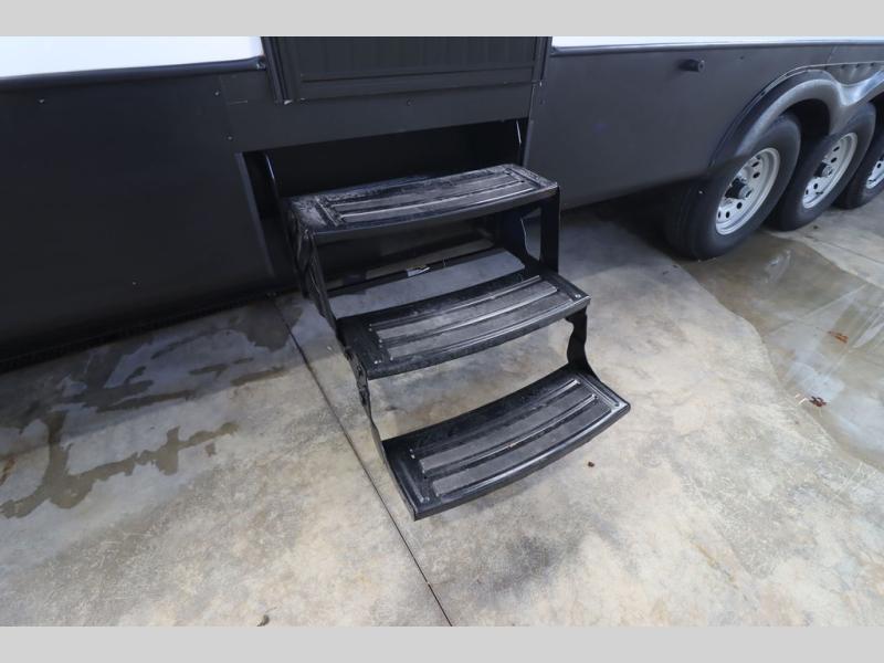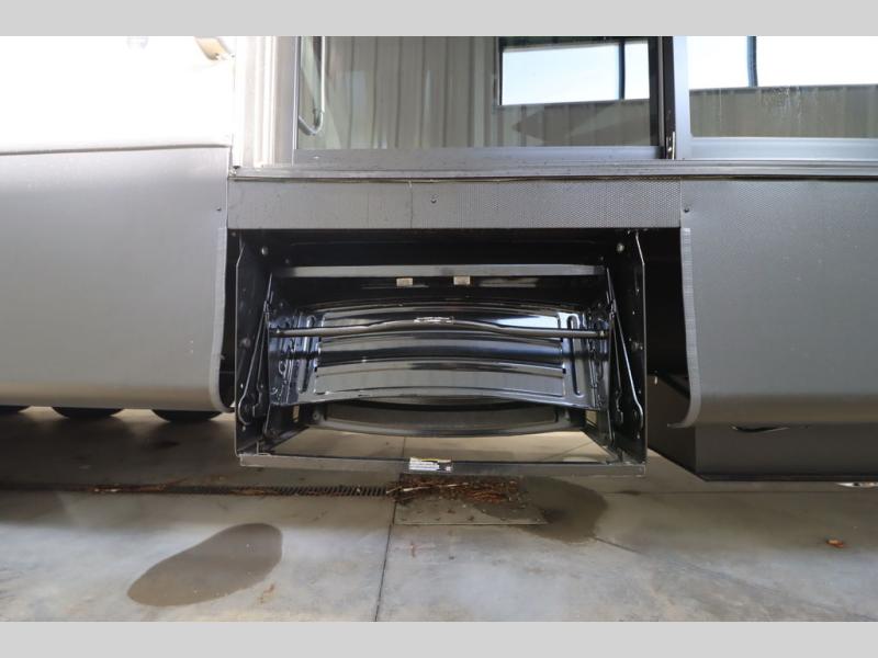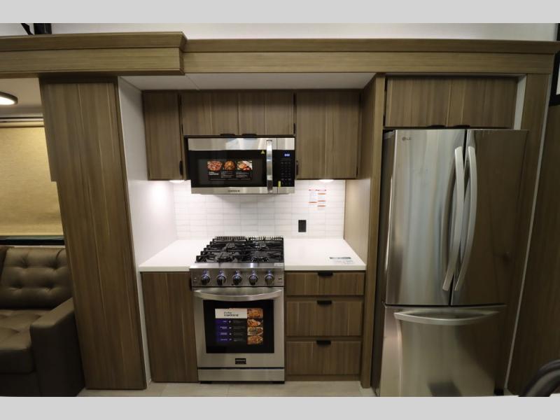 You will feel like you are home when you step inside! Not only will you be impressed with the super large slide in the main combined kitchen and living area, but check out the island with four counter height seats! The main entry closest to the front features a private bedroom with a custom king bed with Versa-Tilt within a slide, plus a fireplace and a dresser for your belongings. Just outside this door is a spiral staircase to the front loft with two 42" x 74" bunk mats above. The kitchen is fully equipped for you to provide the best home cooked meals with a pull-out pantry, range and microwave, plus side-by-side refrigerator. There is also a half bath off of the kitchen for added convenience! An L-shaped sectional sofa with an ottoman provides a cozy space to relax, and there is an entertainment center with a fireplace for a relaxing evenings indoors. A full rear bath features a spacious walk-in shower, a linen closet plus washer and dryer prep for the option to make laundry day easier. And the second loft with stairs is above the bath for even more sleeping space!