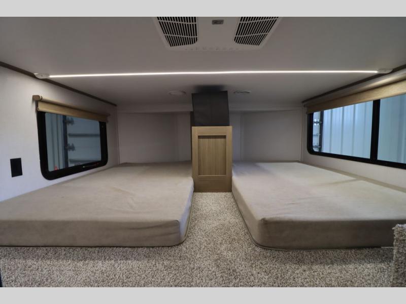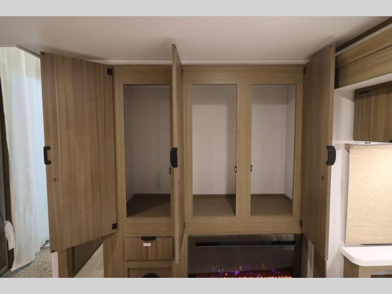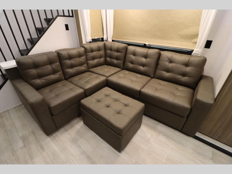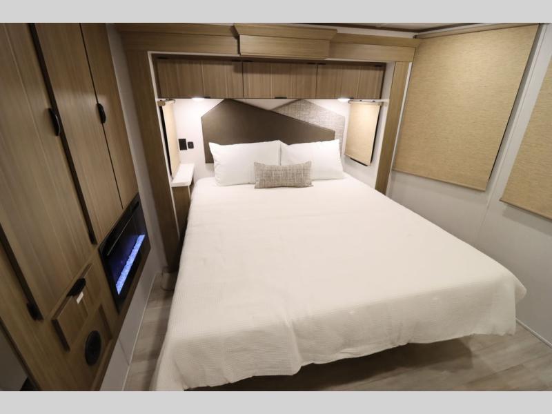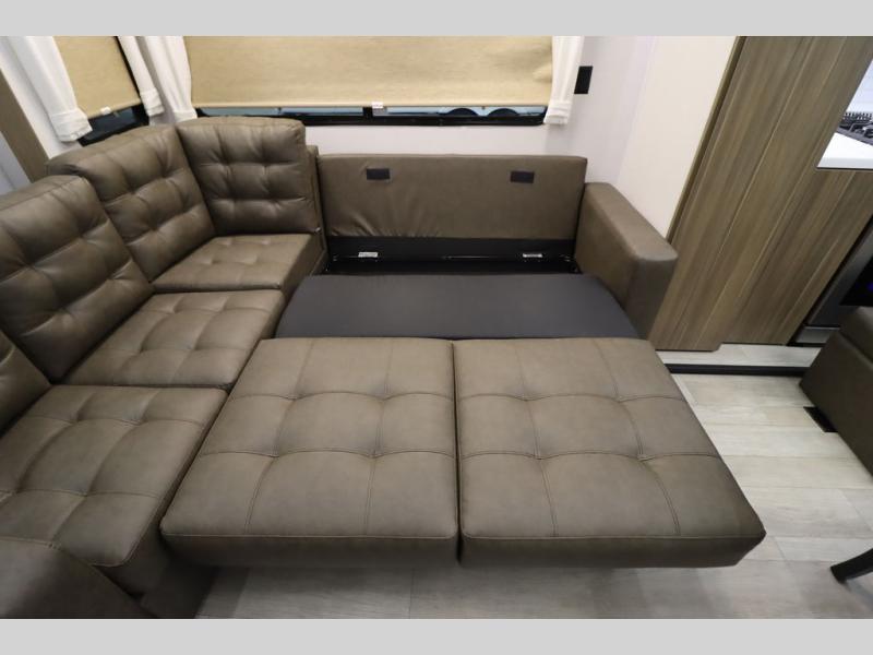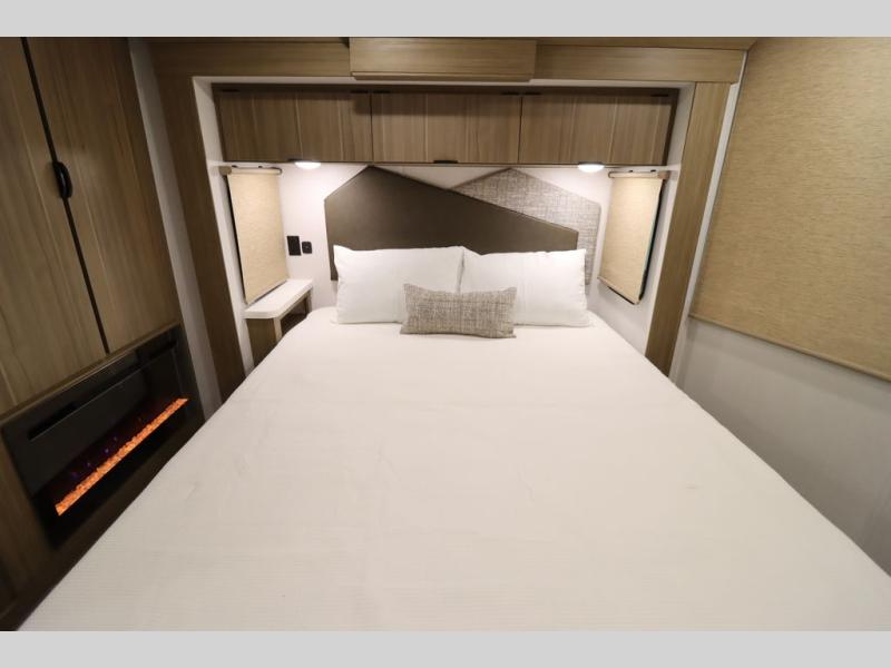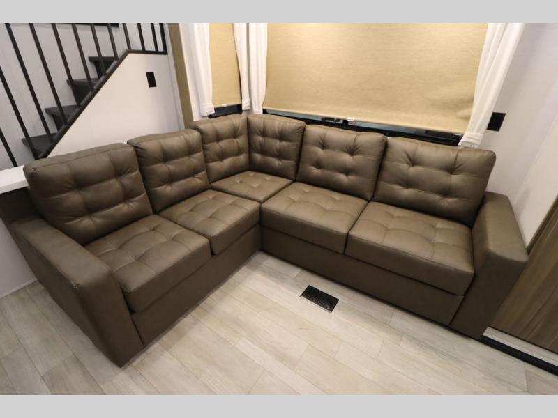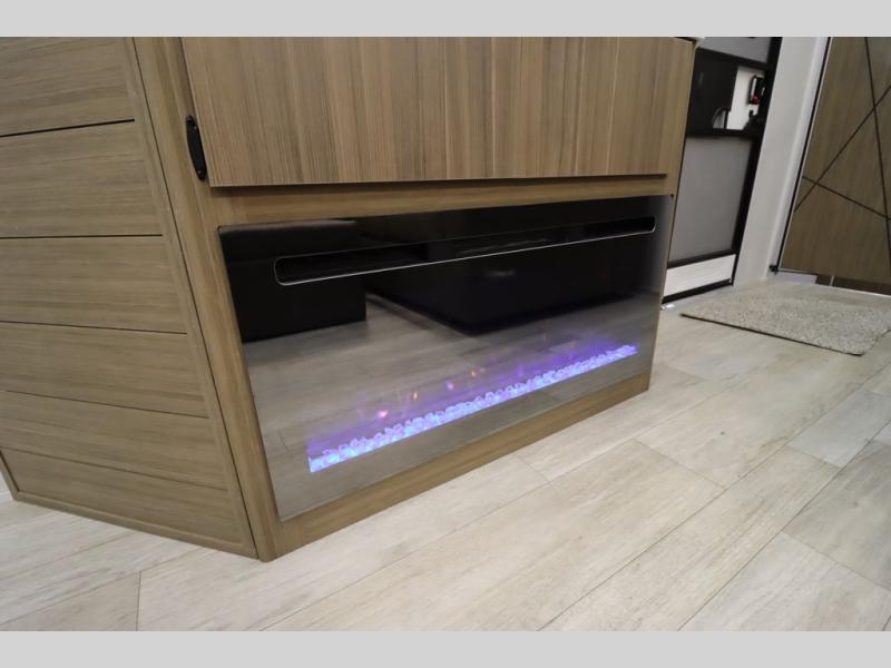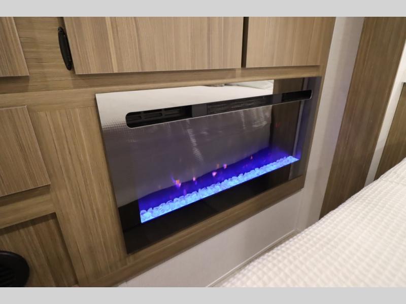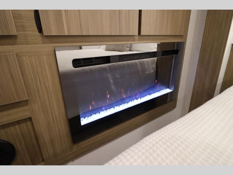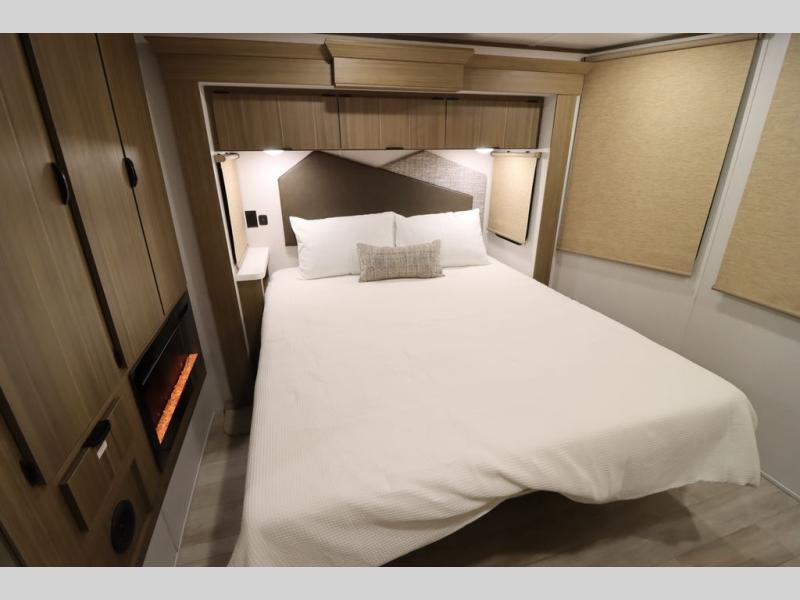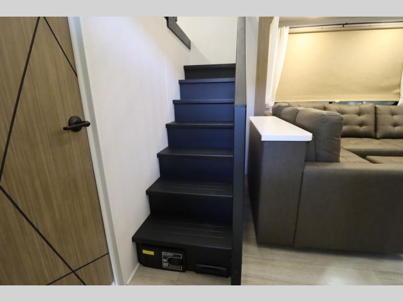 You will feel like you are home when you step inside! Not only will you be impressed with the super large slide in the main combined kitchen and living area, but check out the island with four counter height seats! The main entry closest to the front features a private bedroom with a custom king bed with Versa-Tilt within a slide, plus a fireplace and a dresser for your belongings. Just outside this door is a spiral staircase to the front loft with two 42" x 74" bunk mats above. The kitchen is fully equipped for you to provide the best home cooked meals with a pull-out pantry, range and microwave, plus side-by-side refrigerator. There is also a half bath off of the kitchen for added convenience! An L-shaped sectional sofa with an ottoman provides a cozy space to relax, and there is an entertainment center with a fireplace for a relaxing evenings indoors. A full rear bath features a spacious walk-in shower, a linen closet plus washer and dryer prep for the option to make laundry day easier. And the second loft with stairs is above the bath for even more sleeping space!