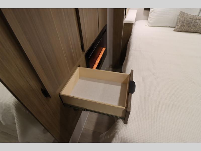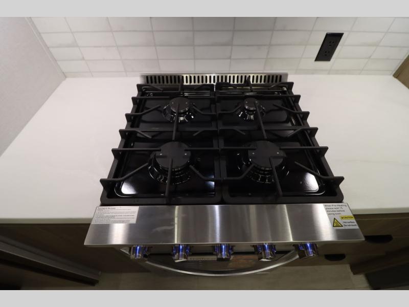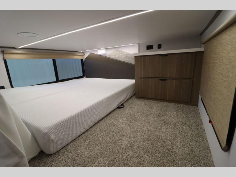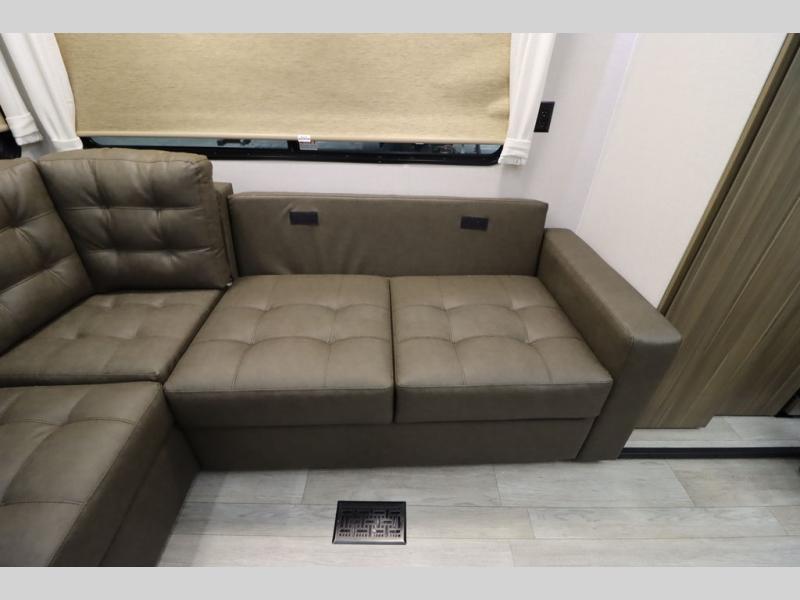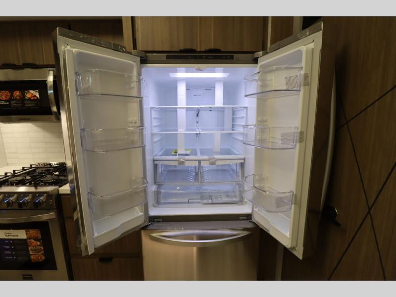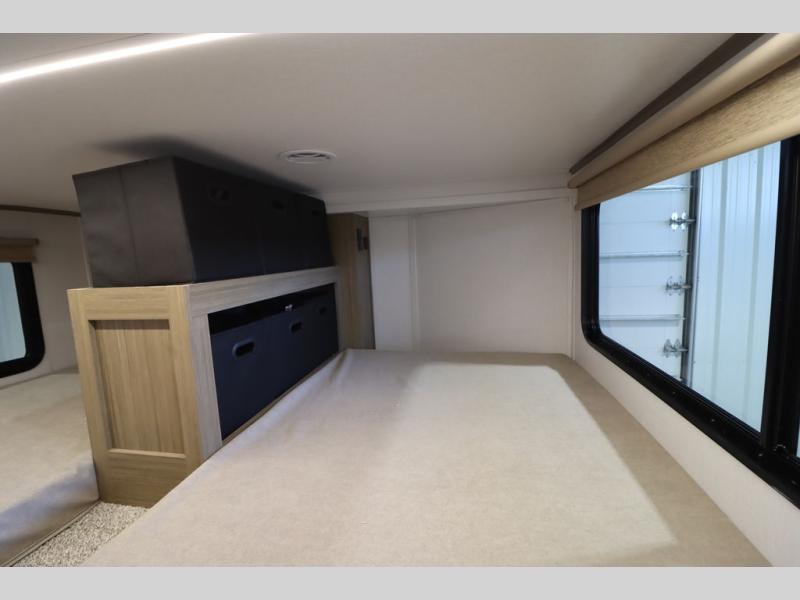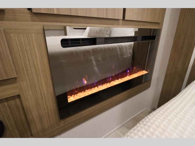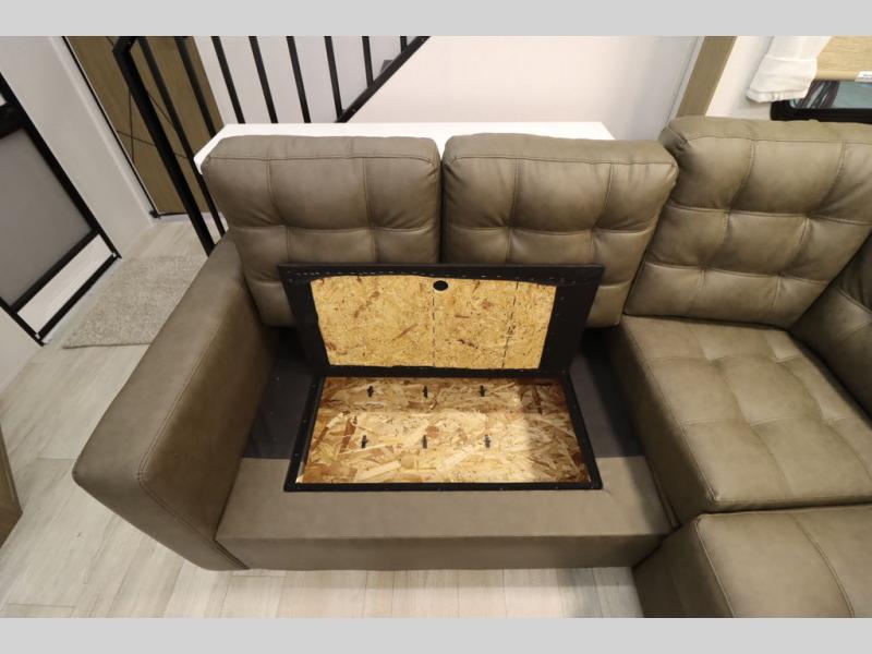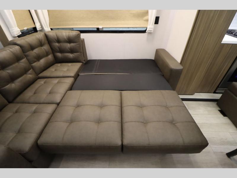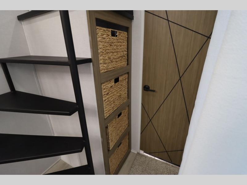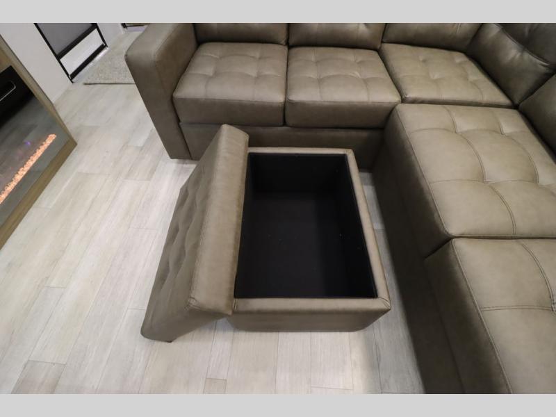 You will feel like you are home when you step inside! Not only will you be impressed with the super large slide in the main combined kitchen and living area, but check out the island with four counter height seats! The main entry closest to the front features a private bedroom with a custom king bed with Versa-Tilt within a slide, plus a fireplace and a dresser for your belongings. Just outside this door is a spiral staircase to the front loft with two 42" x 74" bunk mats above. The kitchen is fully equipped for you to provide the best home cooked meals with a pull-out pantry, range and microwave, plus side-by-side refrigerator. There is also a half bath off of the kitchen for added convenience! An L-shaped sectional sofa with an ottoman provides a cozy space to relax, and there is an entertainment center with a fireplace for a relaxing evenings indoors. A full rear bath features a spacious walk-in shower, a linen closet plus washer and dryer prep for the option to make laundry day easier. And the second loft with stairs is above the bath for even more sleeping space!