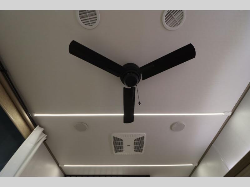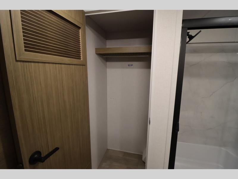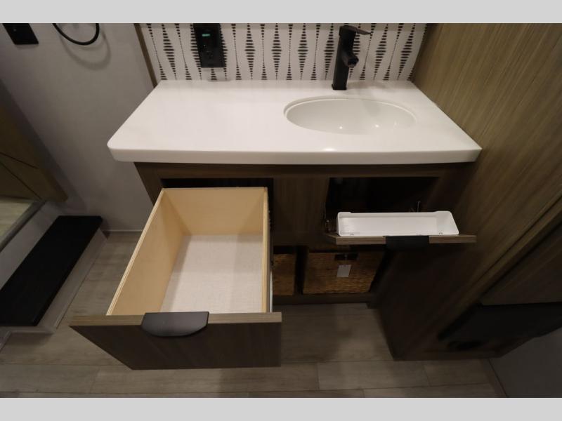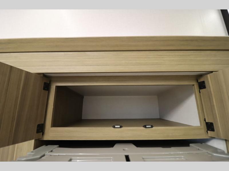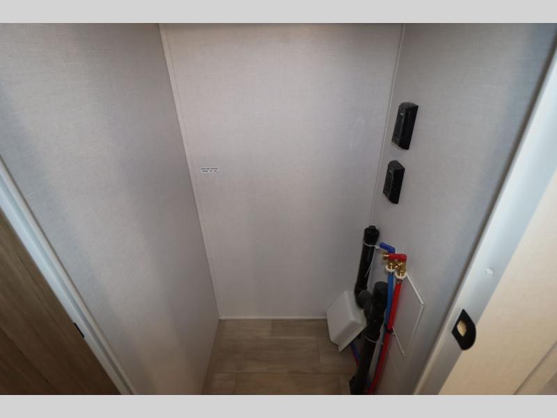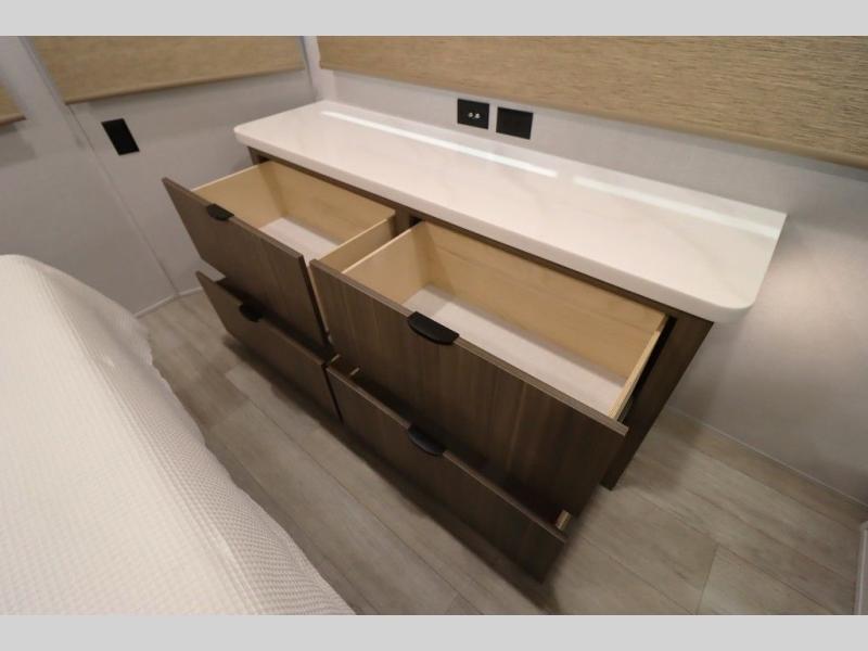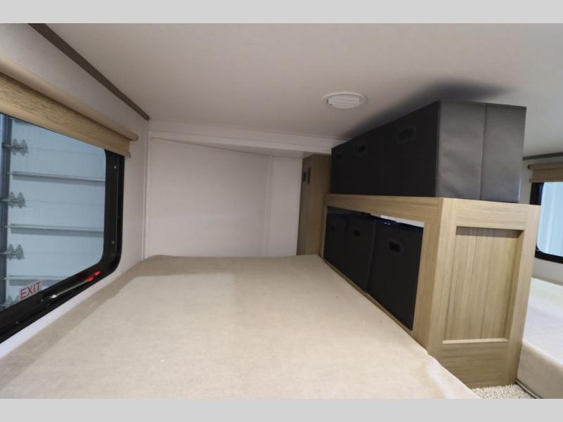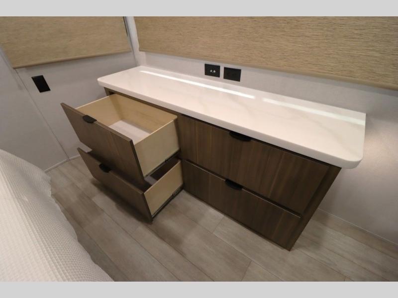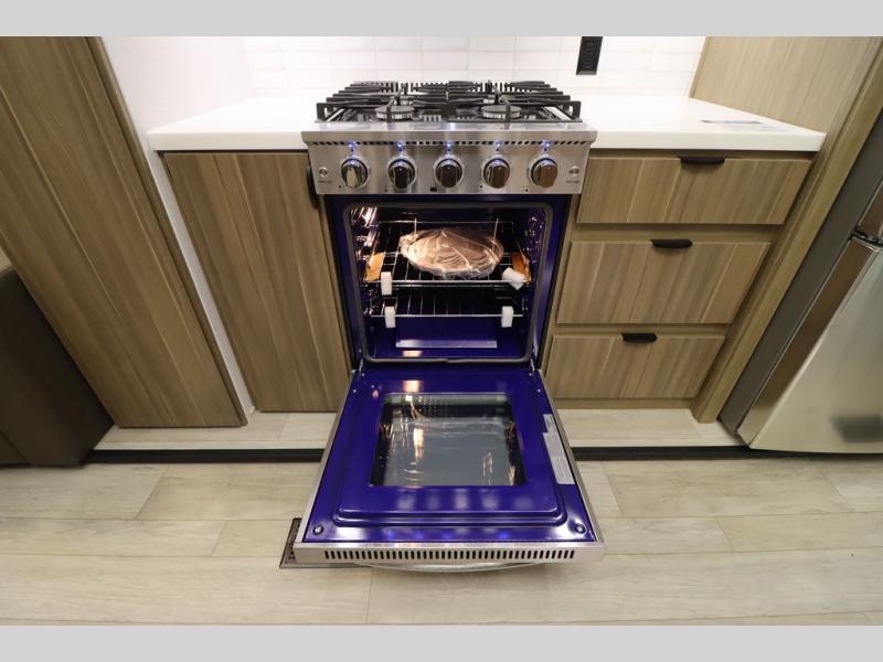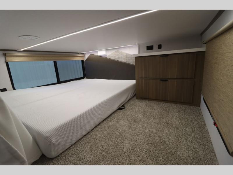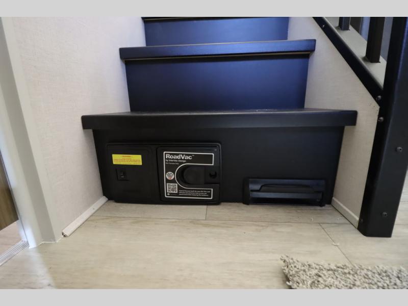 You will feel like you are home when you step inside! Not only will you be impressed with the super large slide in the main combined kitchen and living area, but check out the island with four counter height seats! The main entry closest to the front features a private bedroom with a custom king bed with Versa-Tilt within a slide, plus a fireplace and a dresser for your belongings. Just outside this door is a spiral staircase to the front loft with two 42" x 74" bunk mats above. The kitchen is fully equipped for you to provide the best home cooked meals with a pull-out pantry, range and microwave, plus side-by-side refrigerator. There is also a half bath off of the kitchen for added convenience! An L-shaped sectional sofa with an ottoman provides a cozy space to relax, and there is an entertainment center with a fireplace for a relaxing evenings indoors. A full rear bath features a spacious walk-in shower, a linen closet plus washer and dryer prep for the option to make laundry day easier. And the second loft with stairs is above the bath for even more sleeping space!