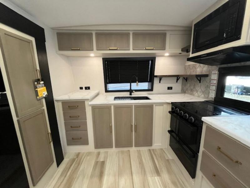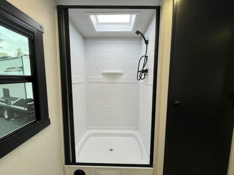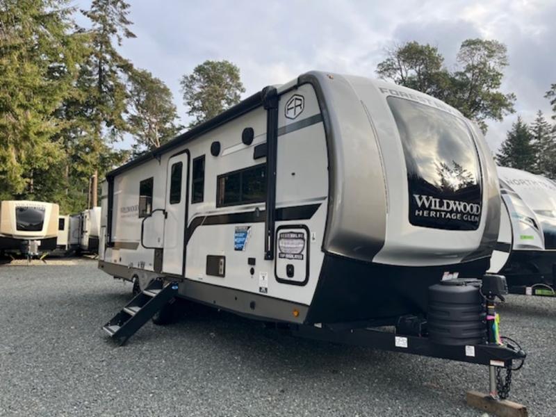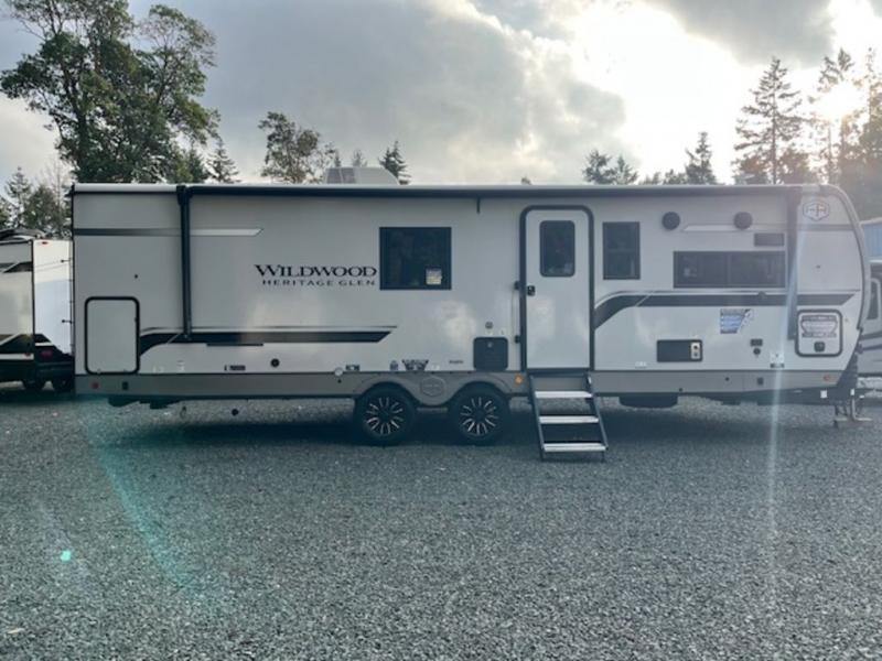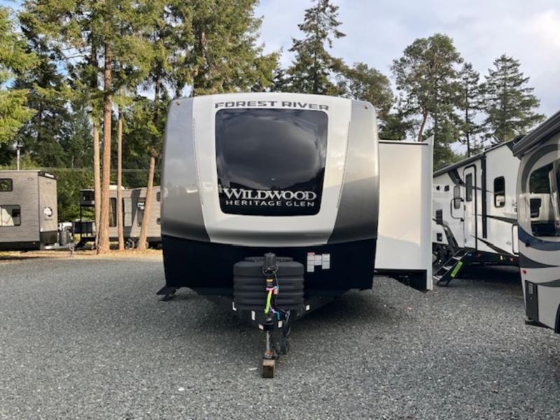 With any Wildwood Heritage Glen travel trailer by Forest River, the quality construction, attention to detail and design along with a bright and welcoming interior allows you to relax in comfort with conveniences while exploring outdoors. Each model includes a WeatherShield one piece fiberglass roof, Maxxis radial tires, and an enclosed underbelly with 12V tank heaters on all holding tanks for added protection. You will appreciate the on-demand tankless water heater, along with the 15K BTU Quite Cool A/C and 50 Amp service with a brace for a second A/C. There is an outside shower with hot and cold water, solar prep, a power tongue jack, plus many more exterior conveniences. Head inside to enjoy matte gold hardware, wood door casings in place of plastic door casings, and full length barreled ceilings for additional head room.