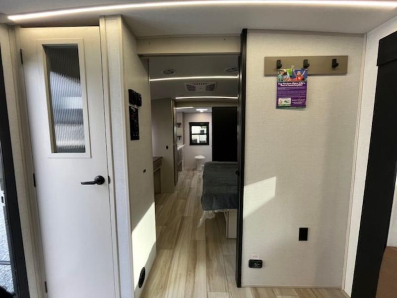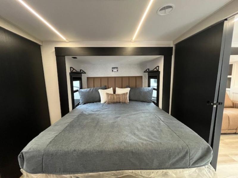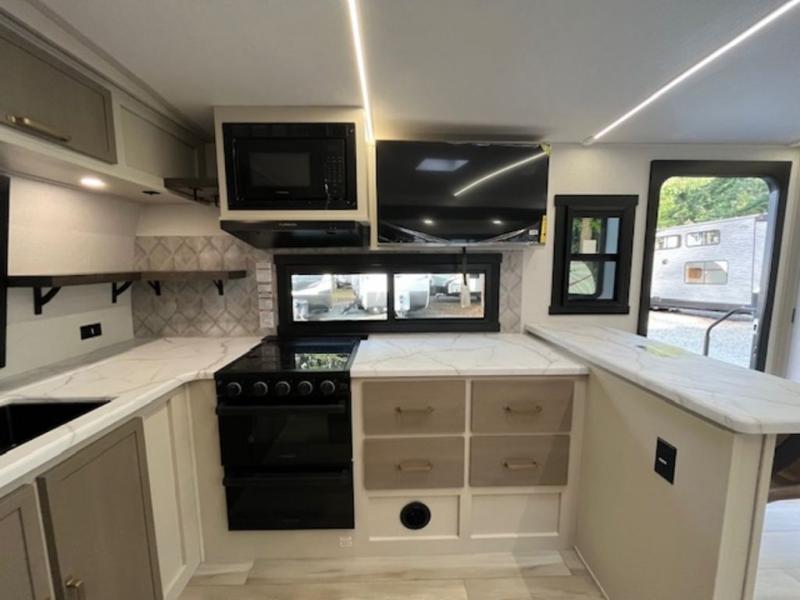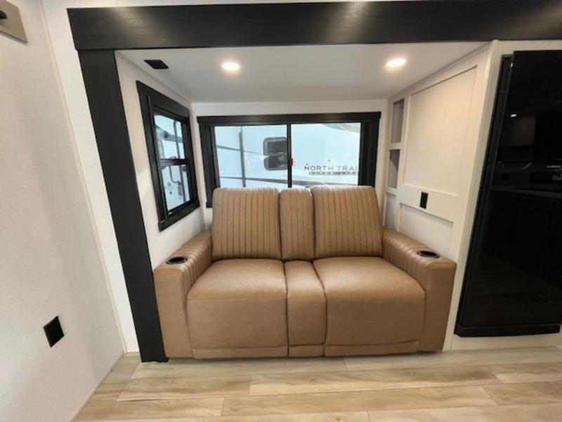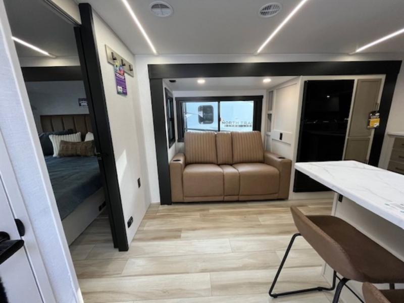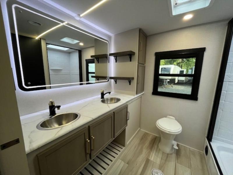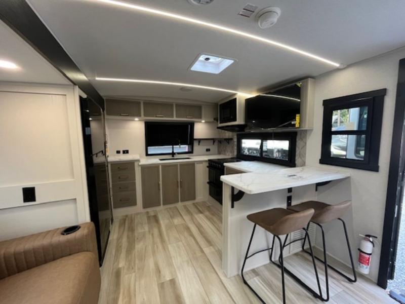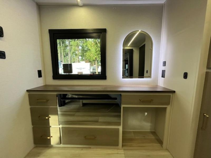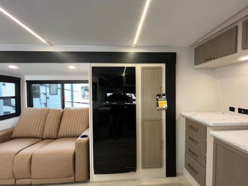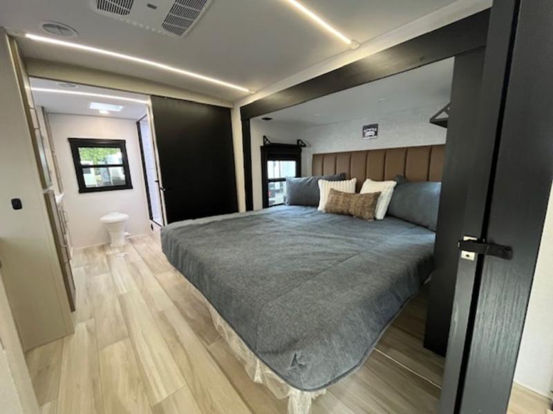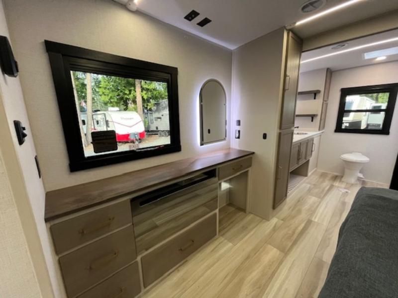You'll love every minute spent in this double slide out, couple's trailer! You can wake up refreshed each day on your king bed, and enjoy great outdoor views with the bedroom panoramic window. There is also a dresser with a fireplace for a more cozy feel, and the full rear bath includes dual bath sinks plus a walk-in shower to freshen up in. Washer and dryer connections are also located here so you can choose to add those appliances if you wish. The main living area includes a 67" theater seat, no carpet for easy cleaning, and ample counter space in the front kitchen. There is also a bar top with two seats, and plenty of storage space for all your belongings.
