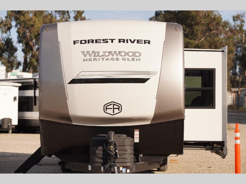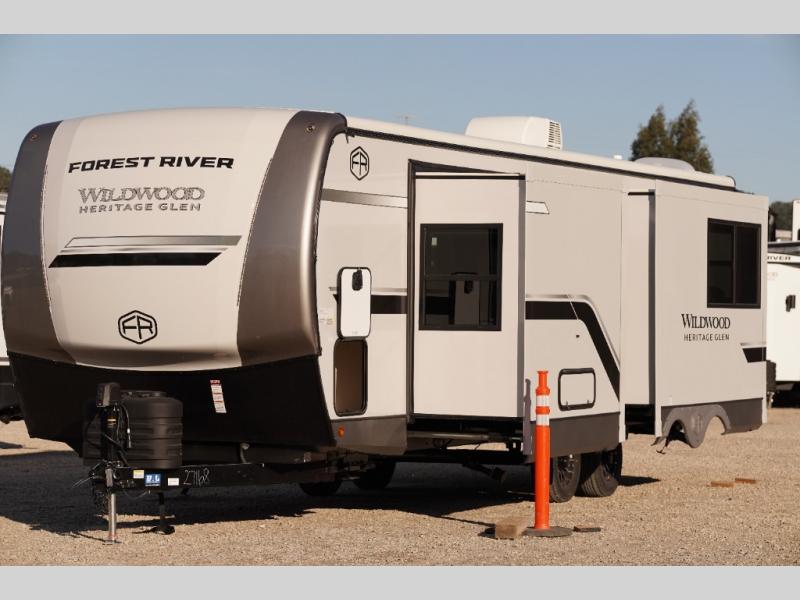 With any Wildwood Heritage Glen travel trailer by Forest River, the quality construction, attention to detail and design along with a bright and welcoming interior allows you to relax in comfort with conveniences while exploring outdoors. Each model includes a WeatherShield one piece fiberglass roof, Maxxis radial tires, and an enclosed underbelly with 12V tank heaters on all holding tanks for added protection. You will appreciate the on-demand tankless water heater, along with the 15K BTU Quite Cool A/C and 50 Amp service with a brace for a second A/C. There is an outside shower with hot and cold water, solar prep, a power stabilizer and tongue jack, plus many more exterior conveniences. Head inside to enjoy matte gold hardware, wood door casings in place of plastic door casings, and full length barreled ceilings for additional head room.