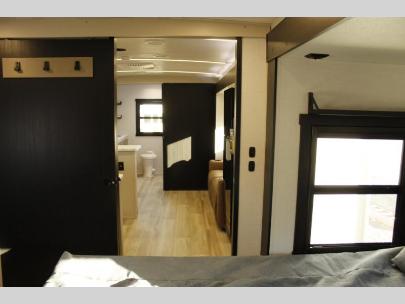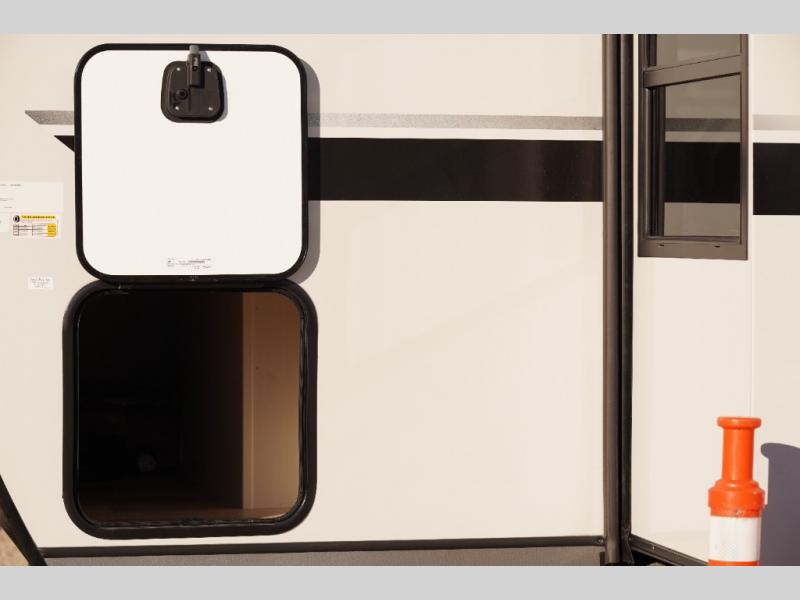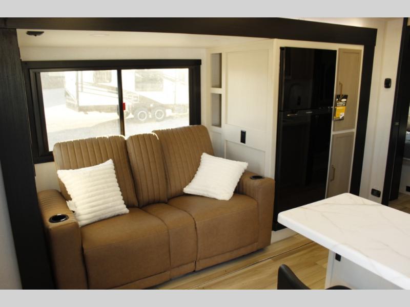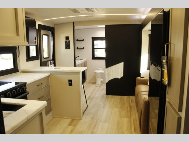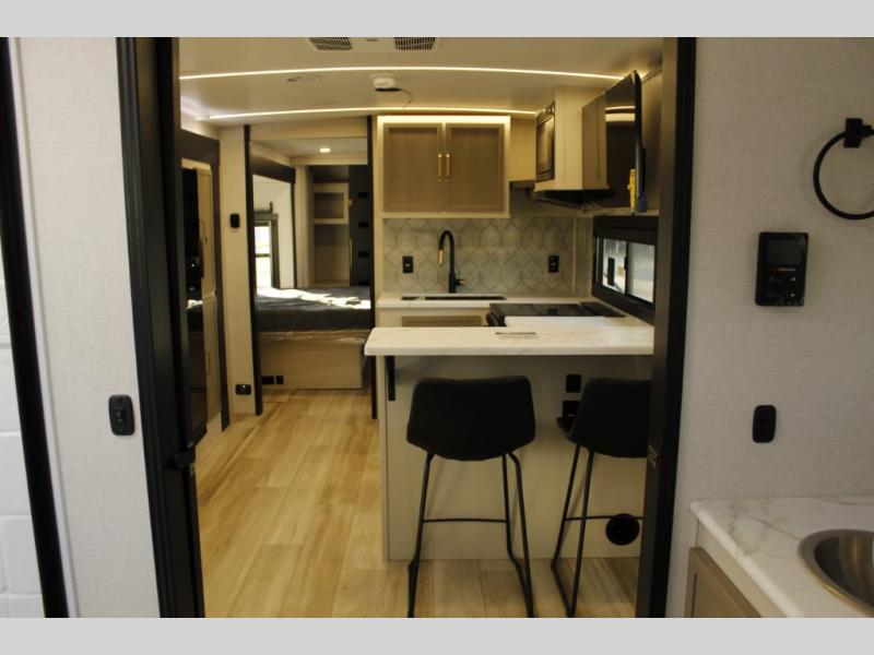 It won't be hard to find comfort in this dual entry travel trailer for two! The front bedroom includes one of the entry doors, a king bed slide out, and a large front wardrobe with washer and dryer prep if you want to add those appliances. You can relax in the main living room and combined kitchen that includes a large slide out and theater seating, or you can relax outside under the 21' awning! There is also an outside kitchen with a griddle and refrigerator if you enjoy cooking outdoors. Once you've headed back inside for the night, you can freshen up in the full rear bath before bed. Here, you'll find dual bath sinks, a linen closet, and a walk-in shower with skylights for more natural lighting!