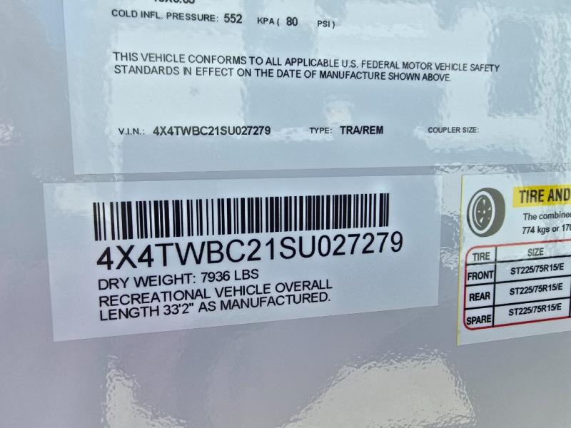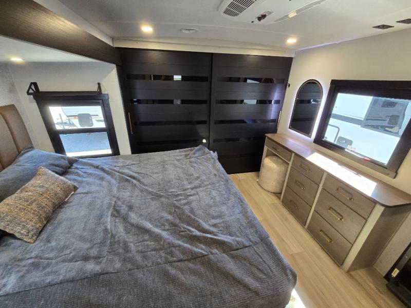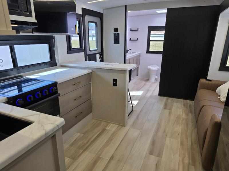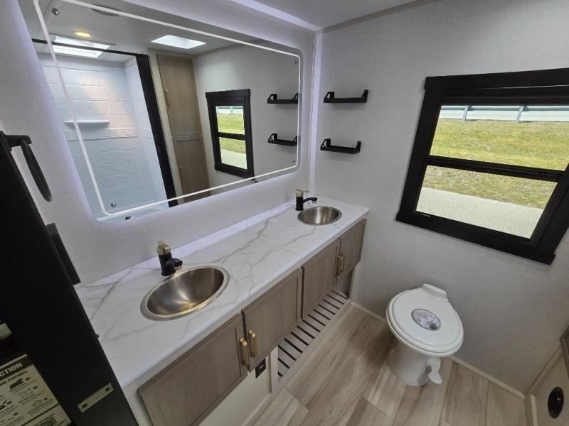 It won't be hard to find comfort in this dual entry travel trailer for two! The front bedroom includes one of the entry doors, a king bed slide out, and a large front wardrobe with washer and dryer prep if you want to add those appliances. You can relax in the main living room and combined kitchen that includes a large slide out and theater seating, or you can relax outside under the 21' awning! There is also an outside kitchen with a griddle and refrigerator if you enjoy cooking outdoors. Once you've headed back inside for the night, you can freshen up in the full rear bath before bed. Here, you'll find dual bath sinks, a linen closet, and a walk-in shower with skylights for more natural lighting!