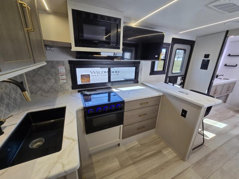 With any Wildwood Heritage Glen travel trailer by Forest River, the quality construction, attention to detail and design along with a bright and welcoming interior allows you to relax in comfort with conveniences while exploring outdoors. Each model includes a WeatherShield one piece fiberglass roof, Maxxis radial tires, and an enclosed underbelly with 12V tank heaters on all holding tanks for added protection. You will appreciate the on-demand tankless water heater, along with the 15K BTU Quite Cool A/C and 50 Amp service with a brace for a second A/C. There is an outside shower with hot and cold water, solar prep, a power tongue jack, plus many more exterior conveniences. Head inside to enjoy matte gold hardware, wood door casings in place of plastic door casings, and full length barreled ceilings for additional head room.