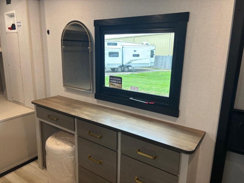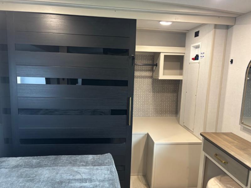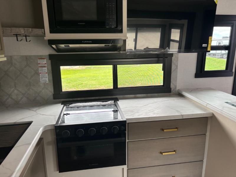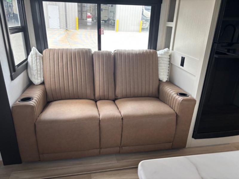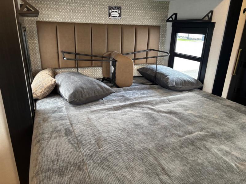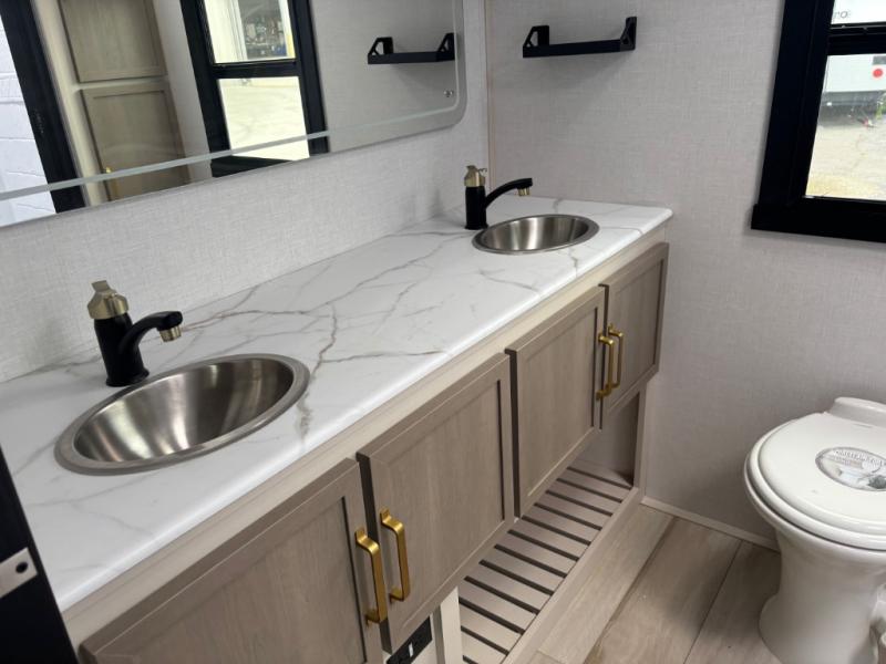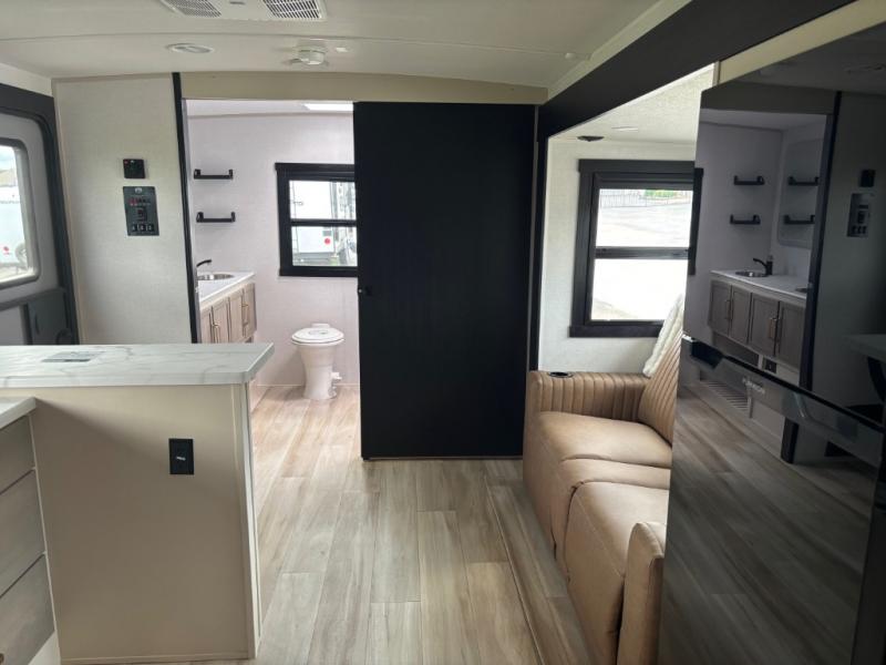 It won't be hard to find comfort in this dual entry travel trailer for two! The front bedroom includes one of the entry doors, a king bed slide out, and a large front wardrobe with washer and dryer prep if you want to add those appliances. You can relax in the main living room and combined kitchen that includes a large slide out and theater seating, or you can relax outside under the 21' awning! There is also an outside kitchen with a griddle and refrigerator if you enjoy cooking outdoors. Once you've headed back inside for the night, you can freshen up in the full rear bath before bed. Here, you'll find dual bath sinks, a linen closet, and a walk-in shower with skylights for more natural lighting!