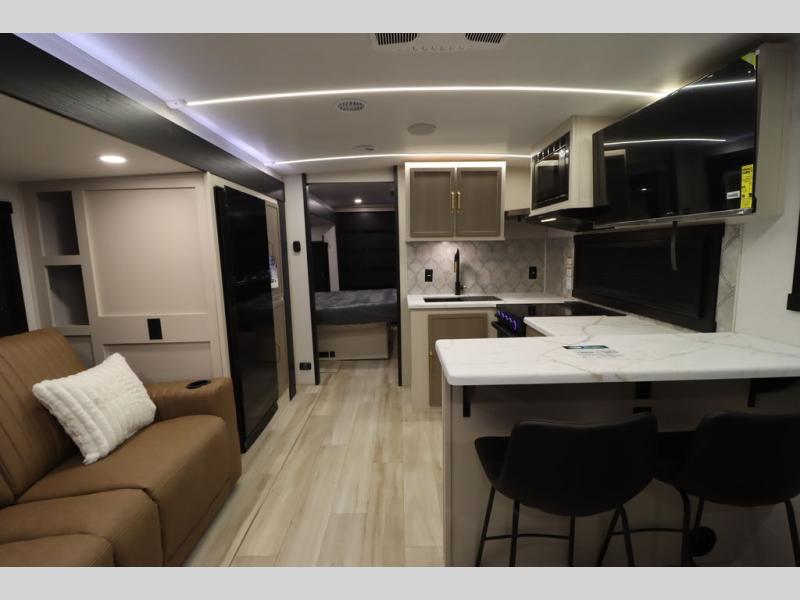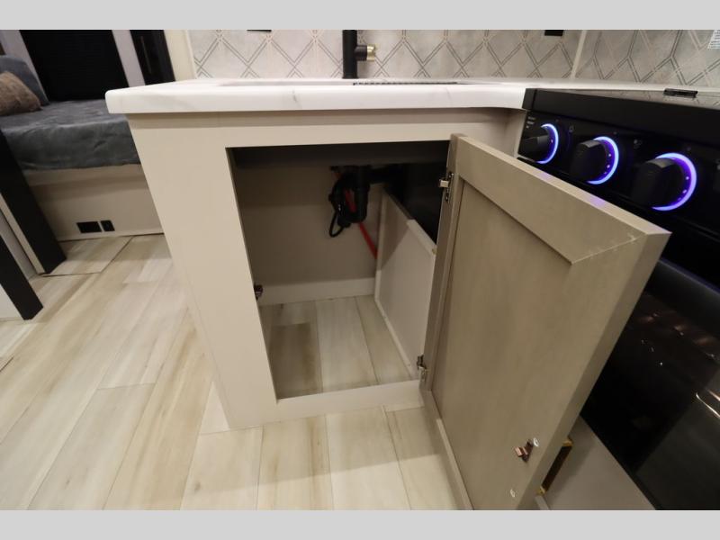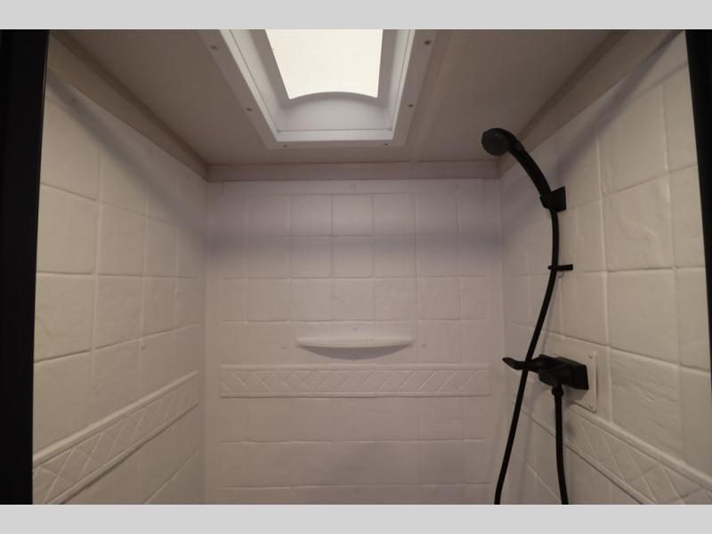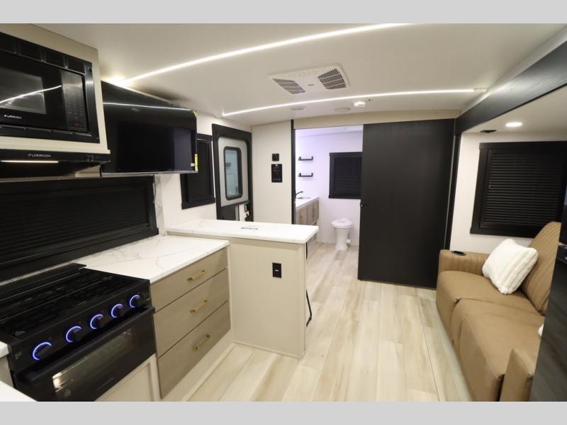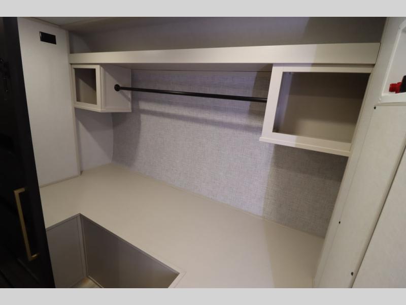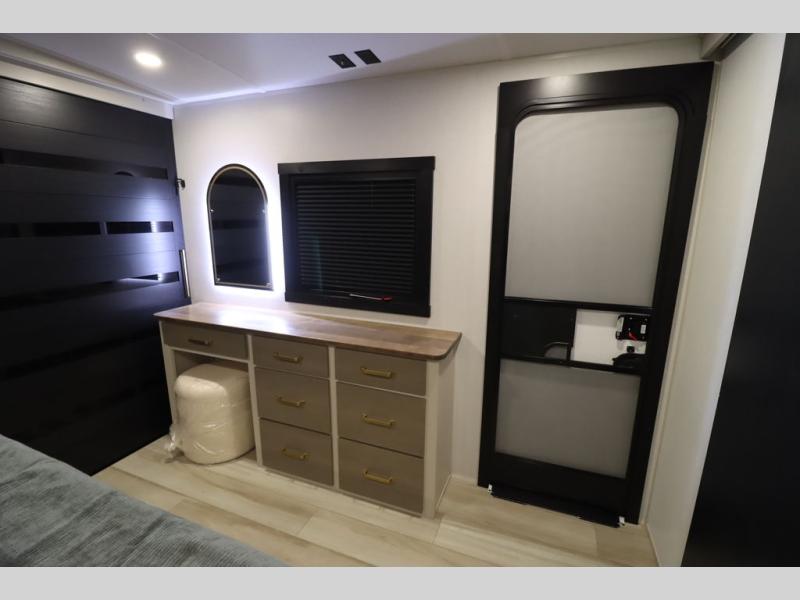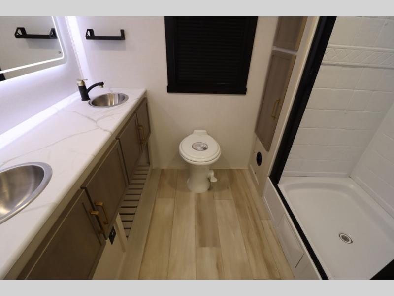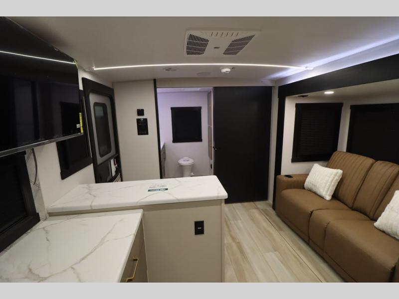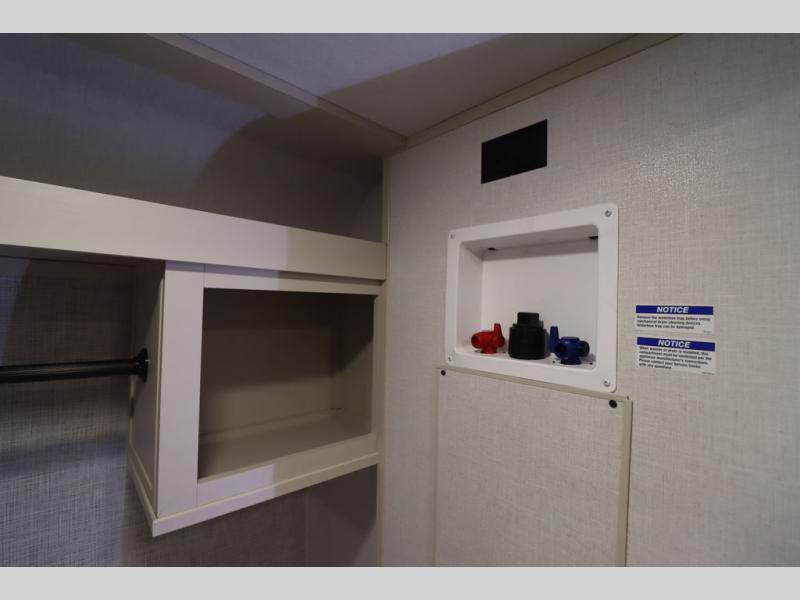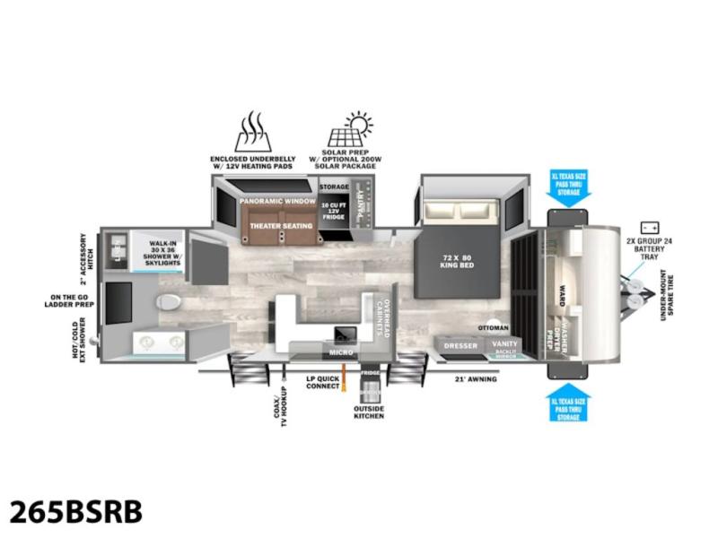 It won't be hard to find comfort in this dual entry travel trailer for two! The front bedroom includes one of the entry doors, a king bed slide out, and a large front wardrobe with washer and dryer prep if you want to add those appliances. You can relax in the main living room and combined kitchen that includes a large slide out and theater seating, or you can relax outside under the 21' awning! There is also an outside kitchen with a griddle and refrigerator if you enjoy cooking outdoors. Once you've headed back inside for the night, you can freshen up in the full rear bath before bed. Here, you'll find dual bath sinks, a linen closet, and a walk-in shower with skylights for more natural lighting!