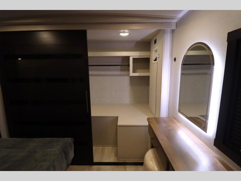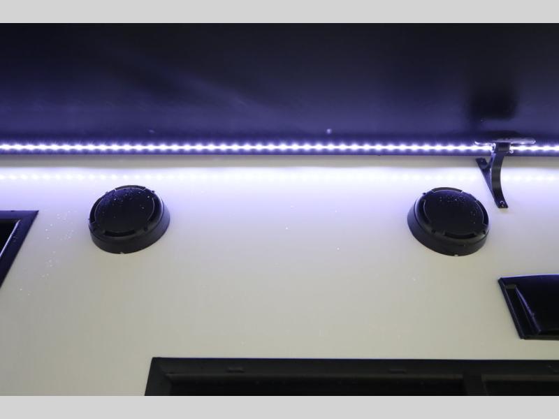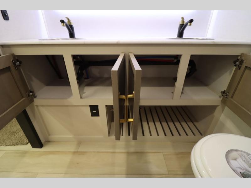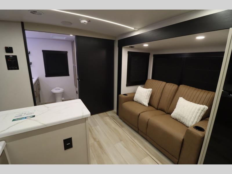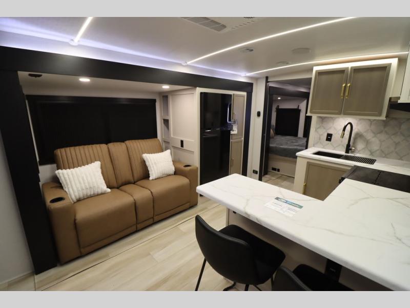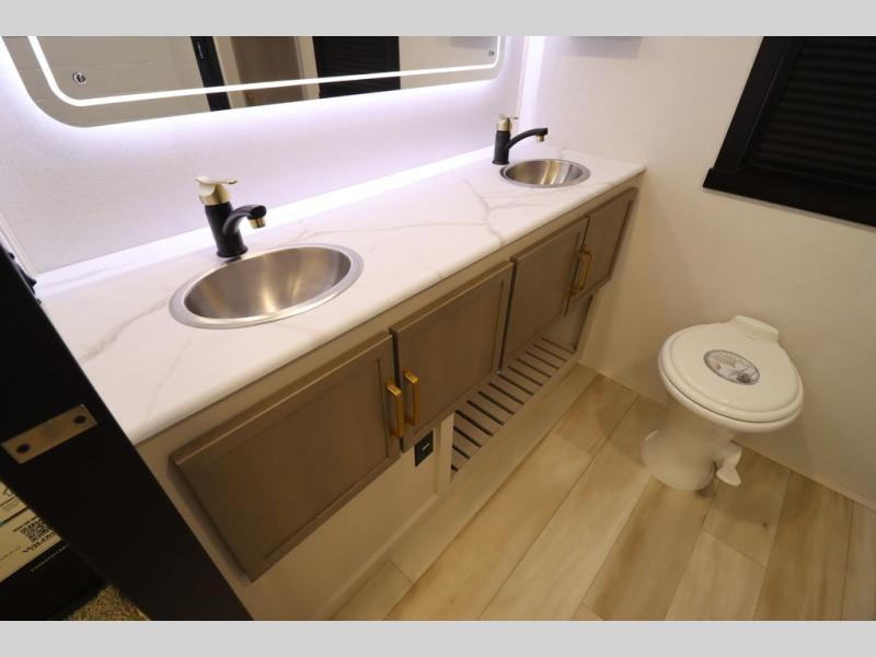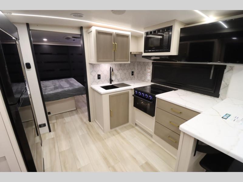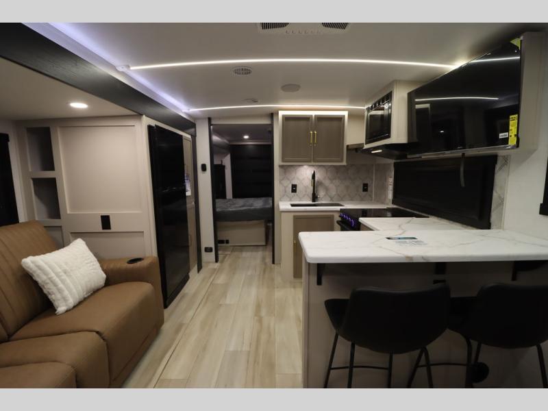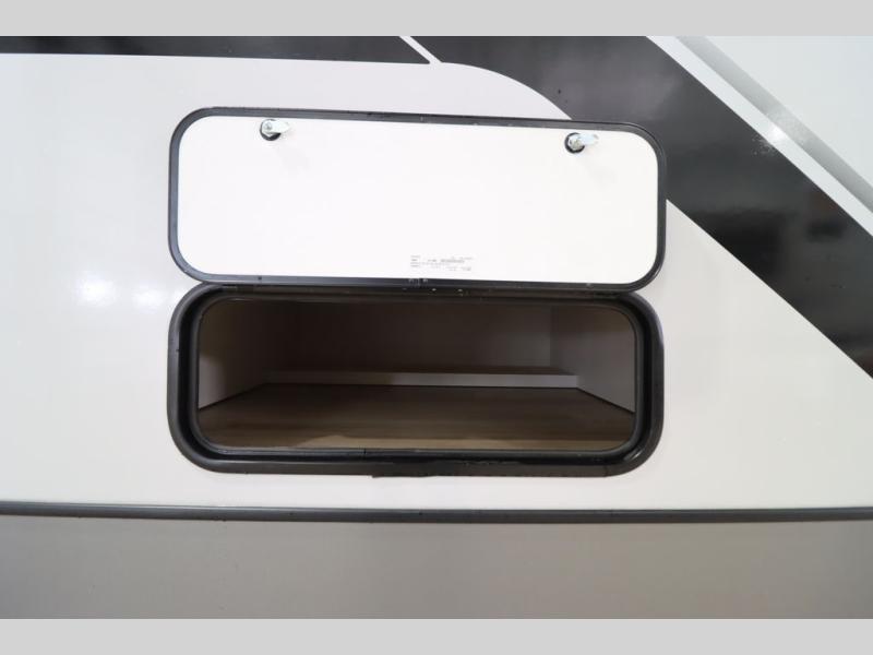 It won't be hard to find comfort in this dual entry travel trailer for two! The front bedroom includes one of the entry doors, a king bed slide out, and a large front wardrobe with washer and dryer prep if you want to add those appliances. You can relax in the main living room and combined kitchen that includes a large slide out and theater seating, or you can relax outside under the 21' awning! There is also an outside kitchen with a griddle and refrigerator if you enjoy cooking outdoors. Once you've headed back inside for the night, you can freshen up in the full rear bath before bed. Here, you'll find dual bath sinks, a linen closet, and a walk-in shower with skylights for more natural lighting!