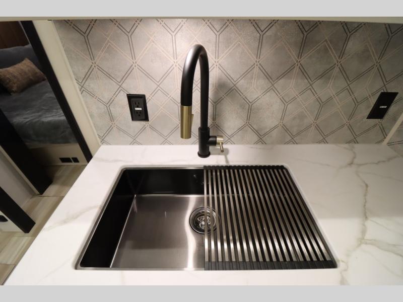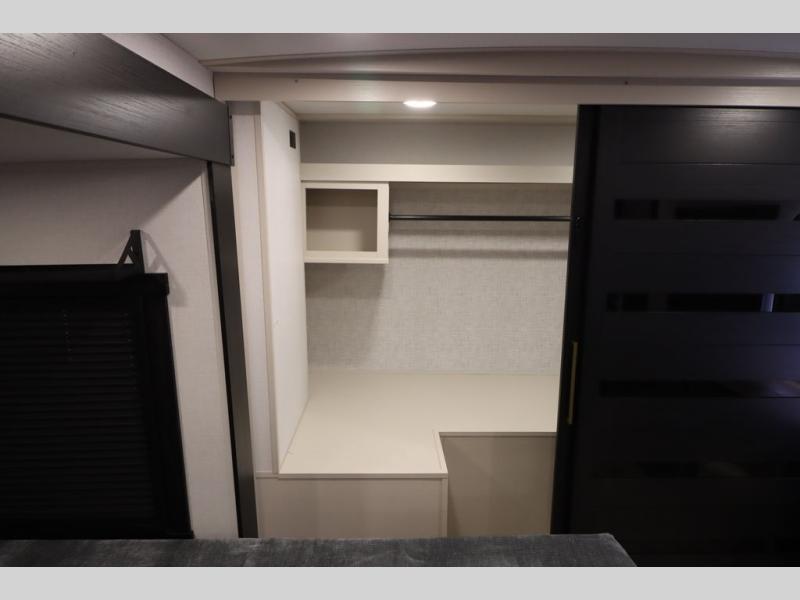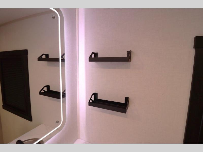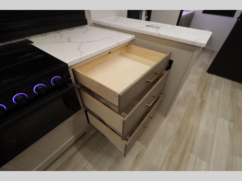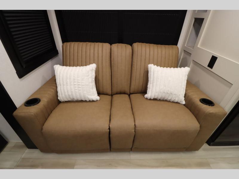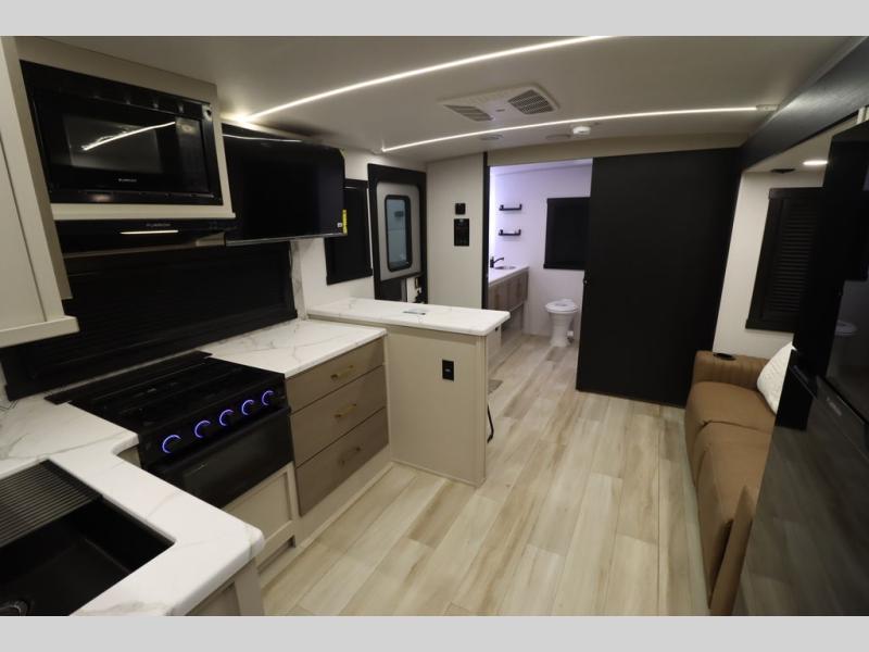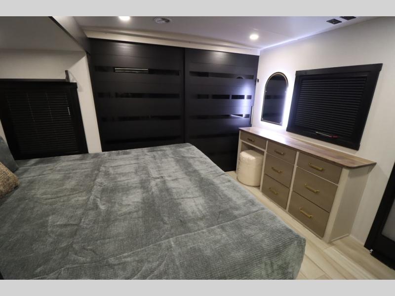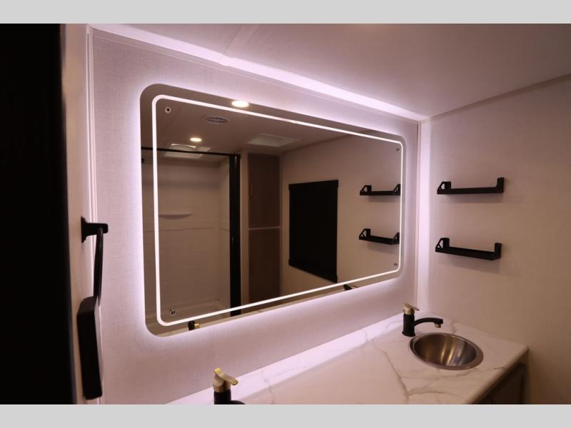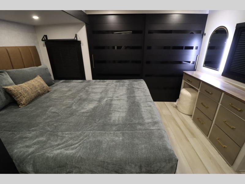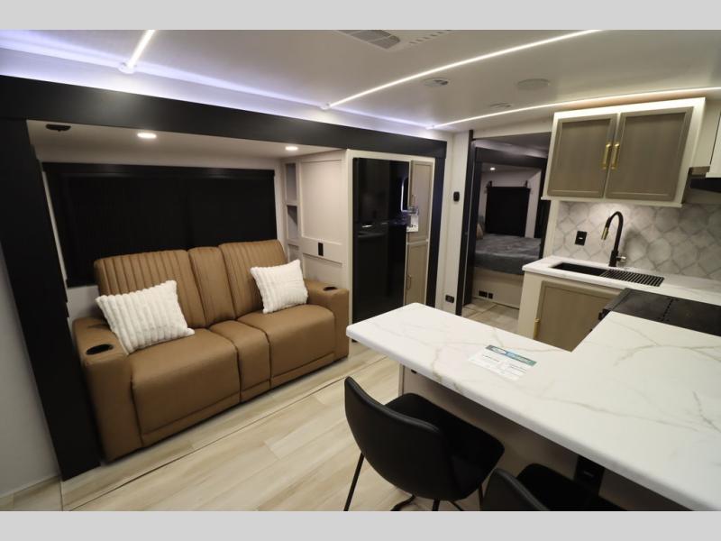 It won't be hard to find comfort in this dual entry travel trailer for two! The front bedroom includes one of the entry doors, a king bed slide out, and a large front wardrobe with washer and dryer prep if you want to add those appliances. You can relax in the main living room and combined kitchen that includes a large slide out and theater seating, or you can relax outside under the 21' awning! There is also an outside kitchen with a griddle and refrigerator if you enjoy cooking outdoors. Once you've headed back inside for the night, you can freshen up in the full rear bath before bed. Here, you'll find dual bath sinks, a linen closet, and a walk-in shower with skylights for more natural lighting!