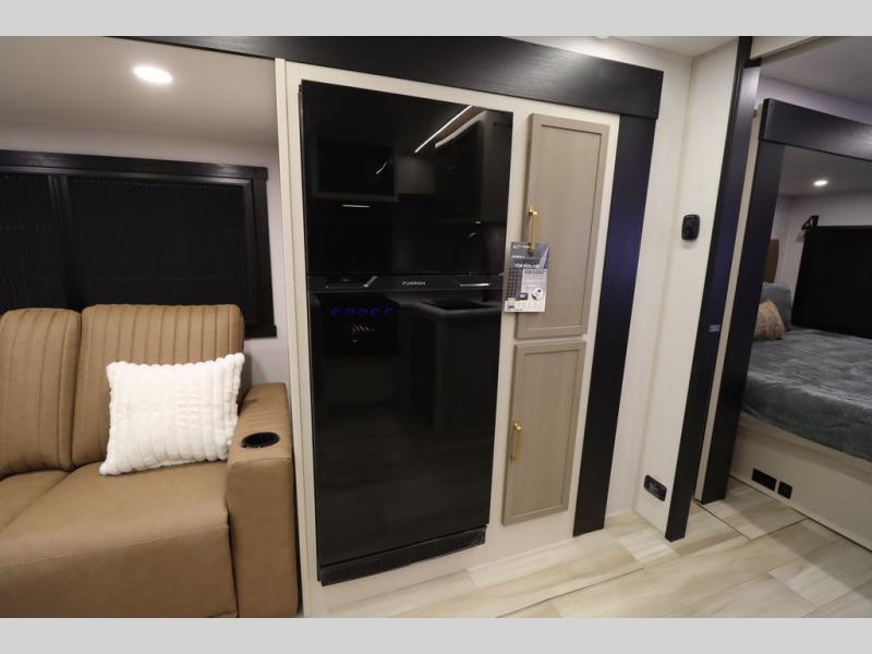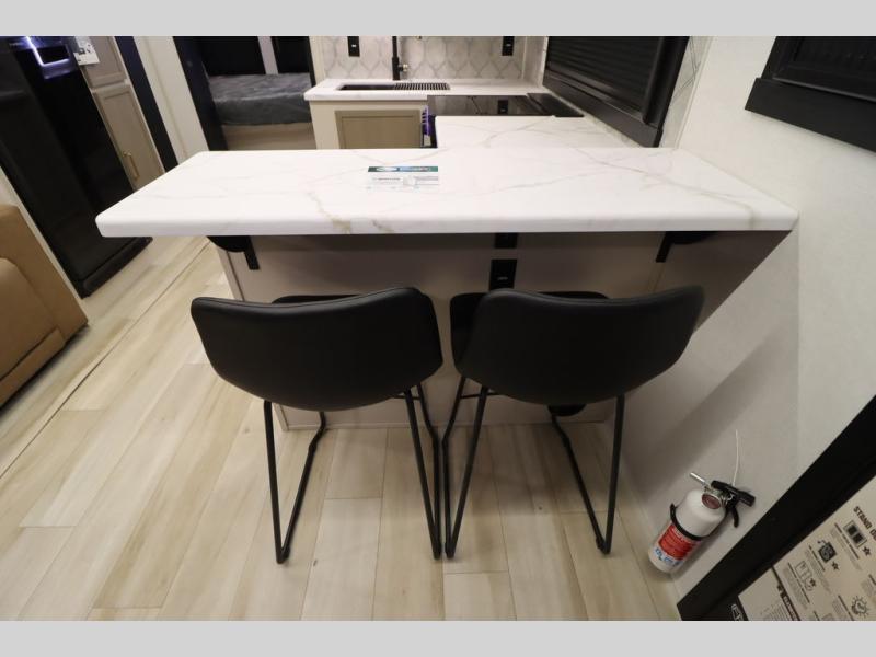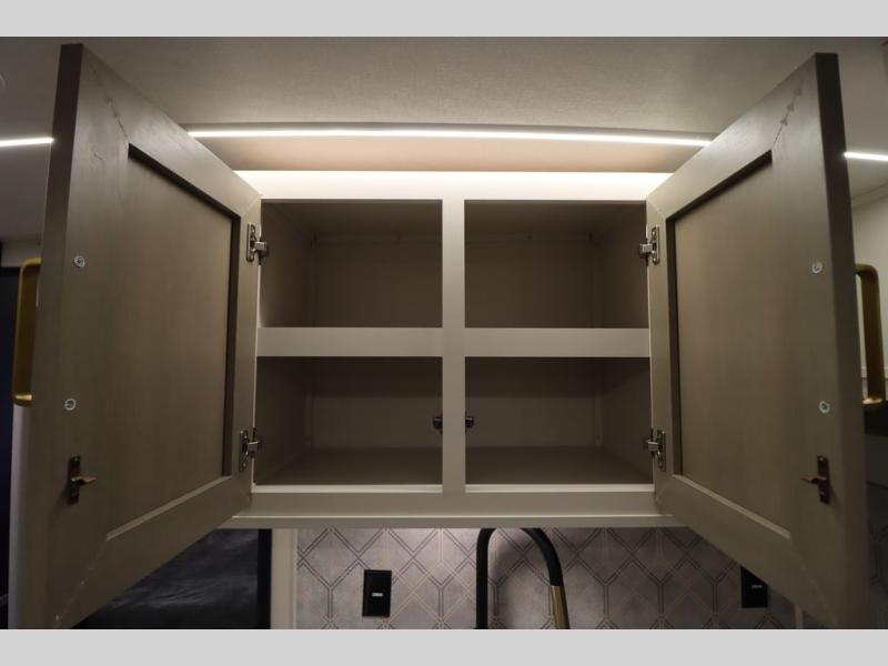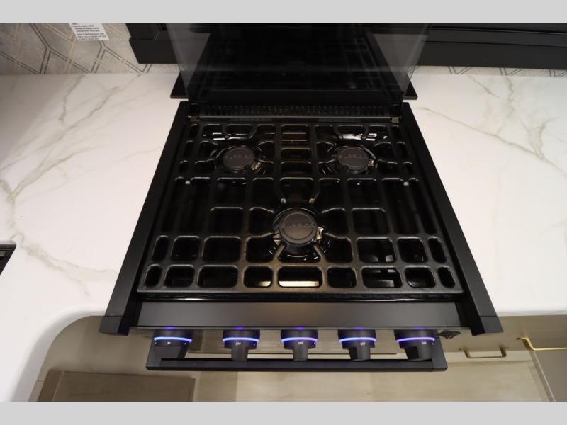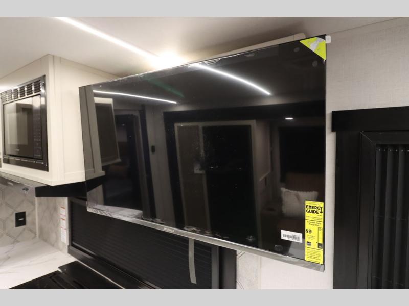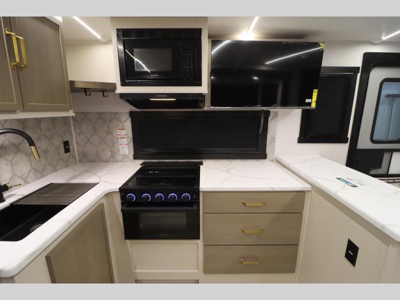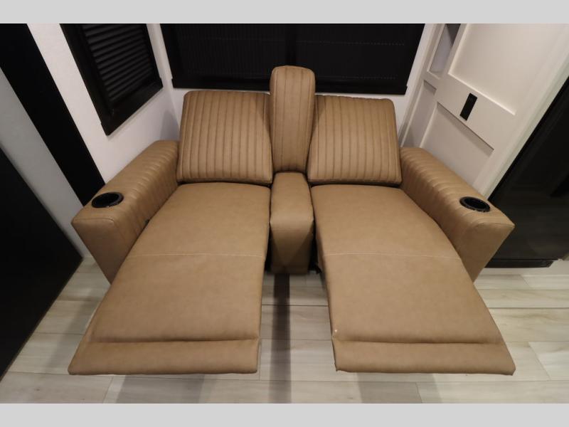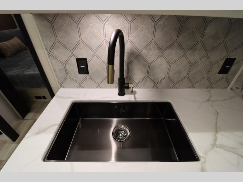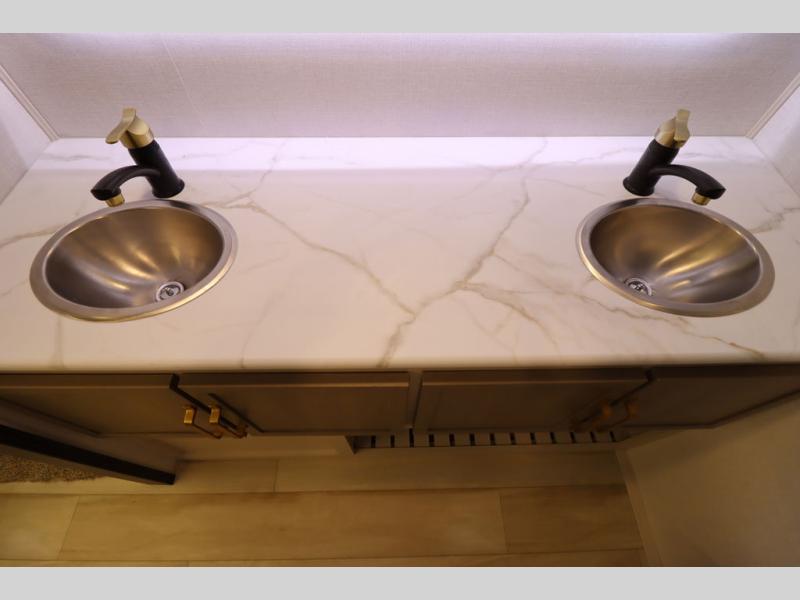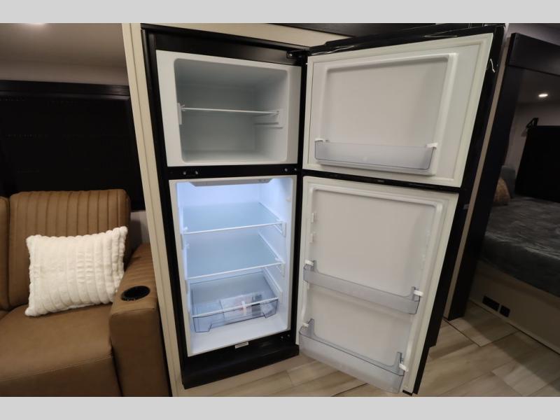 It won't be hard to find comfort in this dual entry travel trailer for two! The front bedroom includes one of the entry doors, a king bed slide out, and a large front wardrobe with washer and dryer prep if you want to add those appliances. You can relax in the main living room and combined kitchen that includes a large slide out and theater seating, or you can relax outside under the 21' awning! There is also an outside kitchen with a griddle and refrigerator if you enjoy cooking outdoors. Once you've headed back inside for the night, you can freshen up in the full rear bath before bed. Here, you'll find dual bath sinks, a linen closet, and a walk-in shower with skylights for more natural lighting!