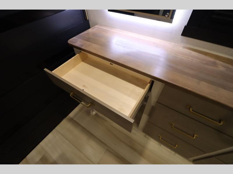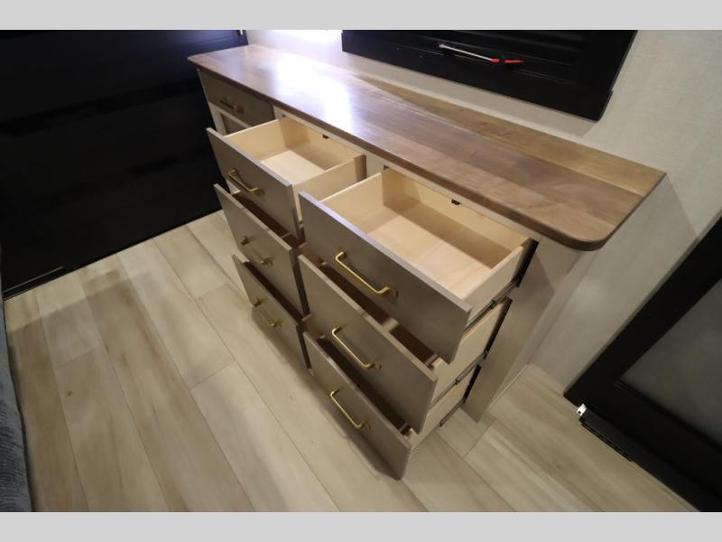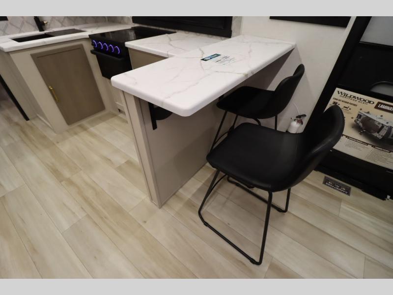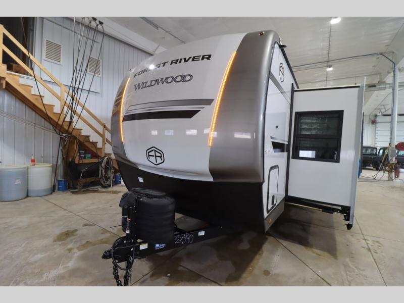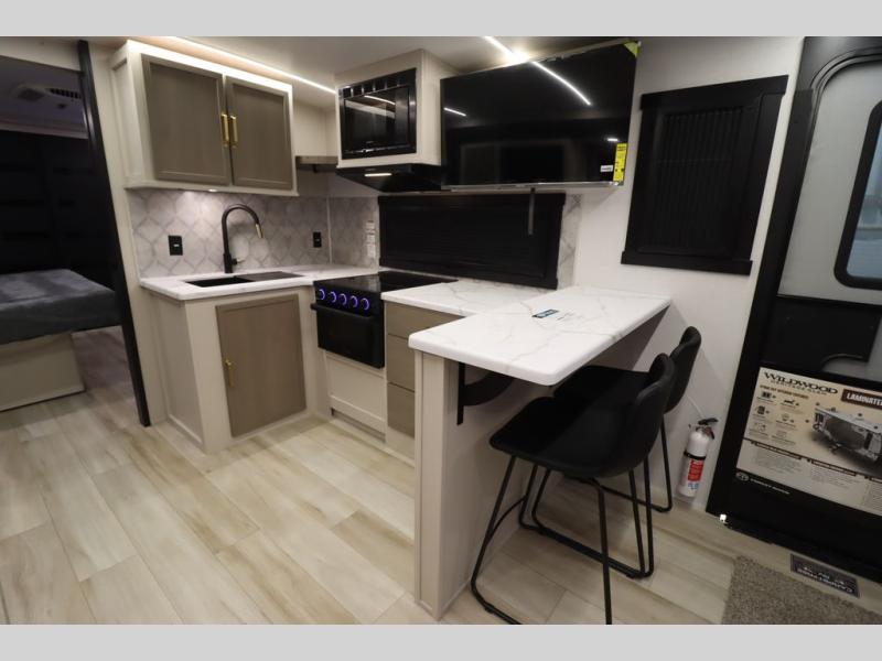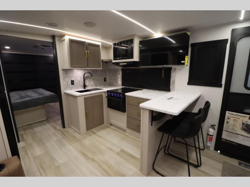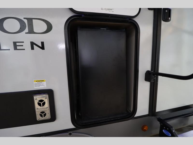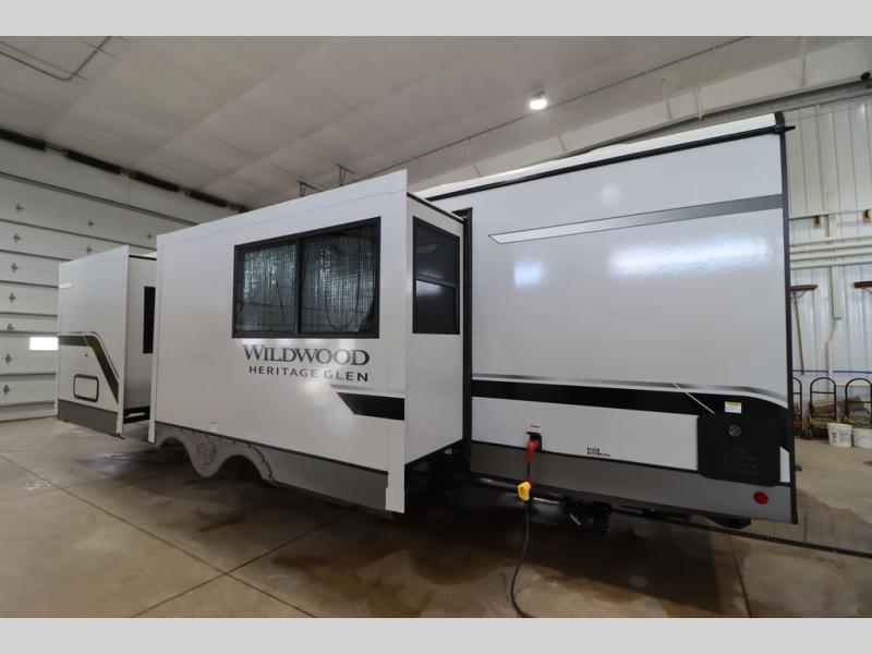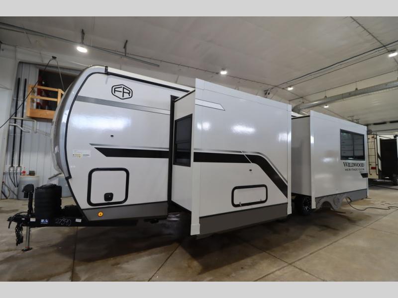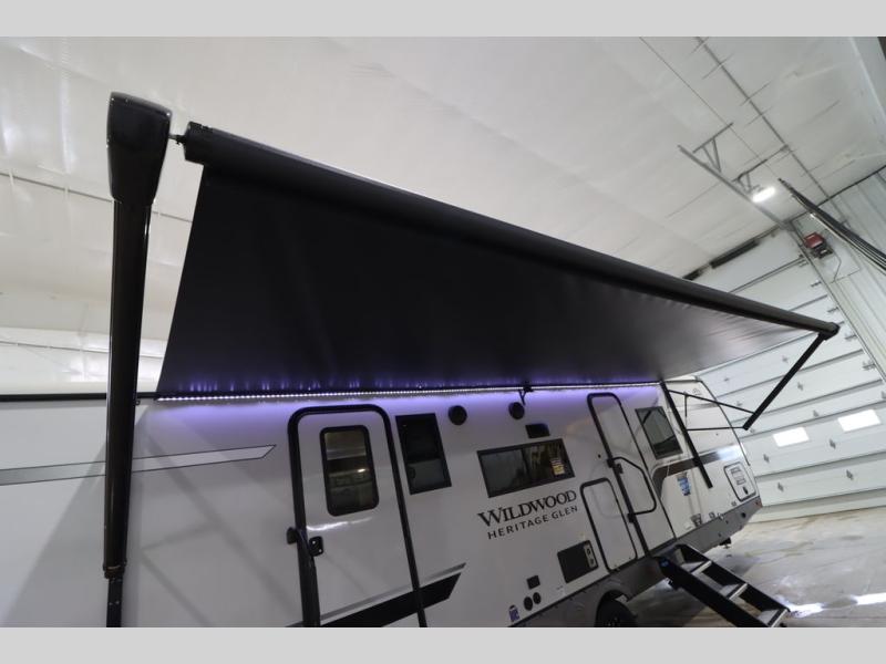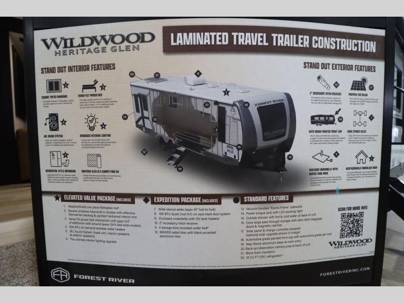 With any Wildwood Heritage Glen travel trailer by Forest River, the quality construction, attention to detail and design along with a bright and welcoming interior allows you to relax in comfort with conveniences while exploring outdoors. Each model includes a WeatherShield one piece fiberglass roof, Maxxis radial tires, and an enclosed underbelly with 12V tank heaters on all holding tanks for added protection. You will appreciate the on-demand tankless water heater, along with the 15K BTU Quite Cool A/C and 50 Amp service with a brace for a second A/C. There is an outside shower with hot and cold water, solar prep, a power tongue jack, plus many more exterior conveniences. Head inside to enjoy matte gold hardware, wood door casings in place of plastic door casings, and full length barreled ceilings for additional head room.
