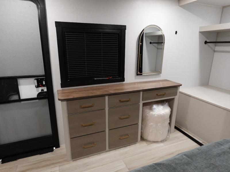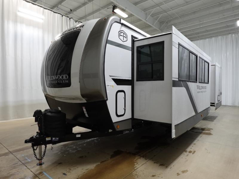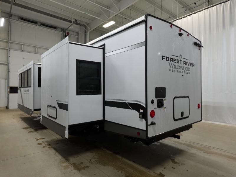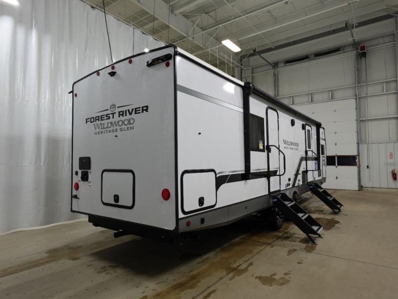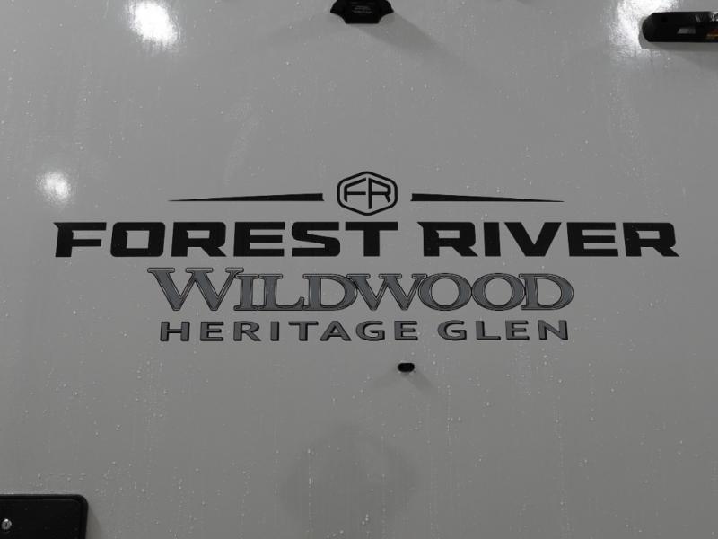 With any Wildwood Heritage Glen travel trailer by Forest River, the quality construction, attention to detail and design along with a bright and welcoming interior allows you to relax in comfort with conveniences while exploring outdoors. Each model includes a WeatherShield one piece fiberglass roof, Maxxis radial tires, and an enclosed underbelly with 12V tank heaters on all holding tanks for added protection. You will appreciate the on-demand tankless water heater, along with the 15K BTU Quite Cool A/C and 50 Amp service with a brace for a second A/C. There is an outside shower with hot and cold water, solar prep, a power stabilizer and tongue jack, plus many more exterior conveniences. Head inside to enjoy matte gold hardware, wood door casings in place of plastic door casings, and full length barreled ceilings for additional head room.