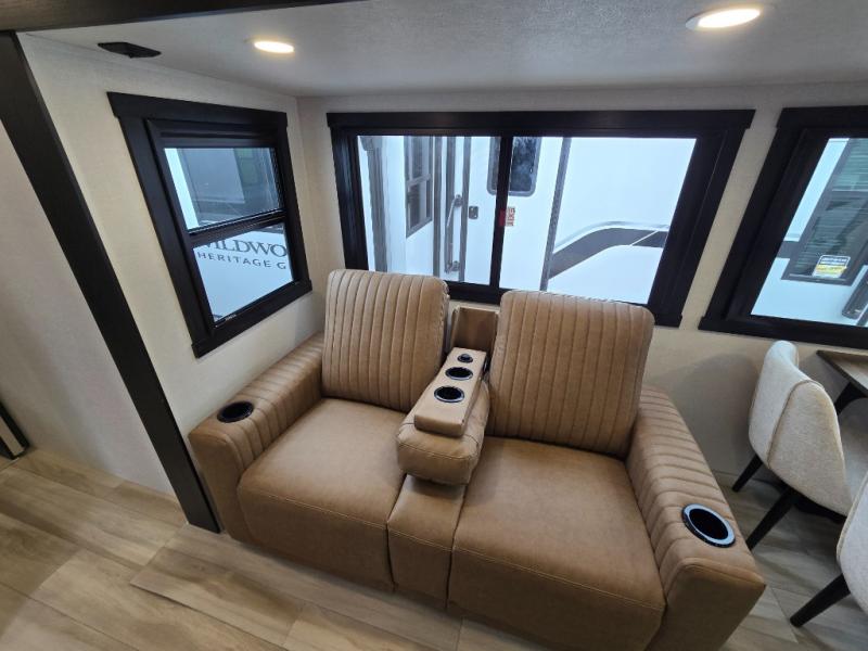 Your family and friends will enjoy each camping trip in this feature-packed Wildwood Heritage Glen travel trailer. Once you arrive at the lake, put out the 19' awning with LED lights before preparing lunch on the outside kitchen. The kids can grab the yard games out of the exterior storage compartments before stretching their legs around the campground. Your crew can get comfortable on the theater seating or the booth dinette, and the 50" LED TV and fireplace will make it feel more like home. The chef of the family will love the extra counter space in the front kitchen as well as a pantry to store dry goods and a 10 cu. ft. 12V refrigerator to keep the gang fed all week. The dual-entry bath will create a rear master suite that you are sure to love. Easily store all your clothes in the large wardrobe or in the dresser, and then fall back on the 66" x 80" custom king bed. You even have your own exterior entry door for convenience and washer/dryer prep!
