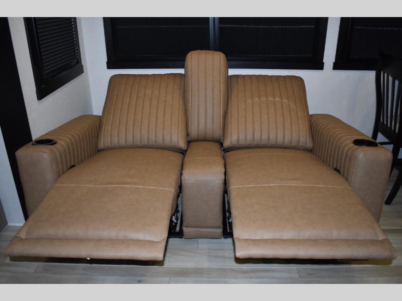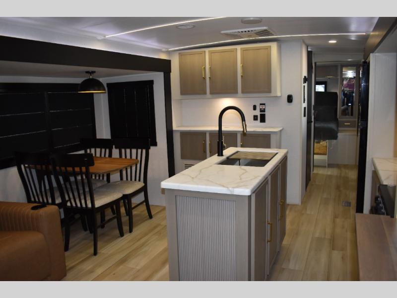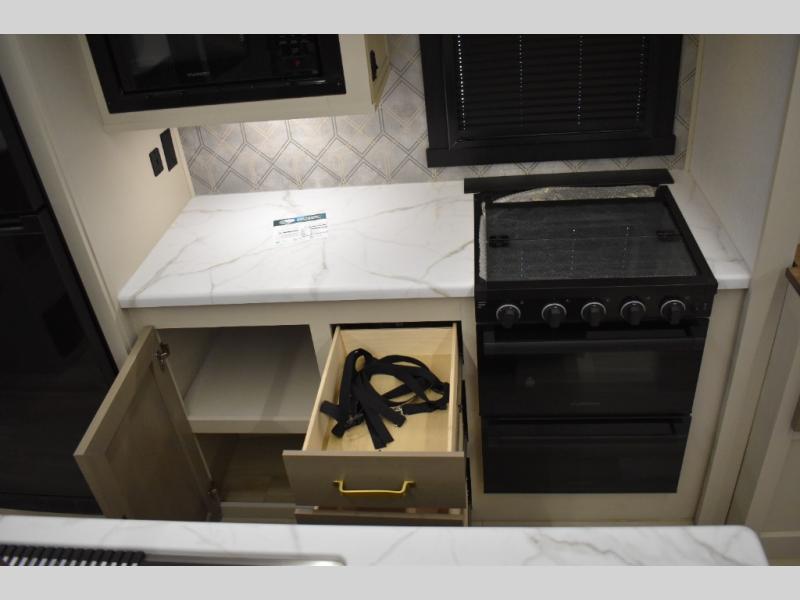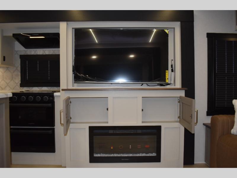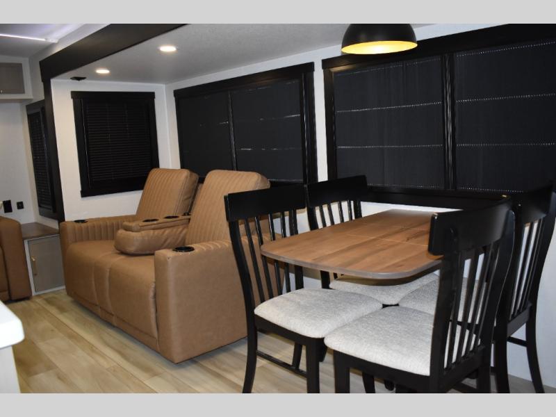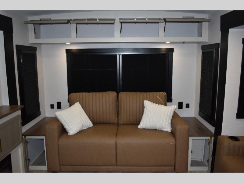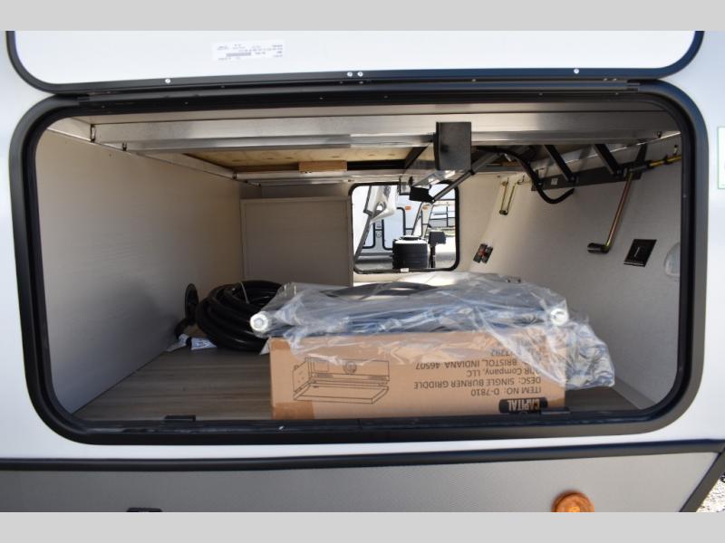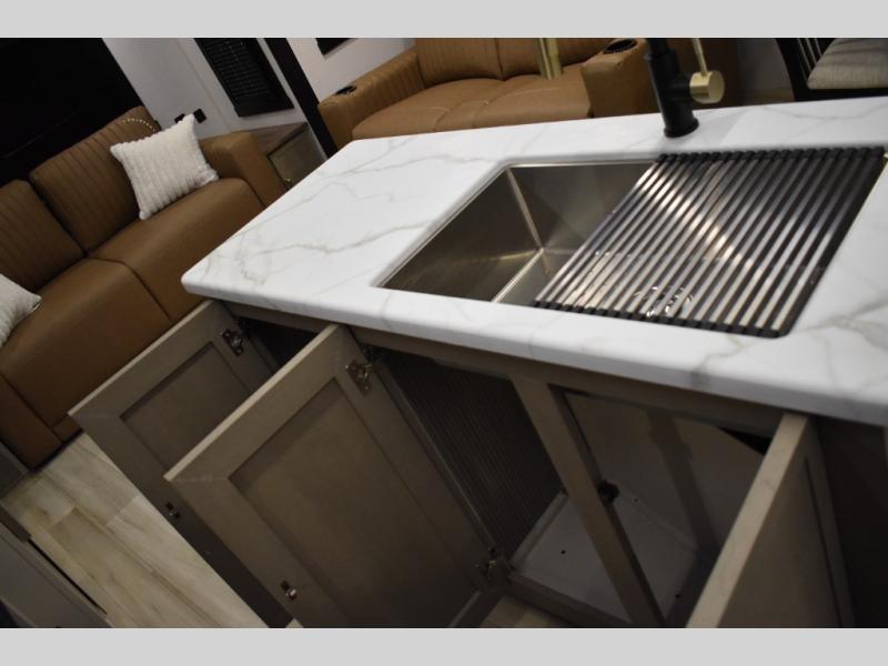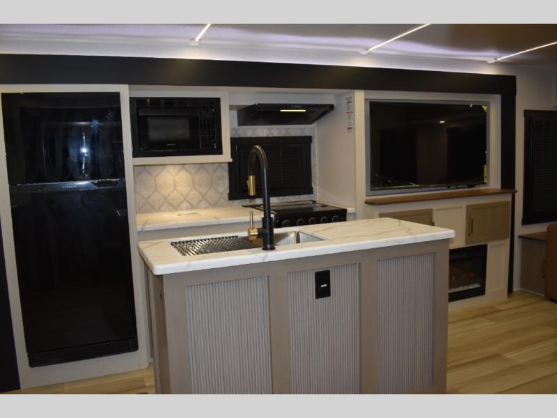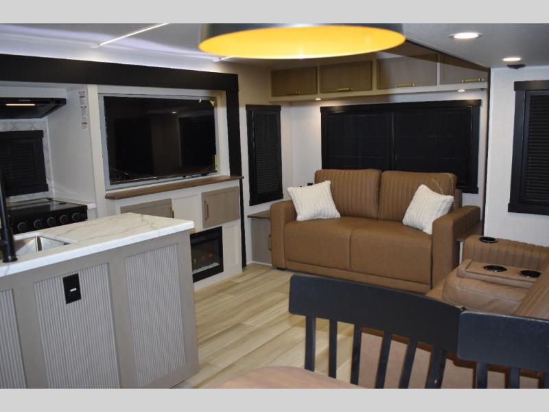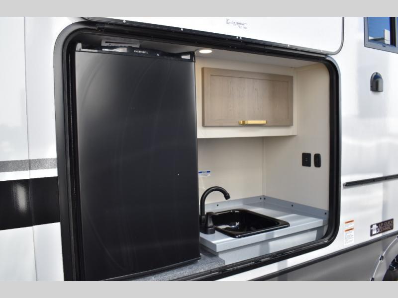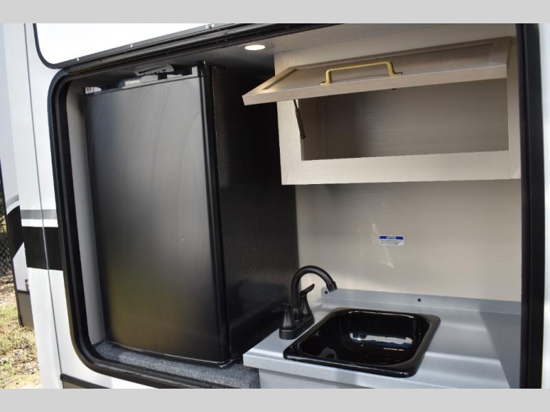 It's time to head to your destination with this Wildwood Heritage Glen travel trailer, whether it be a state park, RV resort, or your own land. Once you arrive, you can easily open up the dual opposing slides for more interior space and start planning your day. You might like to cook a meal, wash dishes using the kitchen island, and dine at the booth dinette, or you can choose the free-standing table option instead. Your guests may choose to relax in the theatre seats or the tri-fold sofa while watching TV, and the outside kitchen/bar will surely be a useful area when wanting to be outside. Don't worry about storage because the extra large pass-through compartment is available for your camping chairs, tables, fishing rods, and such.