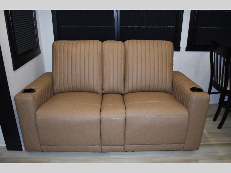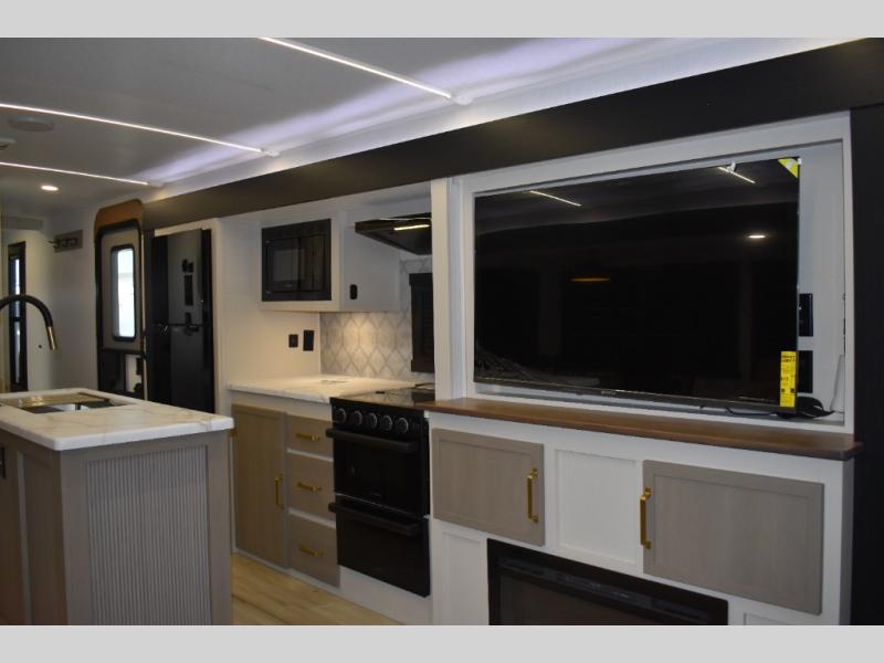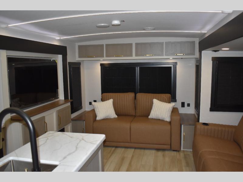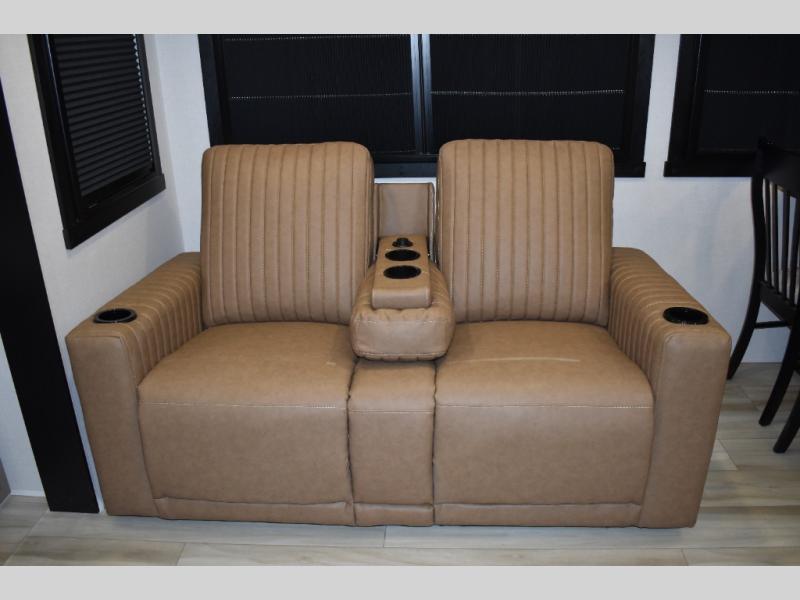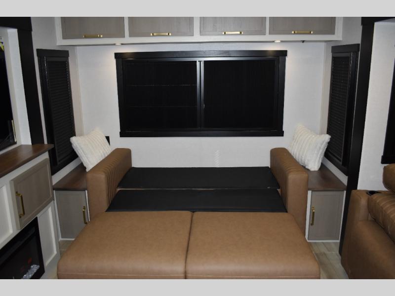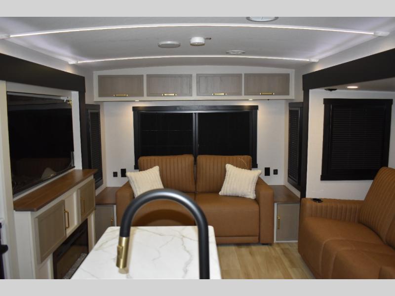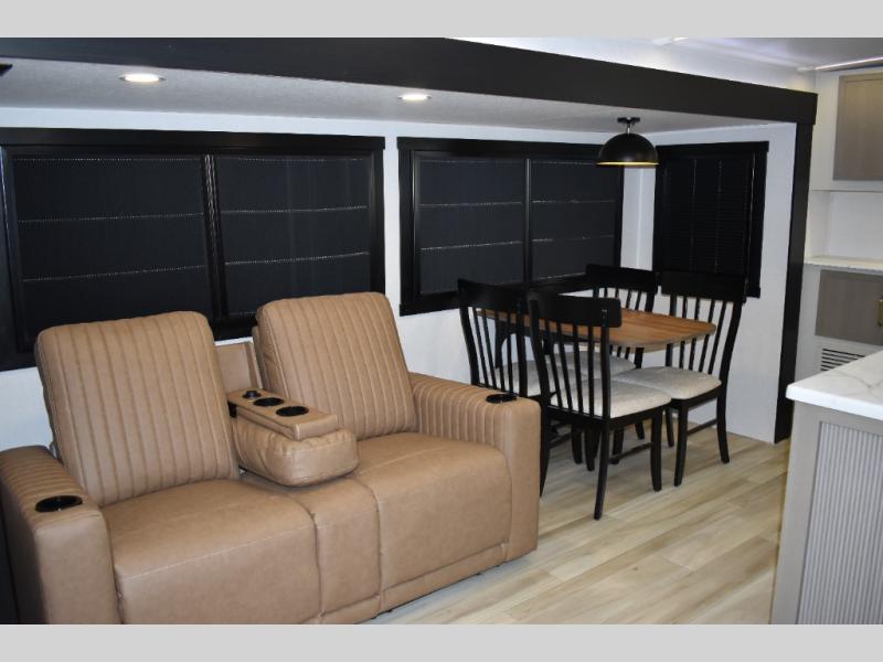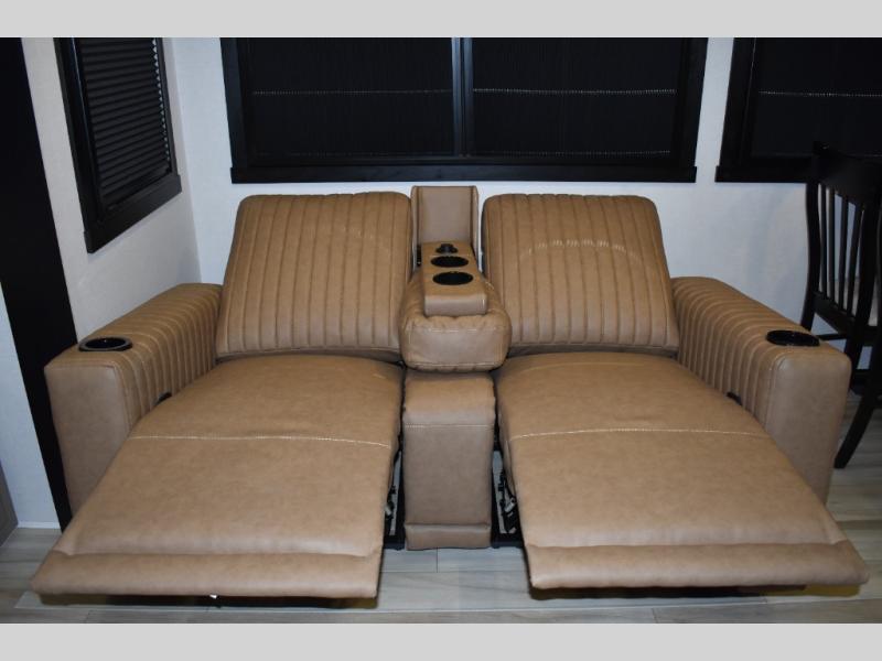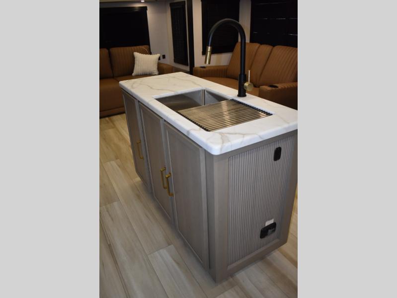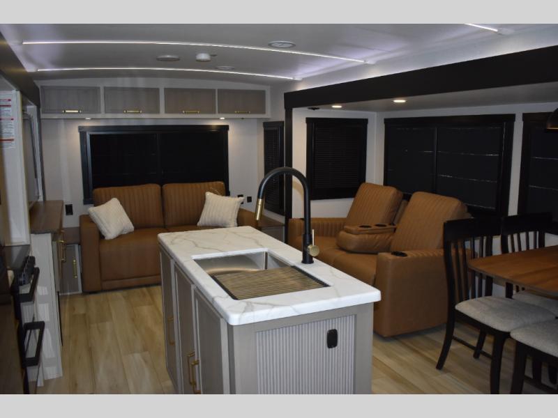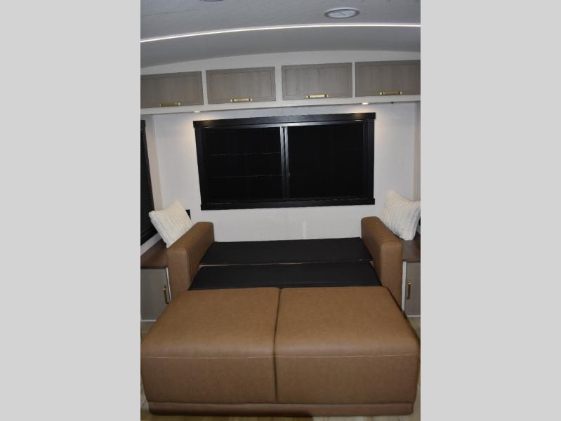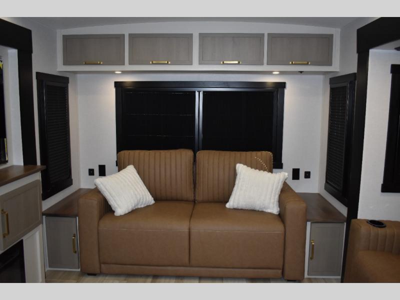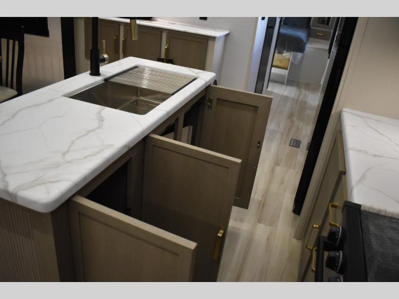 It's time to head to your destination with this Wildwood Heritage Glen travel trailer, whether it be a state park, RV resort, or your own land. Once you arrive, you can easily open up the dual opposing slides for more interior space and start planning your day. You might like to cook a meal, wash dishes using the kitchen island, and dine at the booth dinette, or you can choose the free-standing table option instead. Your guests may choose to relax in the theatre seats or the tri-fold sofa while watching TV, and the outside kitchen/bar will surely be a useful area when wanting to be outside. Don't worry about storage because the extra large pass-through compartment is available for your camping chairs, tables, fishing rods, and such.