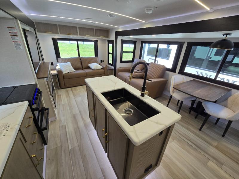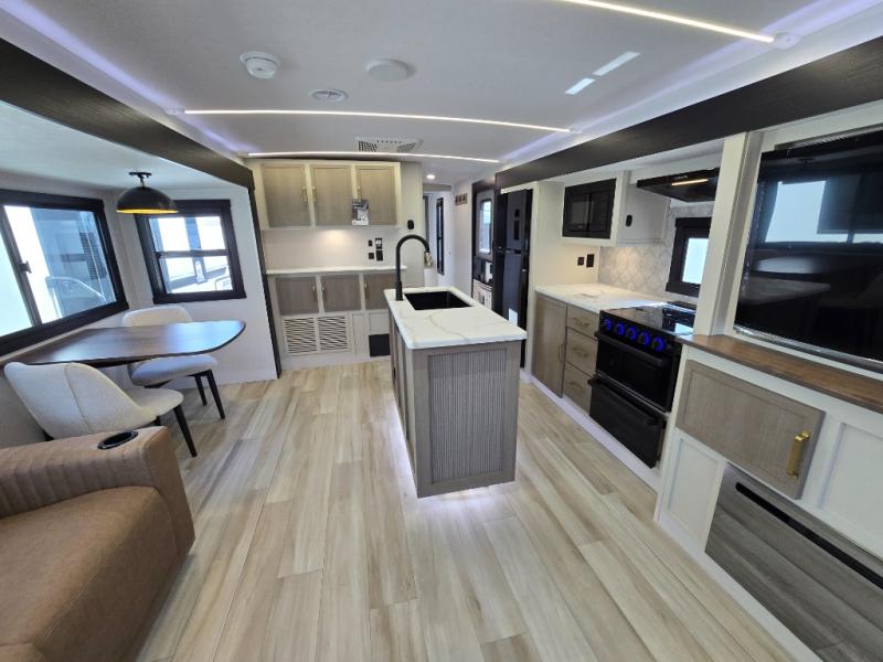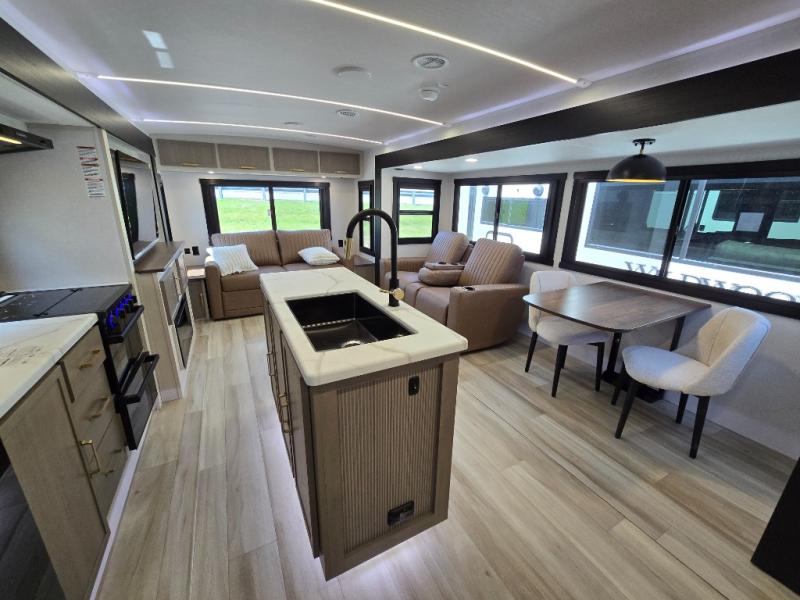 It's time to head to your destination with this Wildwood Heritage Glen travel trailer, whether it be a state park, RV resort, or your own land. Once you arrive, you can easily open up the dual opposing slides for more interior space and start planning your day. You might like to cook a meal, wash dishes using the kitchen island, and dine at the booth dinette, or you can choose the free-standing table option instead. Your guests may choose to relax in the theatre seats or the tri-fold sofa while watching TV, and the outside kitchen/bar will surely be a useful area when wanting to be outside. Don't worry about storage because the extra large pass-through compartment is available for your camping chairs, tables, fishing rods, and such.