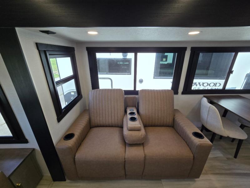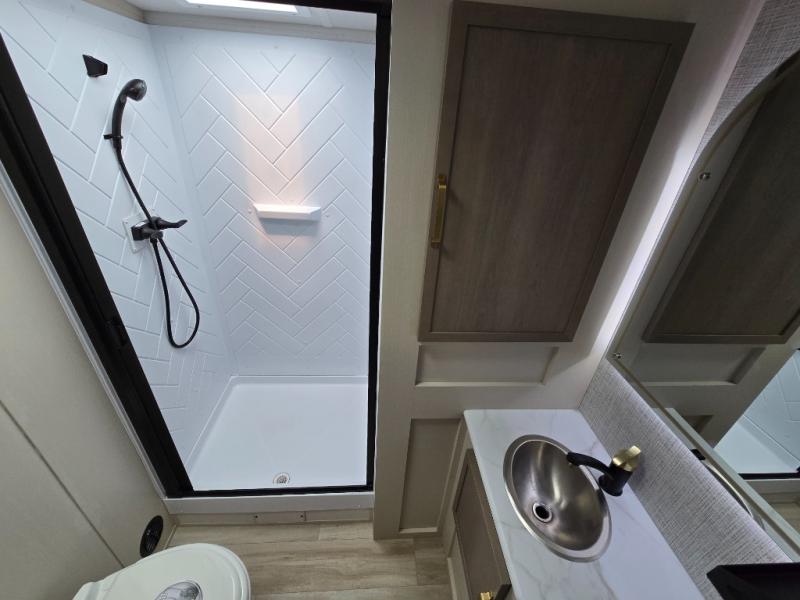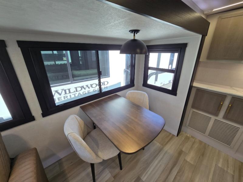 With any Wildwood Heritage Glen travel trailer by Forest River, the quality construction, attention to detail and design along with a bright and welcoming interior allows you to relax in comfort with conveniences while exploring outdoors. Each model includes a WeatherShield one piece fiberglass roof, Maxxis radial tires, and an enclosed underbelly with 12V tank heaters on all holding tanks for added protection. You will appreciate the on-demand tankless water heater, along with the 15K BTU Quite Cool A/C and 50 Amp service with a brace for a second A/C. There is an outside shower with hot and cold water, solar prep, a power tongue jack, plus many more exterior conveniences. Head inside to enjoy matte gold hardware, wood door casings in place of plastic door casings, and full length barreled ceilings for additional head room.