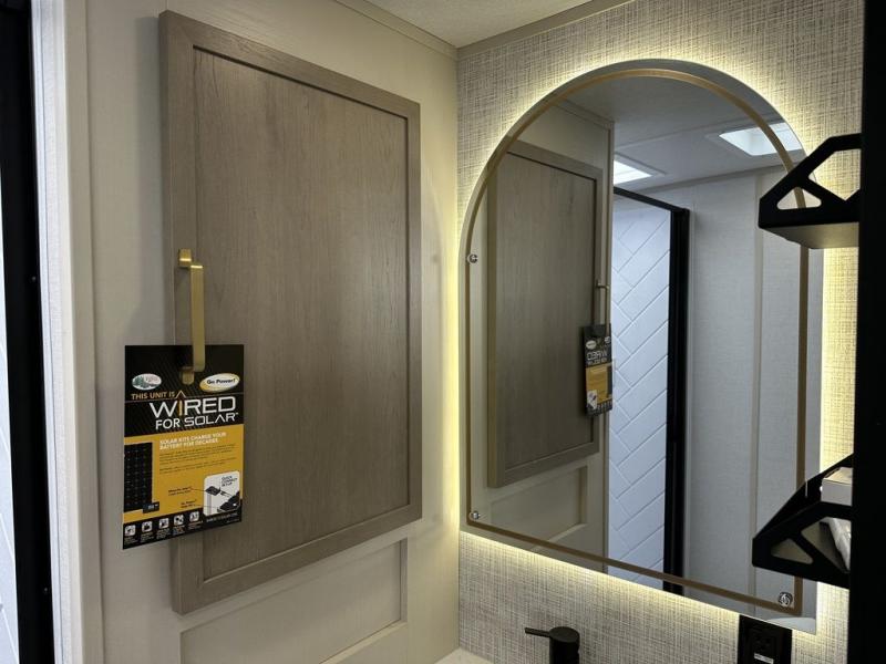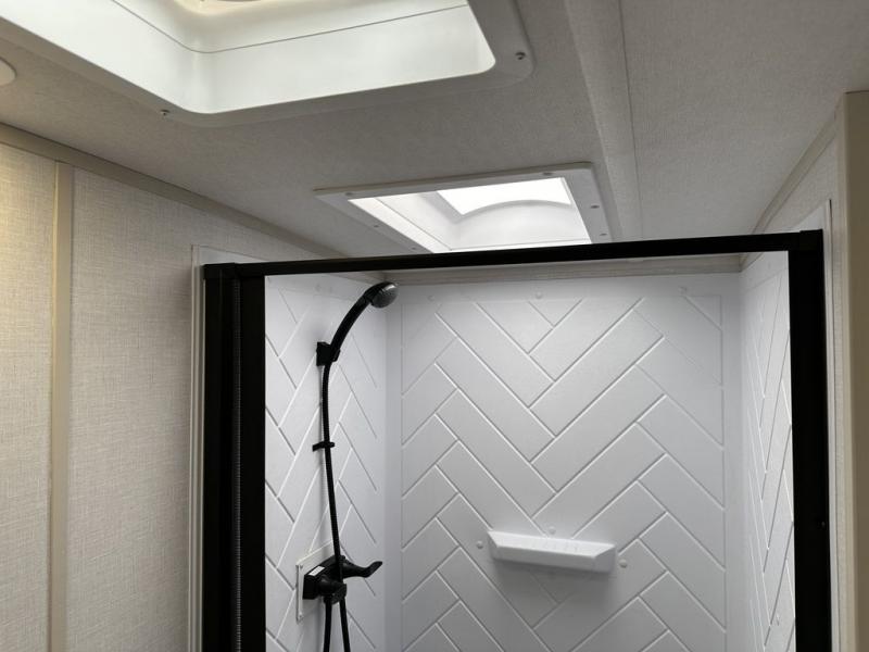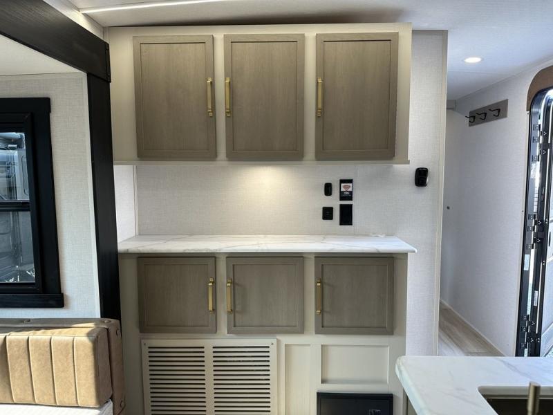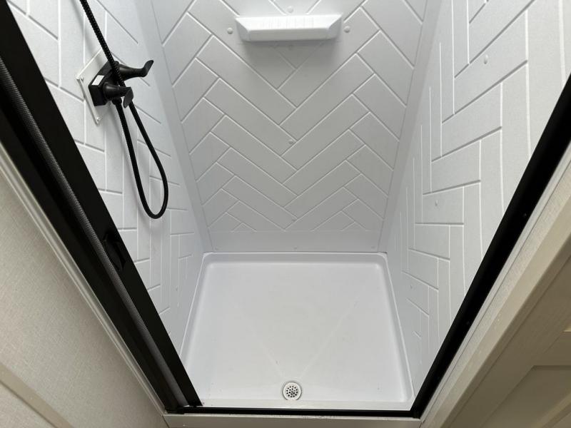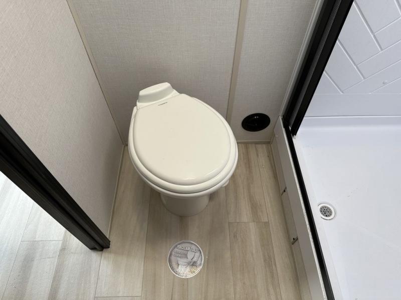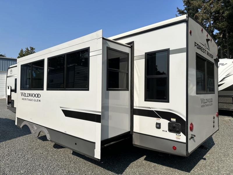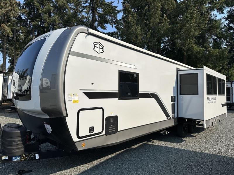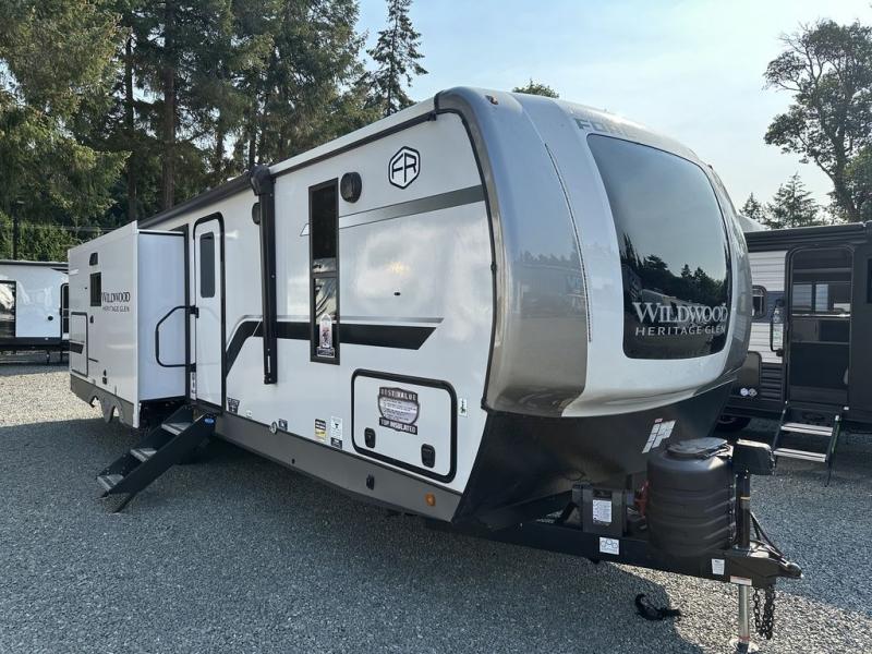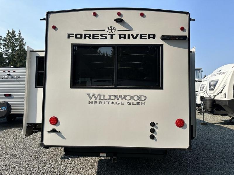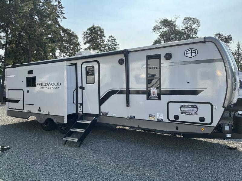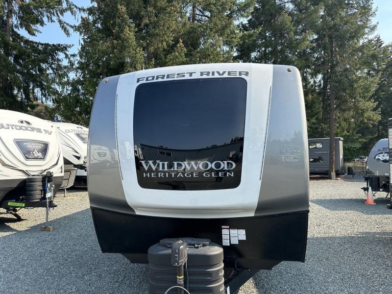 With any Wildwood Heritage Glen travel trailer by Forest River, the quality construction, attention to detail and design along with a bright and welcoming interior allows you to relax in comfort with conveniences while exploring outdoors. Each model includes a WeatherShield one piece fiberglass roof, Maxxis radial tires, and an enclosed underbelly with 12V tank heaters on all holding tanks for added protection. You will appreciate the on-demand tankless water heater, along with the 15K BTU Quite Cool A/C and 50 Amp service with a brace for a second A/C. There is an outside shower with hot and cold water, solar prep, a power tongue jack, plus many more exterior conveniences. Head inside to enjoy matte gold hardware, wood door casings in place of plastic door casings, and full length barreled ceilings for additional head room.
