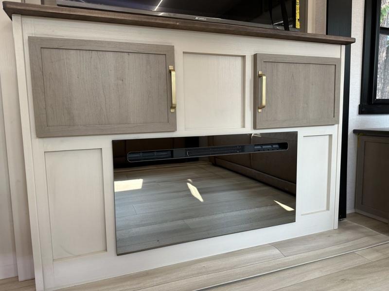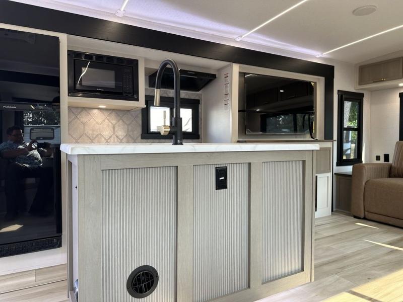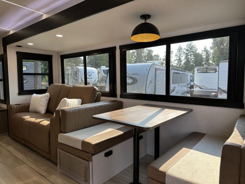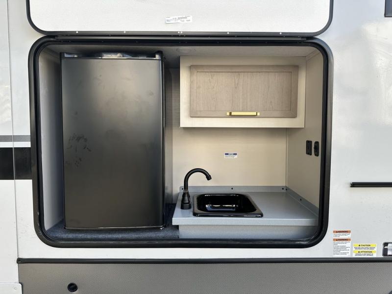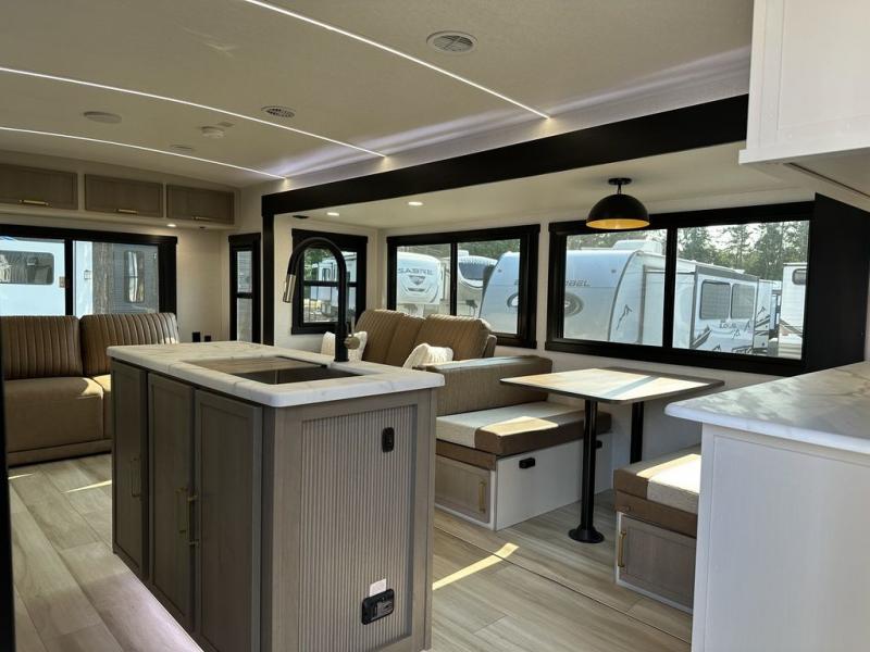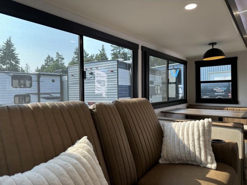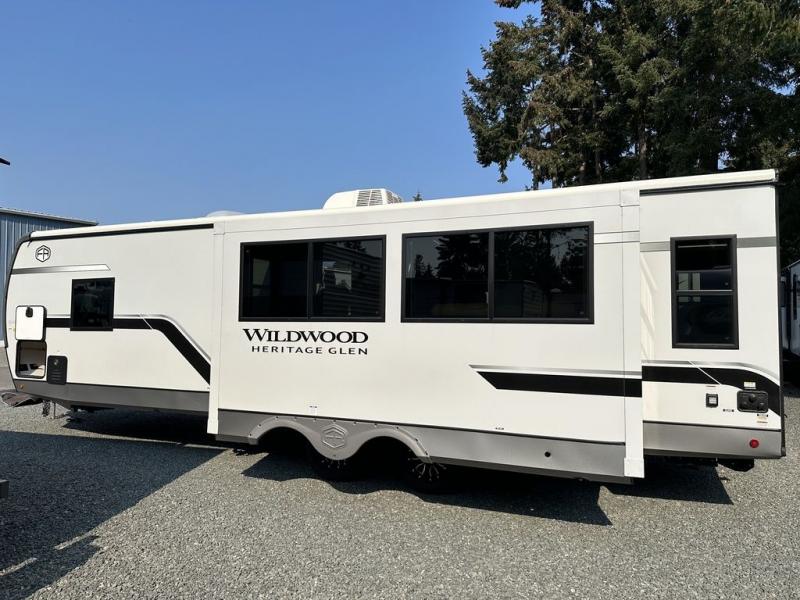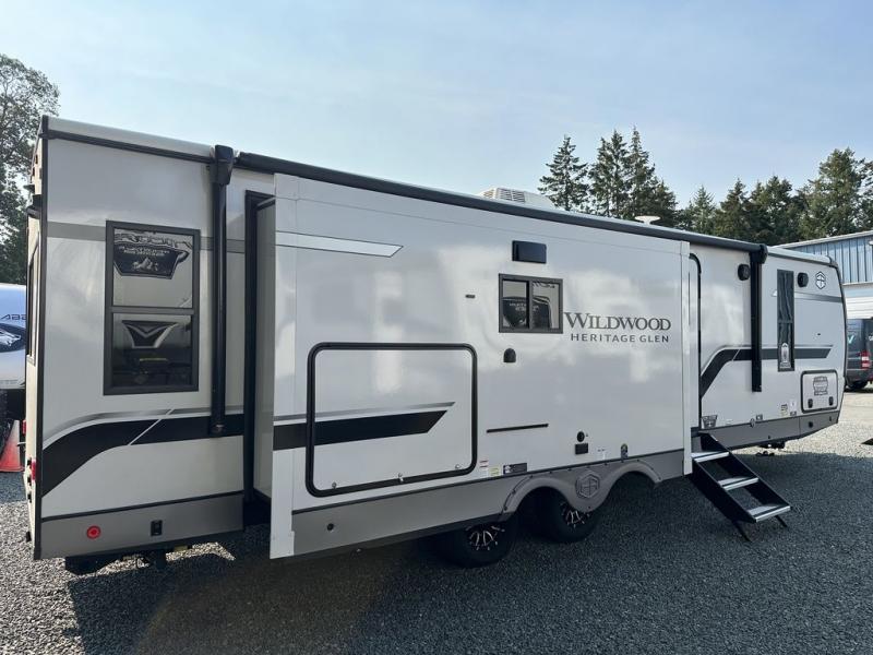 It's time to head to your destination with this Wildwood Heritage Glen travel trailer, whether it be a state park, RV resort, or your own land. Once you arrive, you can easily open up the dual opposing slides for more interior space and start planning your day. You might like to cook a meal, wash dishes using the kitchen island, and dine at the booth dinette, or you can choose the free-standing table option instead. Your guests may choose to relax in the theatre seats or the tri-fold sofa while watching TV, and the outside kitchen/bar will surely be a useful area when wanting to be outside. Don't worry about storage because the extra large pass-through compartment is available for your camping chairs, tables, fishing rods, and such.