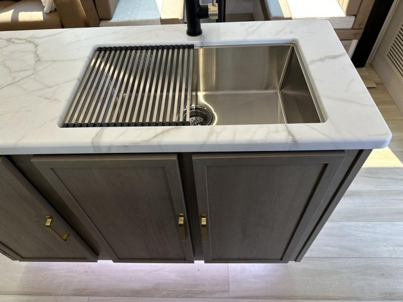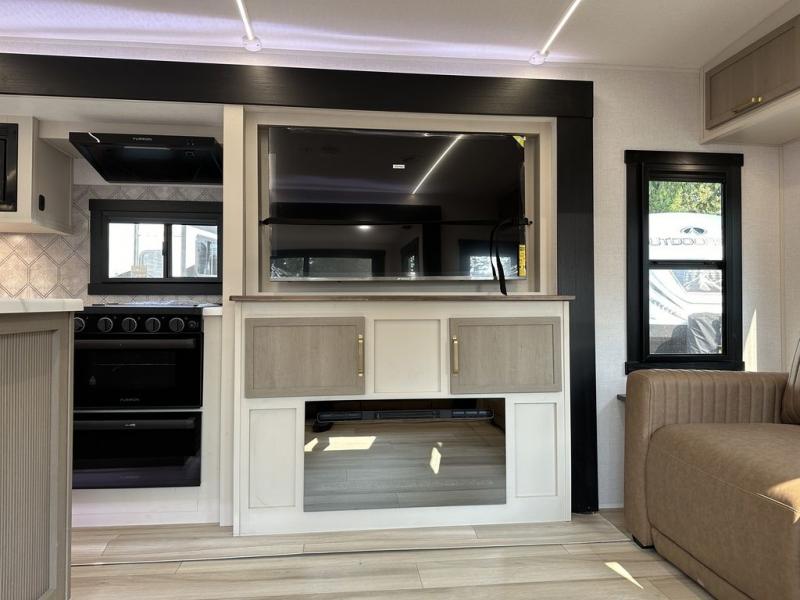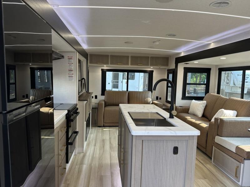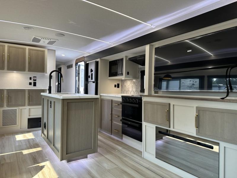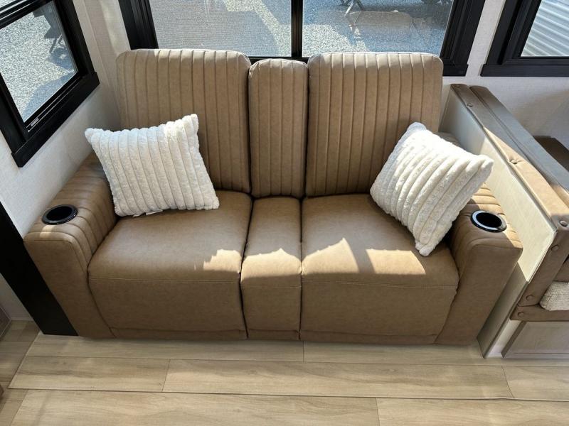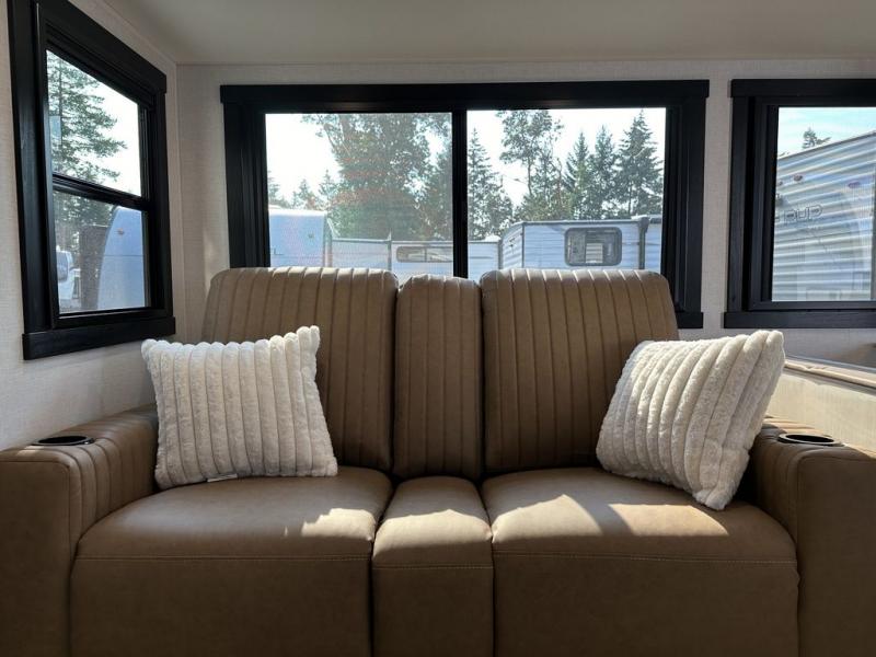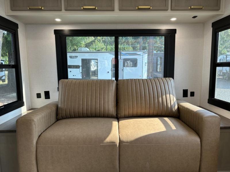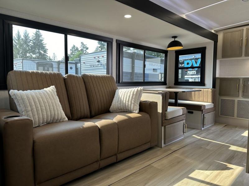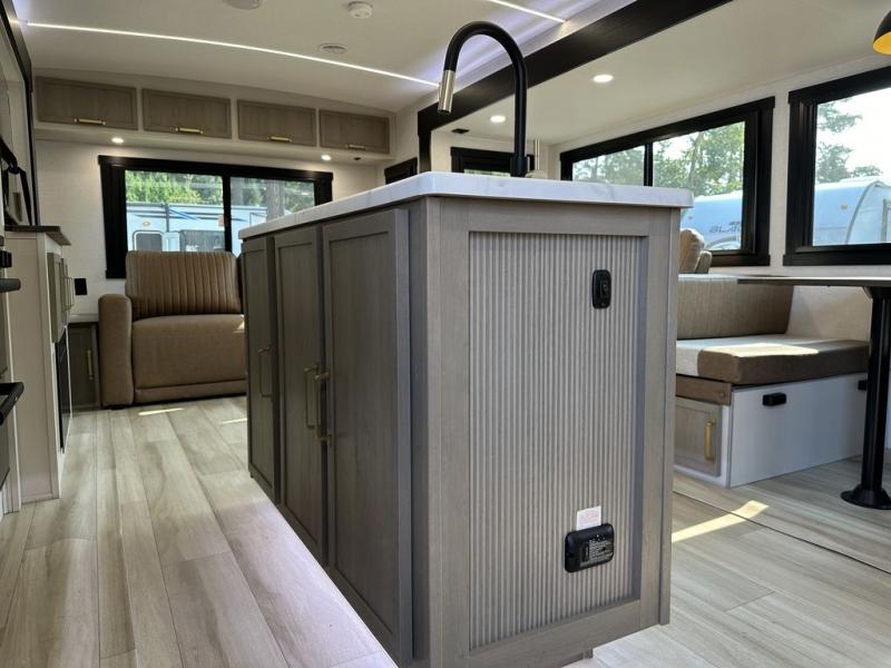 It's time to head to your destination with this Wildwood Heritage Glen travel trailer, whether it be a state park, RV resort, or your own land. Once you arrive, you can easily open up the dual opposing slides for more interior space and start planning your day. You might like to cook a meal, wash dishes using the kitchen island, and dine at the booth dinette, or you can choose the free-standing table option instead. Your guests may choose to relax in the theatre seats or the tri-fold sofa while watching TV, and the outside kitchen/bar will surely be a useful area when wanting to be outside. Don't worry about storage because the extra large pass-through compartment is available for your camping chairs, tables, fishing rods, and such.