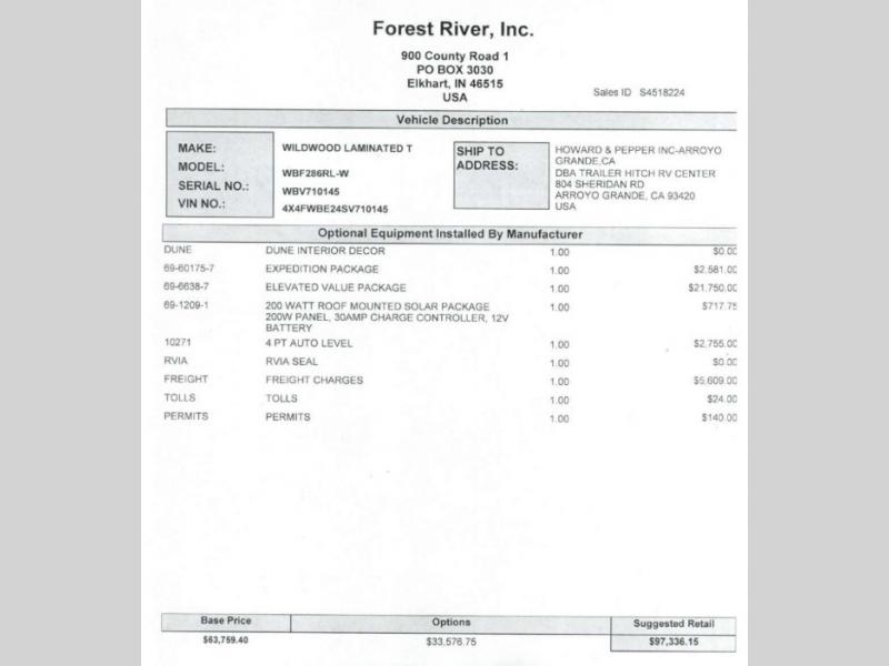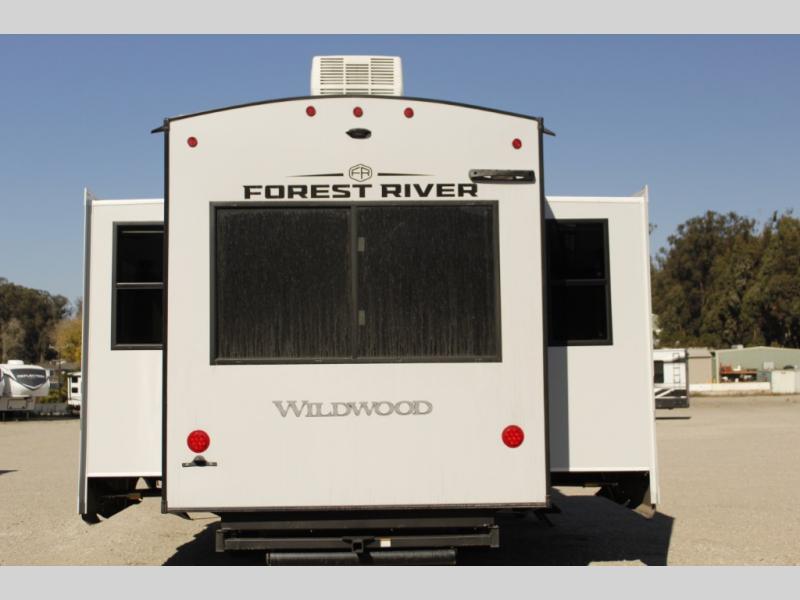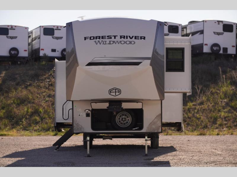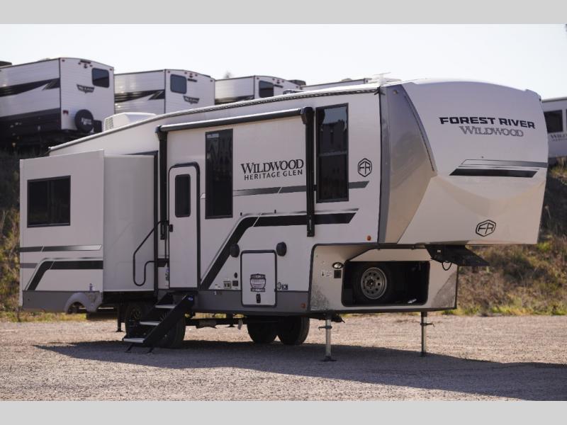 With any Wildwood Heritage Glen fifth wheel by Forest River, the quality construction, attention to detail and design along with a bright and welcoming interior allows you to relax in comfort with conveniences while exploring outdoors. The Summer Wind colored horizontal plank linoleum flooring is unique, beautiful and durable, and there are gold-accented faucets with stainless steel sinks in the bathrooms for added luxury. The Accessibelly underbelly with 12V tank heaters on all holding tanks allows you to camp anytime of year, and the power stabilizer jacks and landing gear will make set-up a breeze. More features that provide convenience include the high-end solid surface countertops, an RV Airflow System that provides at least 25% better airflow, and solar prep for off-grid capabilities.