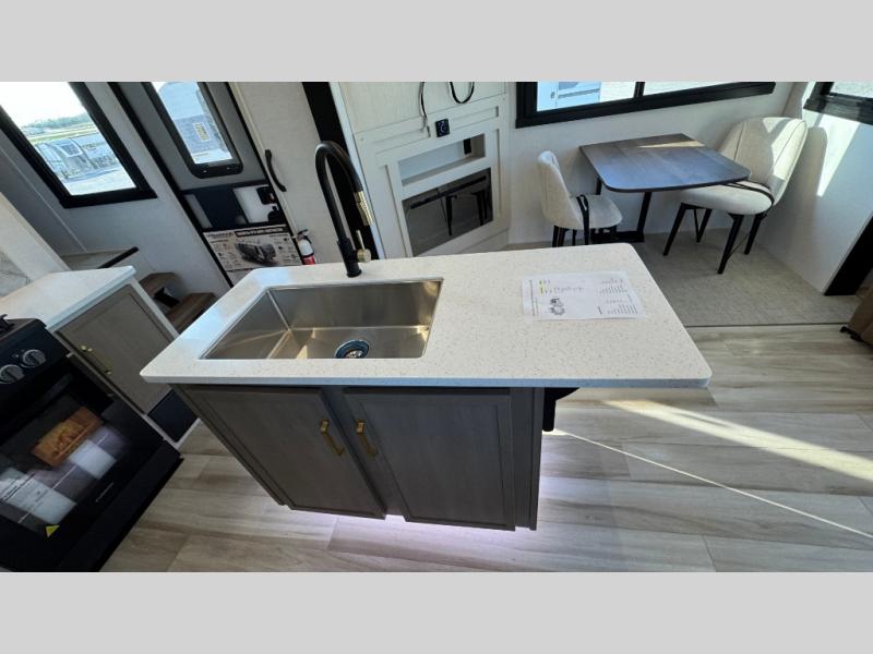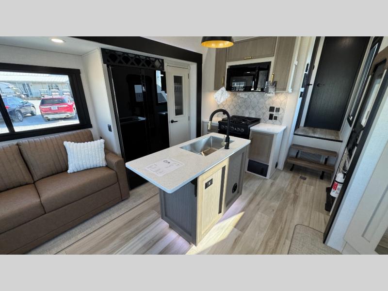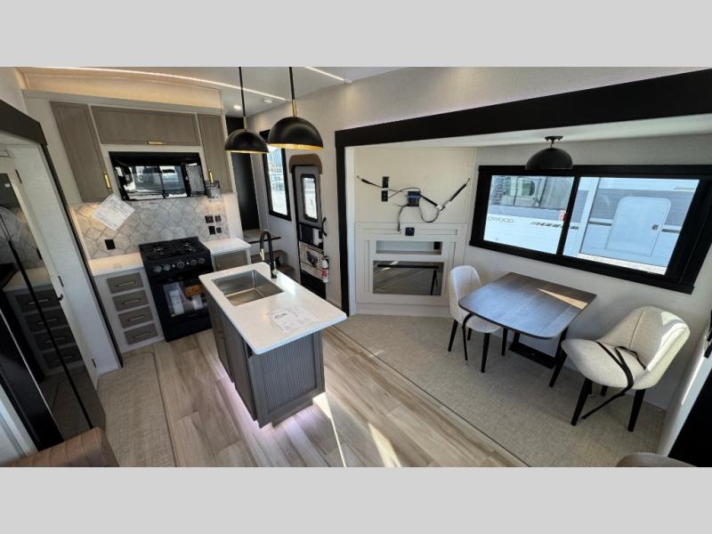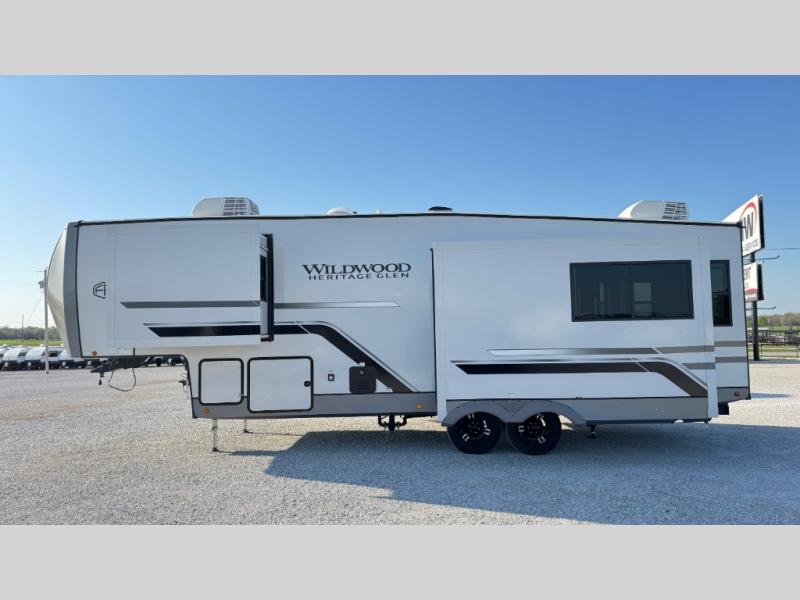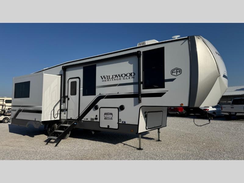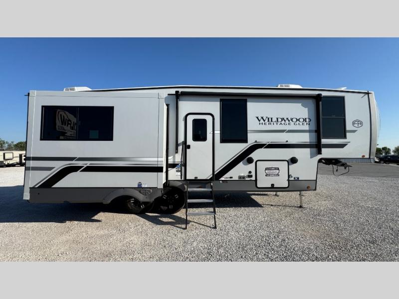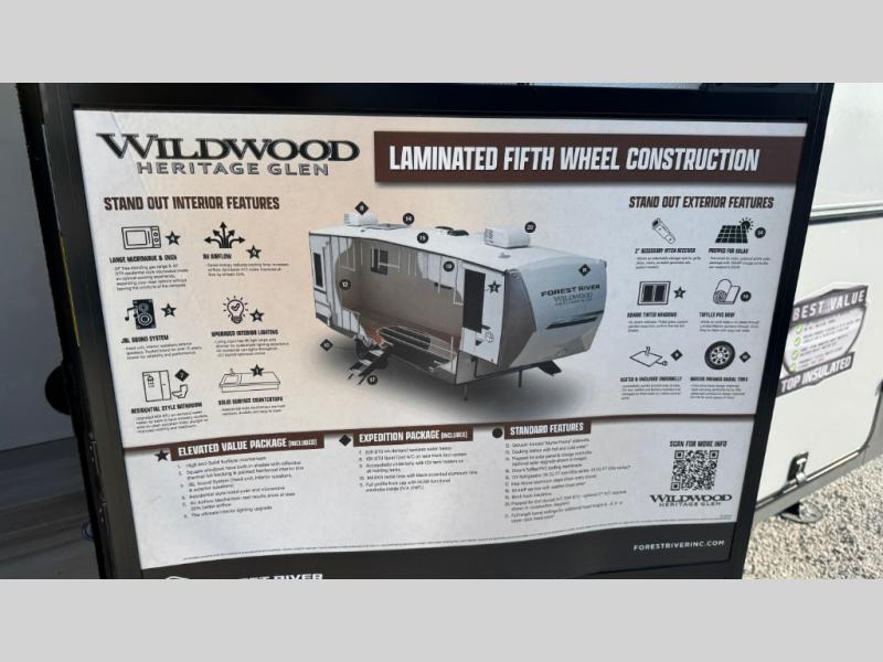 With any Wildwood Heritage Glen fifth wheel by Forest River, the quality construction, attention to detail and design along with a bright and welcoming interior allows you to relax in comfort with conveniences while exploring outdoors. The Summer Wind colored horizontal plank linoleum flooring is unique, beautiful and durable, and there are gold-accented faucets with stainless steel sinks in the bathrooms for added luxury. The Accessibelly underbelly with 12V tank heaters will help protect your unit from the elements, and the power stabilizer jacks and landing gear will make set-up a breeze. More features that provide convenience include the high-end solid surface countertops, an RV Airflow System that provides at least 25% better airflow, and solar prep for off-grid capabilities.