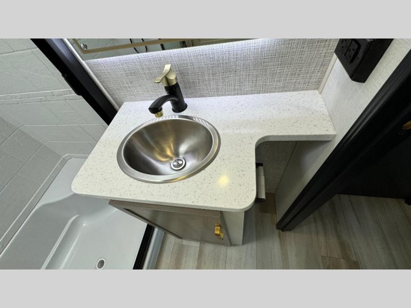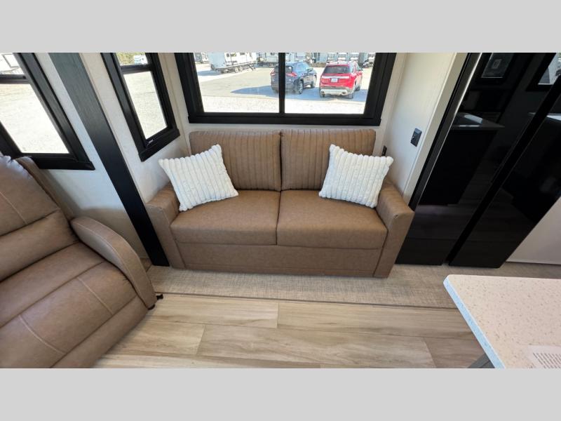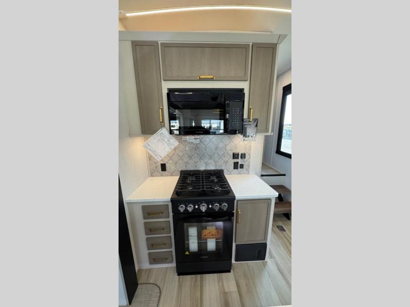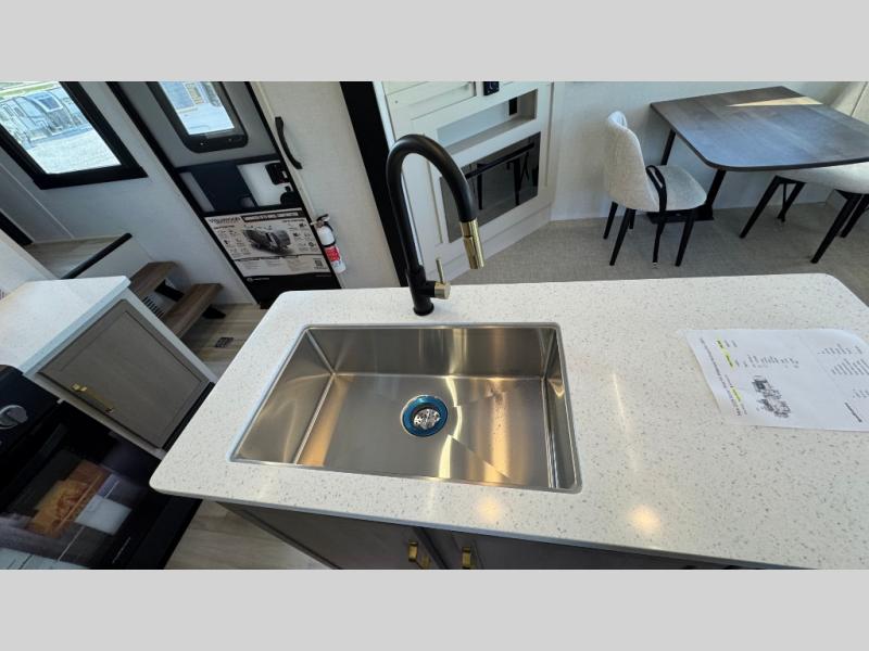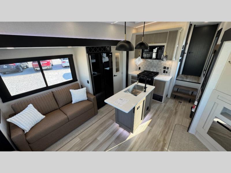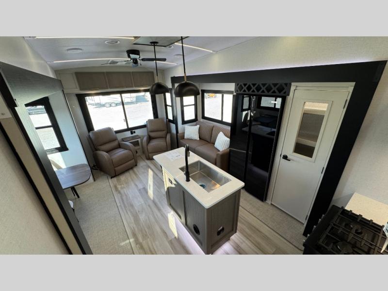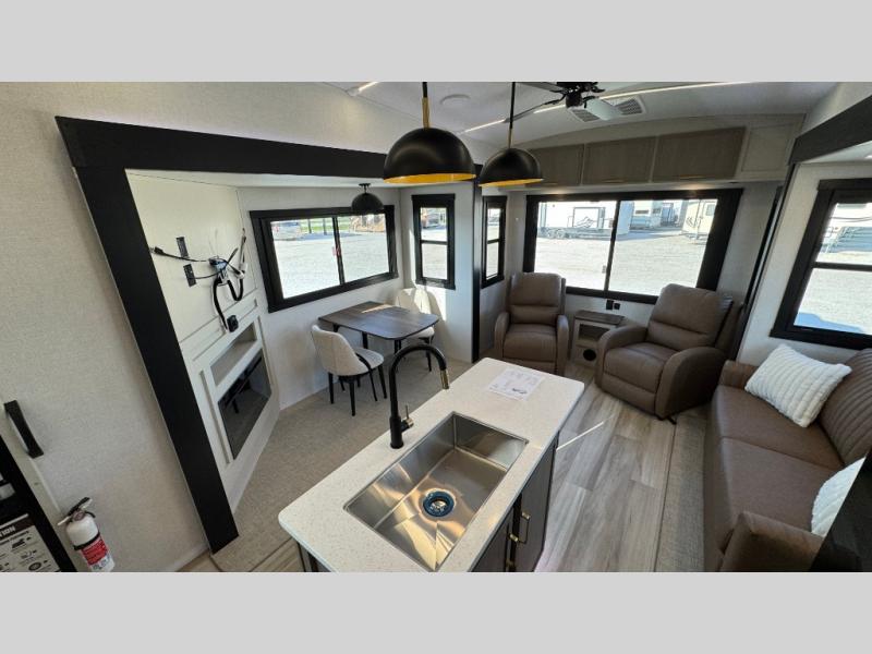 With any Wildwood Heritage Glen fifth wheel by Forest River, the quality construction, attention to detail and design along with a bright and welcoming interior allows you to relax in comfort with conveniences while exploring outdoors. The Summer Wind colored horizontal plank linoleum flooring is unique, beautiful and durable, and there are gold-accented faucets with stainless steel sinks in the bathrooms for added luxury. The Accessibelly underbelly with 12V tank heaters will help protect your unit from the elements, and the power stabilizer jacks and landing gear will make set-up a breeze. More features that provide convenience include the high-end solid surface countertops, an RV Airflow System that provides at least 25% better airflow, and solar prep for off-grid capabilities.