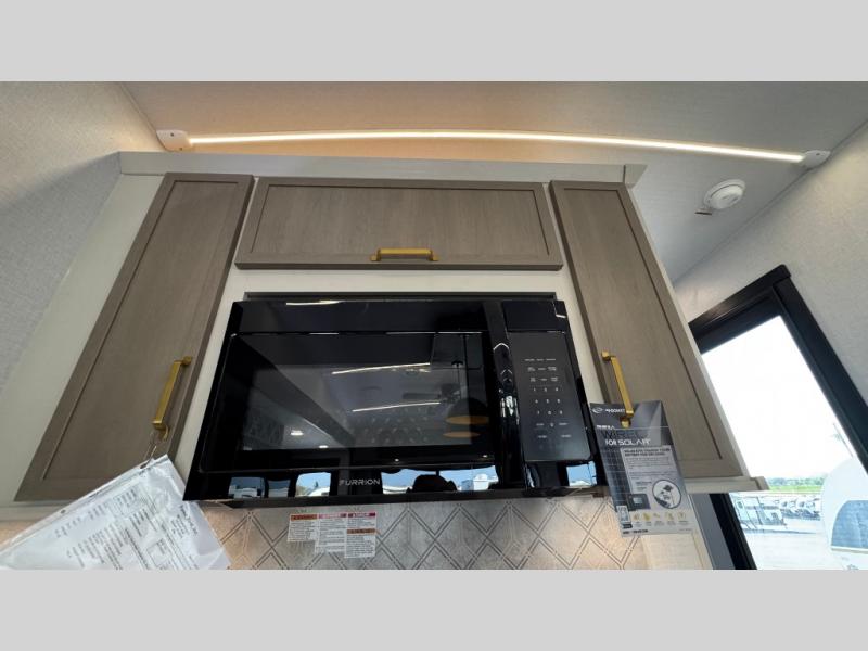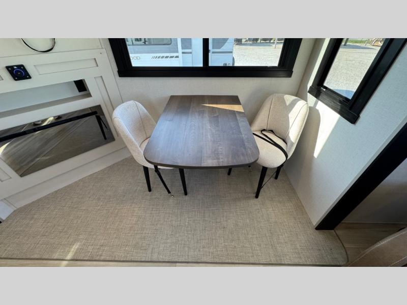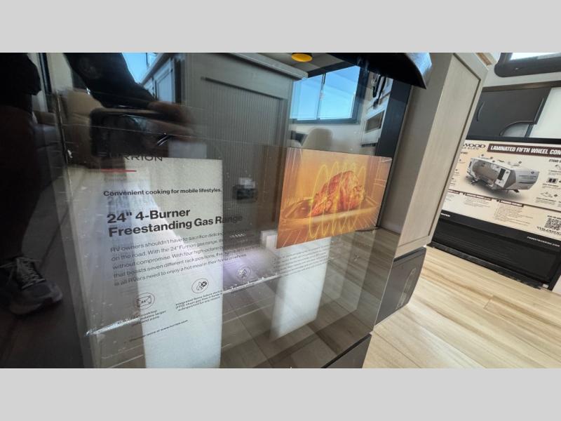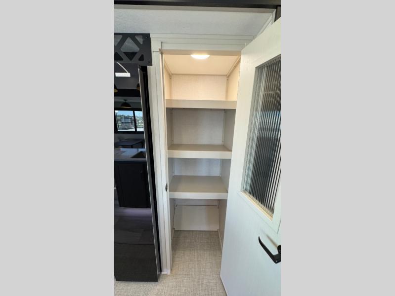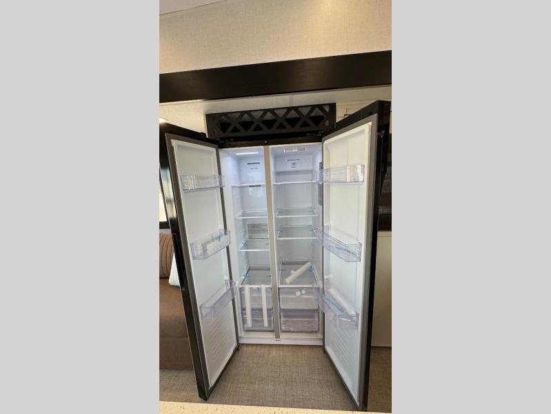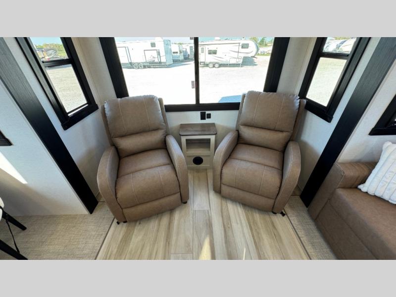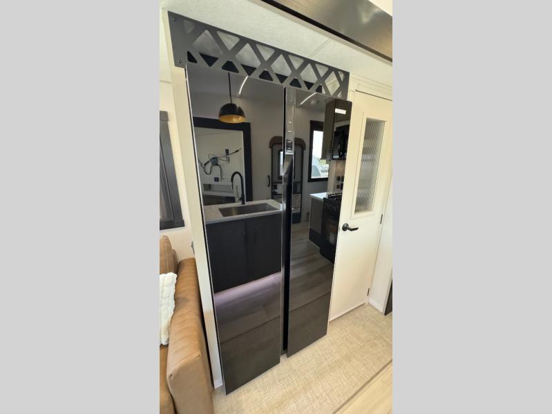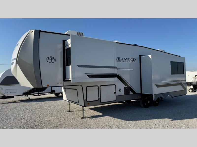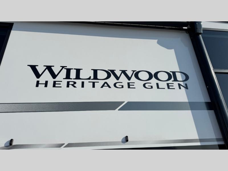 Whether you enjoy being outside or inside, this Wildwood Heritage Glen fifth wheel gives you the best of both! Imagine relaxing in a chair or on the tri-fold sofa and being able to look out panoramic windows at the scenery. Or, you might like to watch a show on the 50" LED TV with a fireplace below, and you can dine at the table and chairs that allows you to move the chairs if needed. The 16-cubic foot 12V refrigerator next to the pantry will allow you to stock up on ingredients and cold beverages for a long trip, and you will appreciate the custom king bed slide and the residential walk-in shower after being outside all day, even if just under the 13' awning. There is plenty of storage in the master bedroom and throughout, plus the XL Texas size pass-through compartment will surely come in handy for your charcoal, outdoor games, and such.