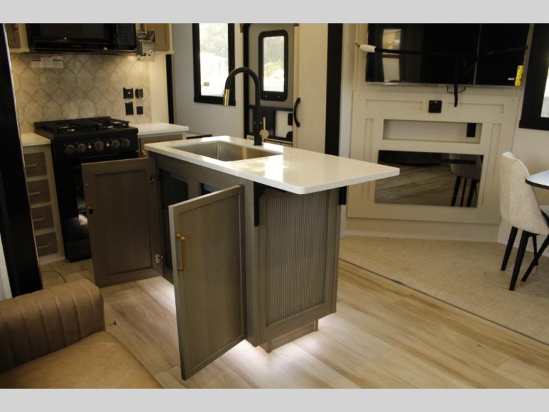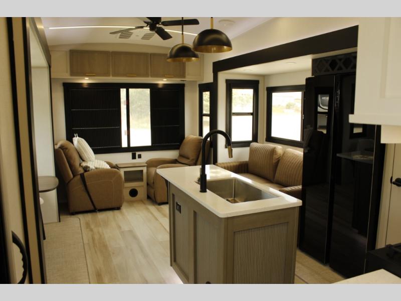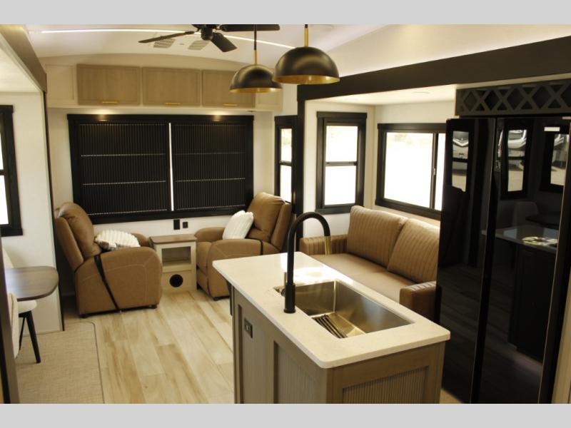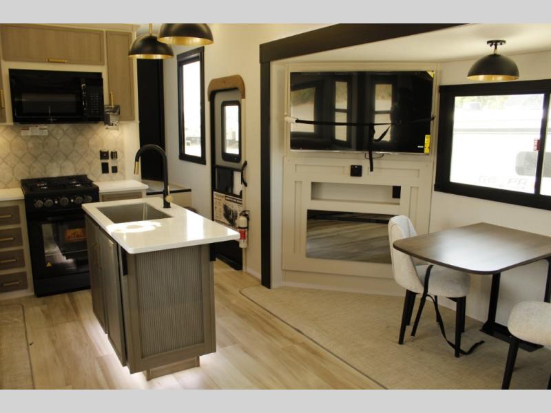 With any Wildwood Heritage Glen fifth wheel by Forest River, the quality construction, attention to detail and design along with a bright and welcoming interior allows you to relax in comfort with conveniences while exploring outdoors. The Summer Wind colored horizontal plank linoleum flooring is unique, beautiful and durable, and there are gold-accented faucets with stainless steel sinks in the bathrooms for added luxury. The Accessibelly underbelly with 12V tank heaters will help protect your unit from the elements, and the power stabilizer jacks and landing gear will make set-up a breeze. More features that provide convenience include the high-end solid surface countertops, an RV Airflow System that provides at least 25% better airflow, and solar prep for off-grid capabilities.
