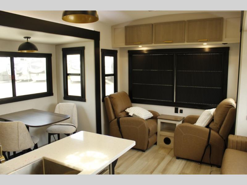 Whether you enjoy being outside or inside, this Wildwood Heritage Glen fifth wheel gives you the best of both! Imagine relaxing in a chair or on the tri-fold sofa and being able to look out panoramic windows at the scenery. Or, you might like to watch a show on the 50" LED TV with a fireplace below, and you can dine at the table and chairs that allows you to move the chairs if needed. The 16-cubic foot 12V refrigerator next to the pantry will allow you to stock up on ingredients and cold beverages for a long trip, and you will appreciate the custom king bed slide and the residential walk-in shower after being outside all day, even if just under the 13' awning. There is plenty of storage in the master bedroom and throughout, plus the XL Texas size pass-through compartment will surely come in handy for your charcoal, outdoor games, and such.