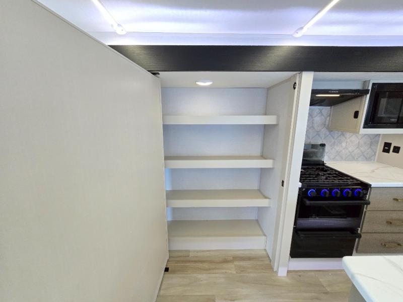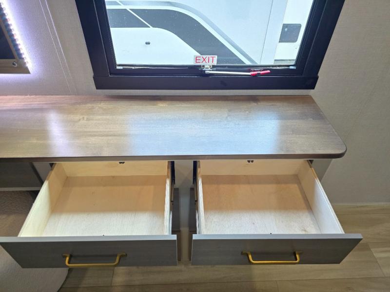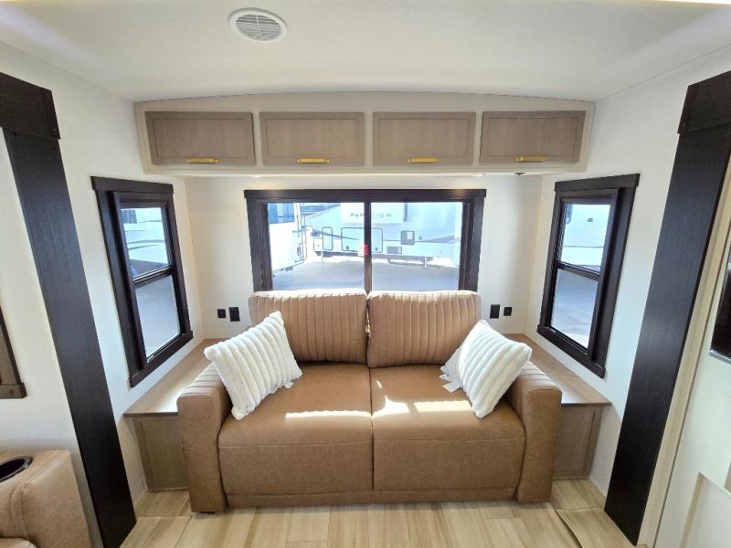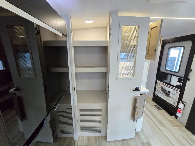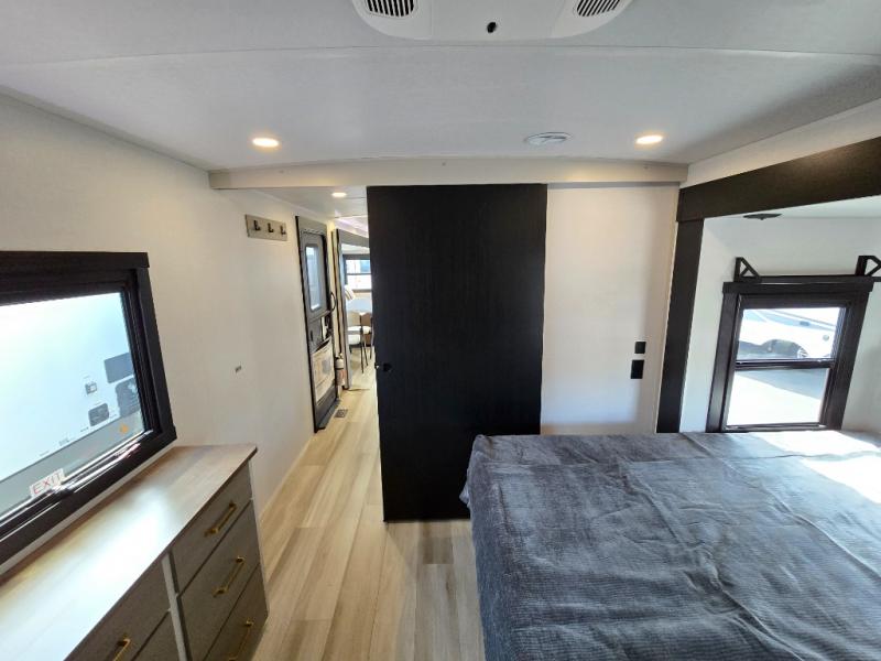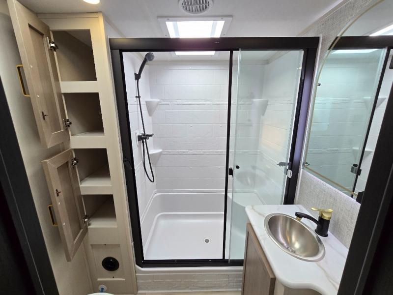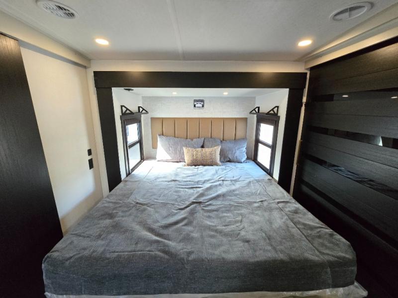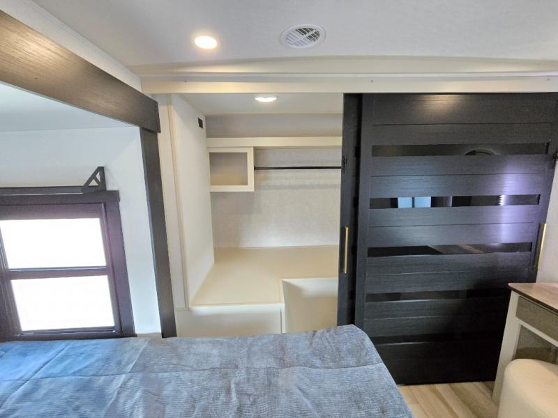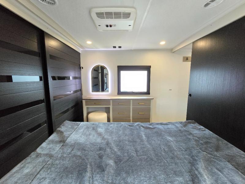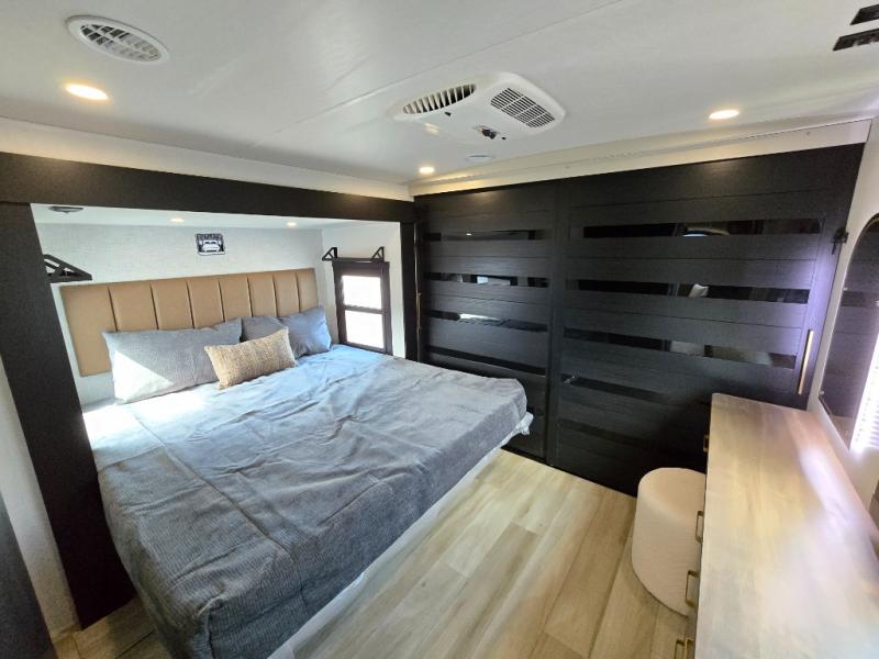 You are going to love the spacious private bedroom with a space-saving door, custom king bed slide, a dresser, and a full-width wardrobe with washer and dryer prep. If you ever decide to get out of bed, you can enjoy a relaxing shower in the residential shower with a skylight and a wide-open kitchen and living area with dual opposing slide outs. The cook will love having a kitchen island, a hutch, a large pantry, plus a 12V refrigerator. There is an entertainment center with a 50" TV and fireplace plus plenty of seating on the furniture. You can dine at the booth dinette or choose to add the free-standing dinette option if you prefer having your own seat. And don't forget about the natural lighting and views you will receive from the panoramic windows.