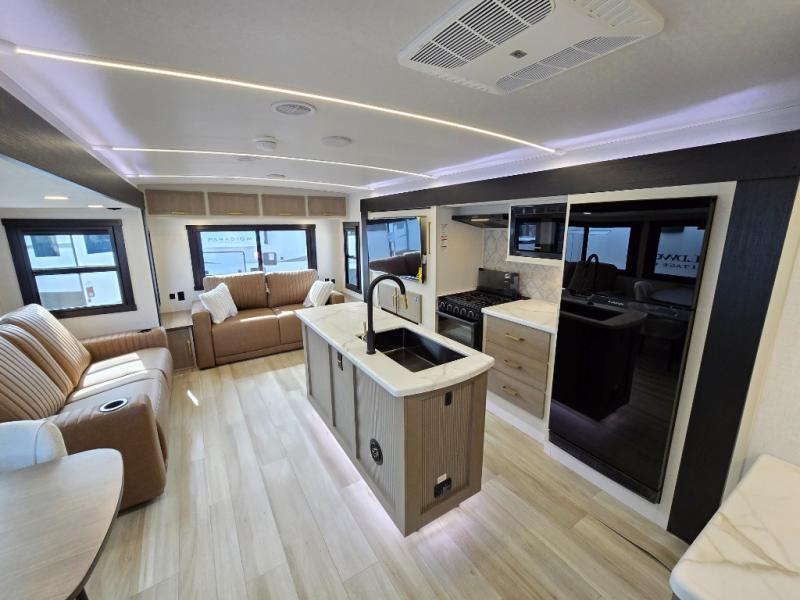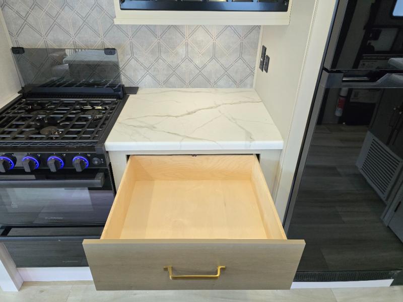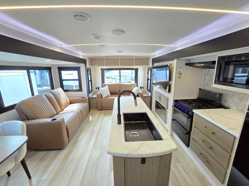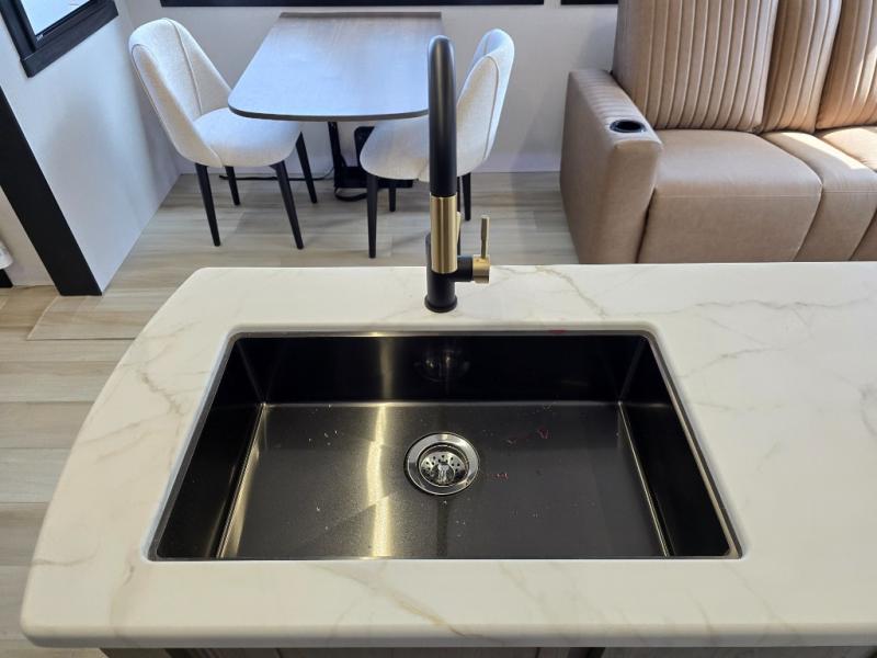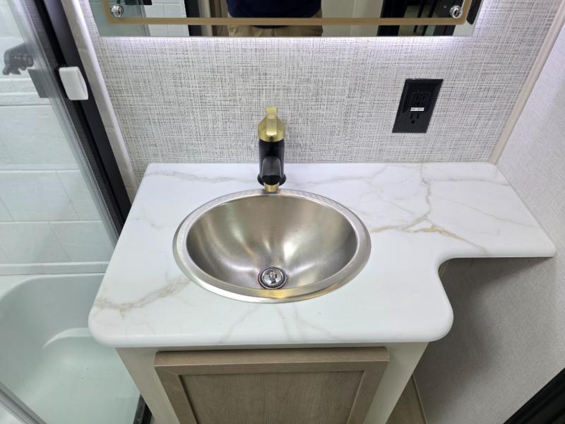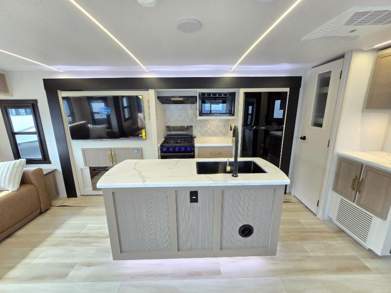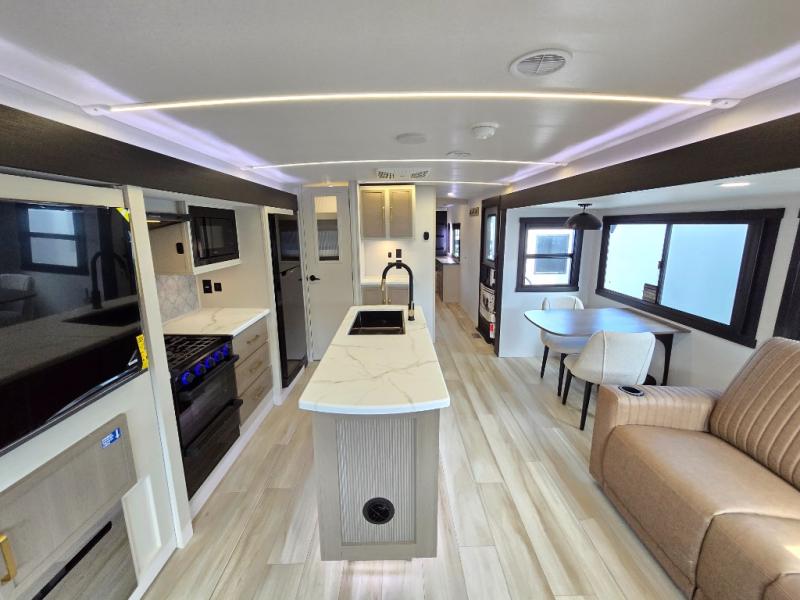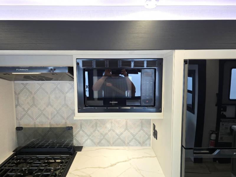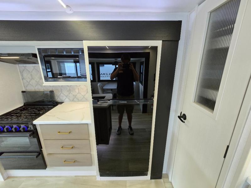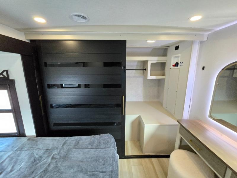 You are going to love the spacious private bedroom with a space-saving door, custom king bed slide, a dresser, and a full-width wardrobe with washer and dryer prep. If you ever decide to get out of bed, you can enjoy a relaxing shower in the residential shower with a skylight and a wide-open kitchen and living area with dual opposing slide outs. The cook will love having a kitchen island, a hutch, a large pantry, plus a 12V refrigerator. There is an entertainment center with a 50" TV and fireplace plus plenty of seating on the furniture. You can dine at the booth dinette or choose to add the free-standing dinette option if you prefer having your own seat. And don't forget about the natural lighting and views you will receive from the panoramic windows.
