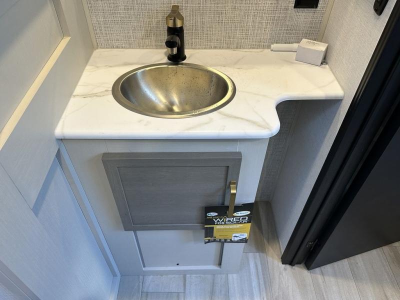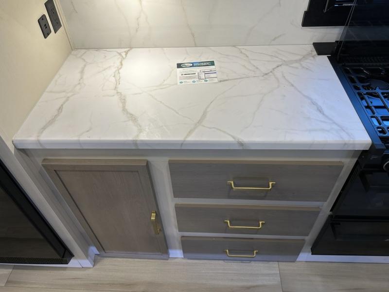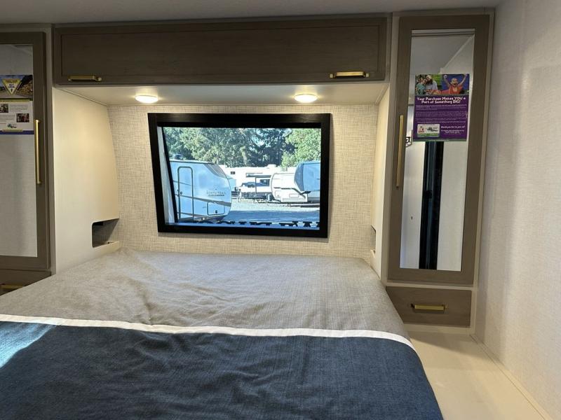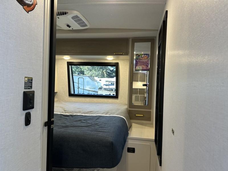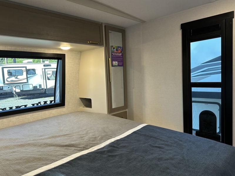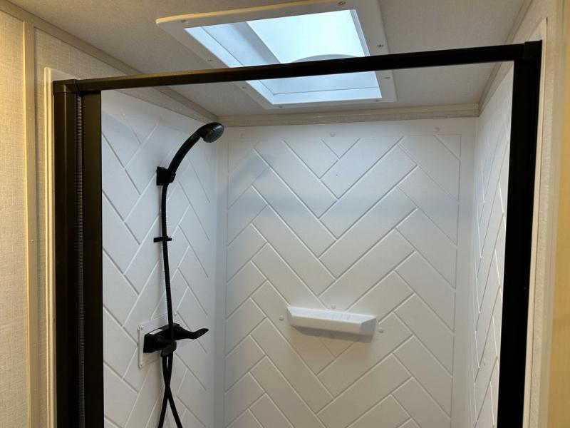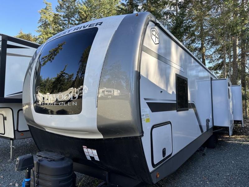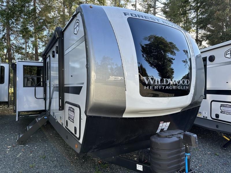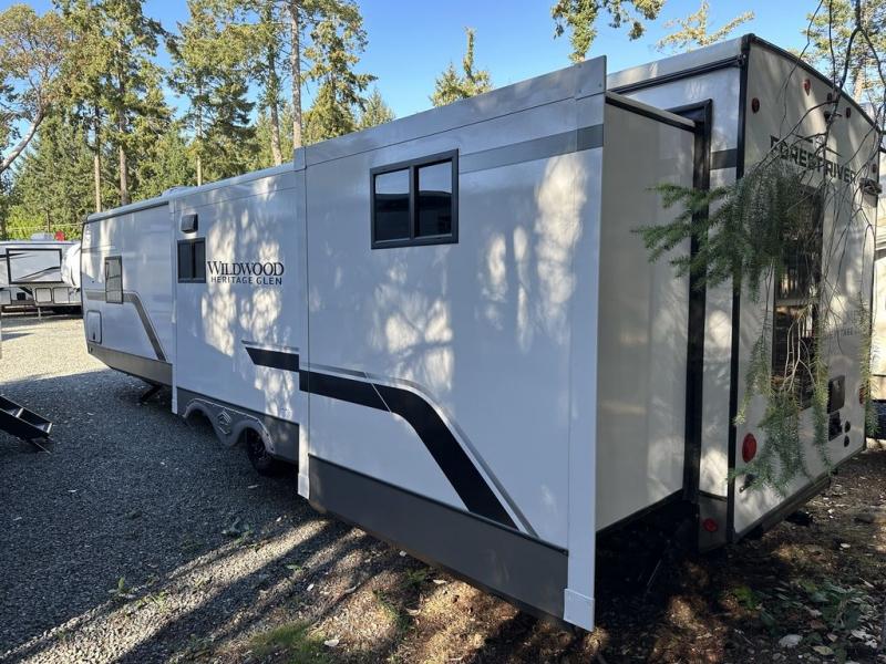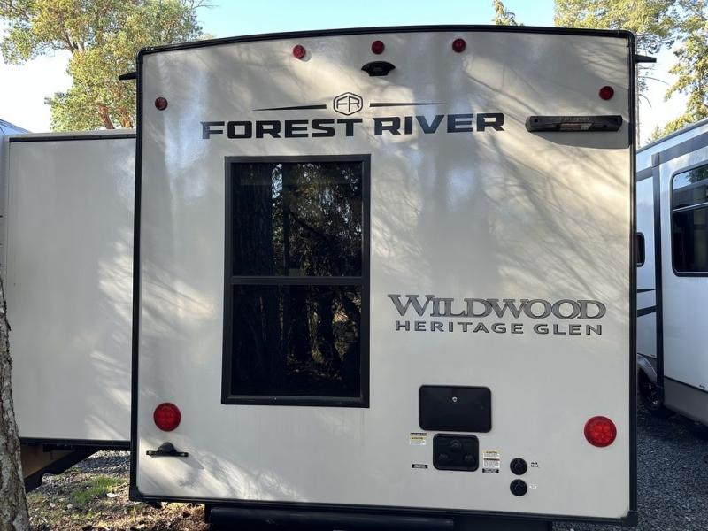 With any Wildwood Heritage Glen travel trailer by Forest River, the quality construction, attention to detail and design along with a bright and welcoming interior allows you to relax in comfort with conveniences while exploring outdoors. Each model includes a WeatherShield one piece fiberglass roof, Maxxis radial tires, and an enclosed underbelly with 12V tank heaters on all holding tanks for added protection. You will appreciate the on-demand tankless water heater, along with the 15K BTU Quite Cool A/C and 50 Amp service with a brace for a second A/C. There is an outside shower with hot and cold water, solar prep, a power tongue jack, plus many more exterior conveniences. Head inside to enjoy matte gold hardware, wood door casings in place of plastic door casings, and full length barreled ceilings for additional head room.