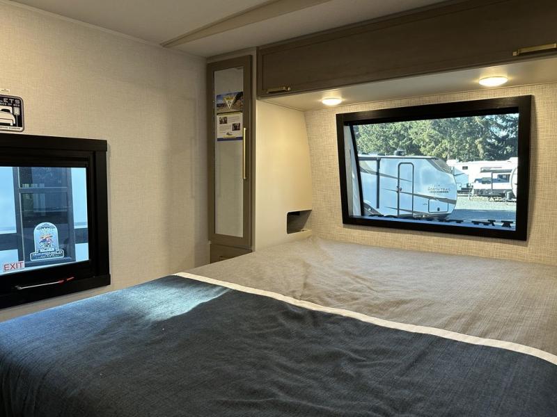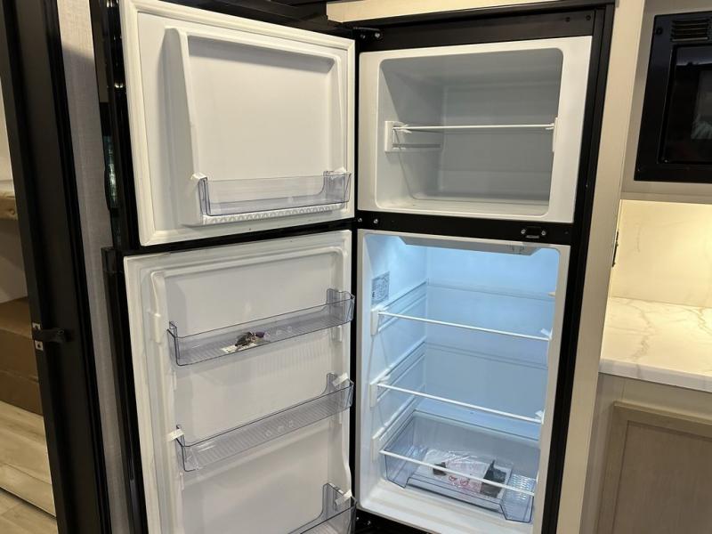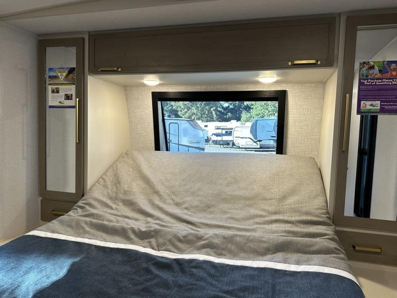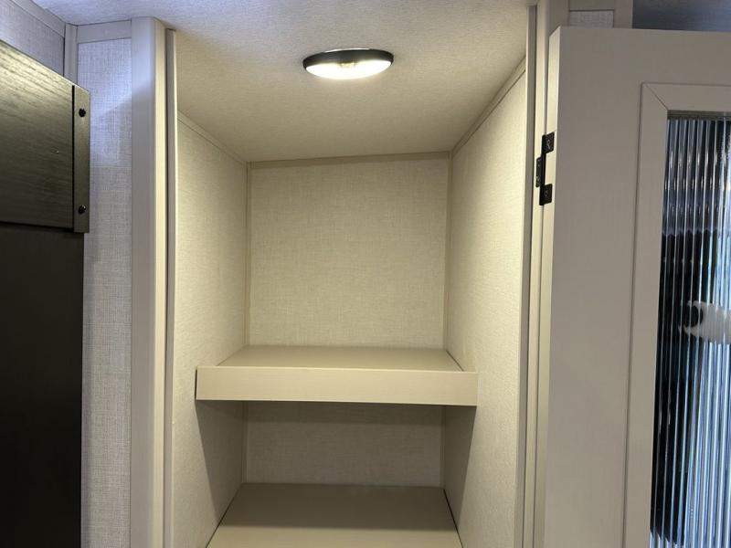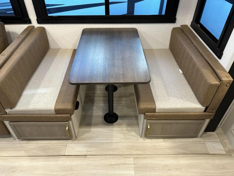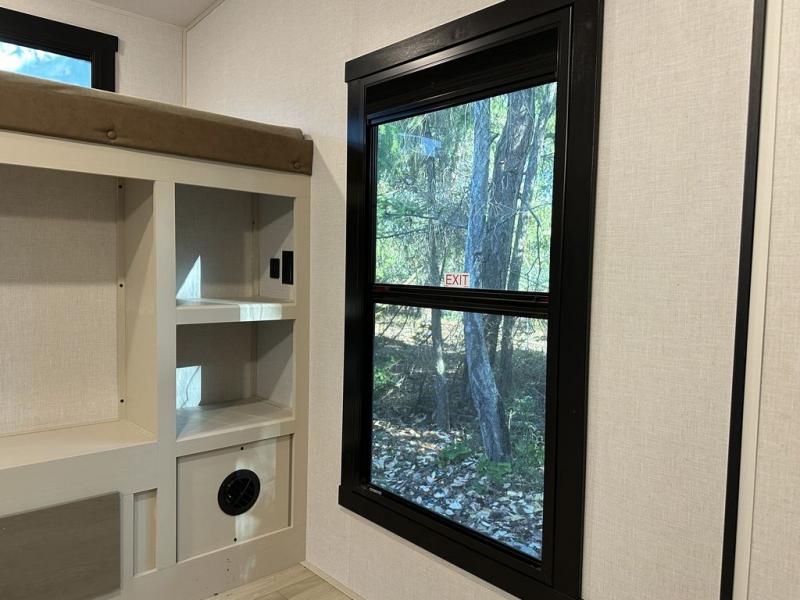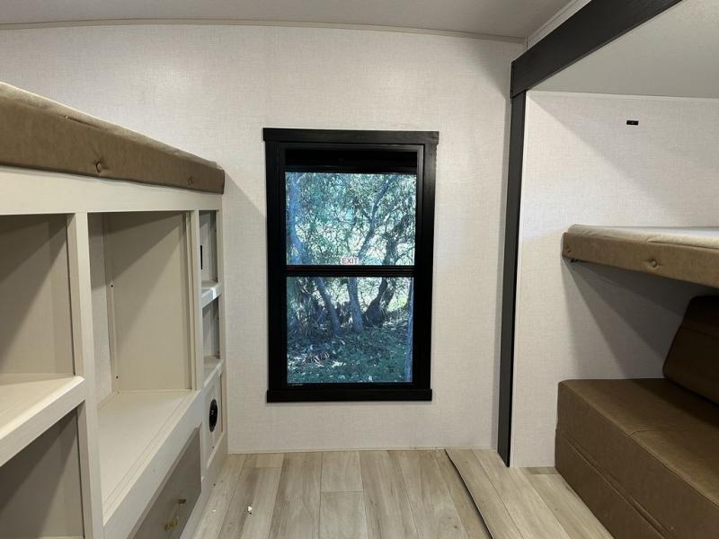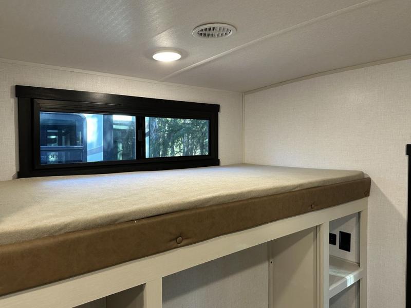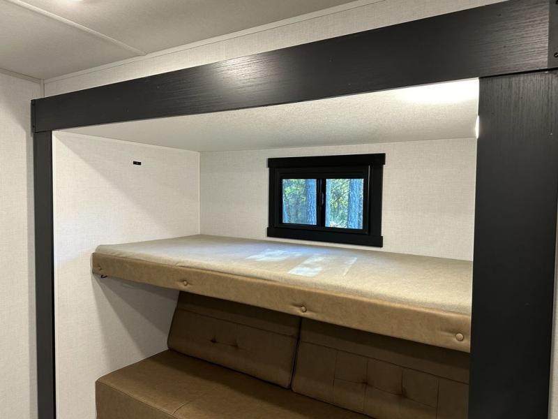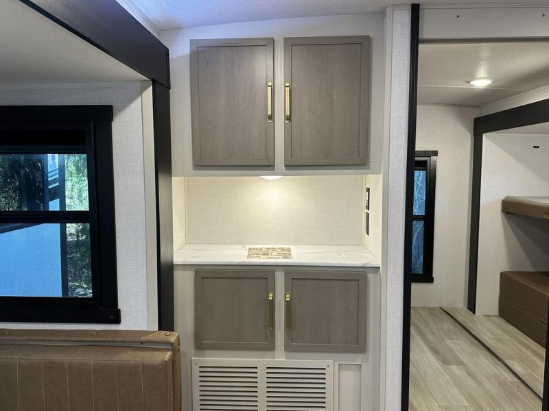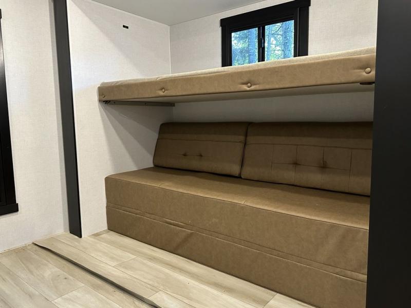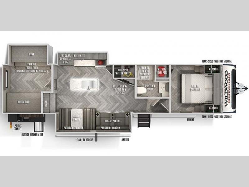 Your kids or friends are ready for a trip in this Wildwood Heritage Glen travel trailer, but are you? As the kiddos or your buddies claim the private bunkhouse for themselves, which includes two bunk beds and a convertible sofa bed, you can escape to your own privacy in the front bedroom with a queen bed with Versa Tilt and lots of storage. There is even washer/dryer prep for added convenience. The main living area and kitchen might be the next indoor hangout spot thanks to the chef-size walk-in pantry and 12V refrigerator. The cook even has a choice of making meals on the outside kitchen/bar which also includes an LP quick connect nearby. On rainy days, the theatre seats and booth dinette will offer a place to watch TV and play games, and the panoramic windows will always offer beautiful scenery no matter the weather conditions.
