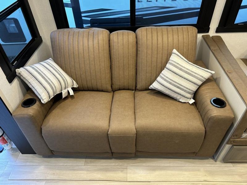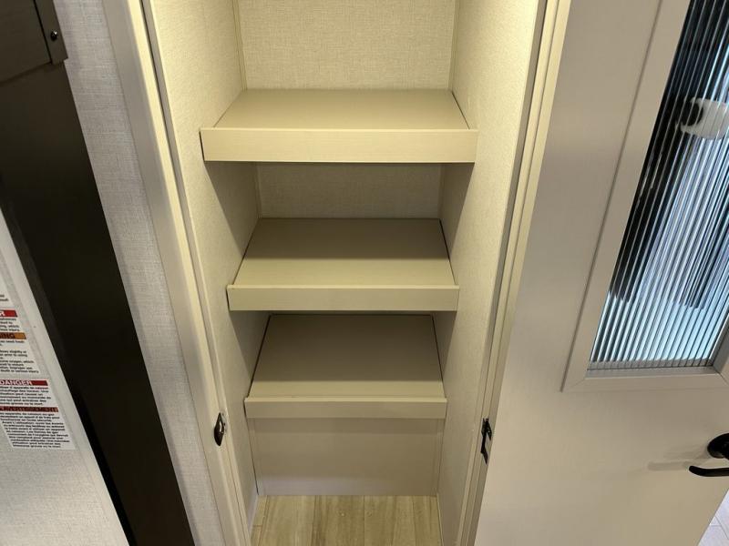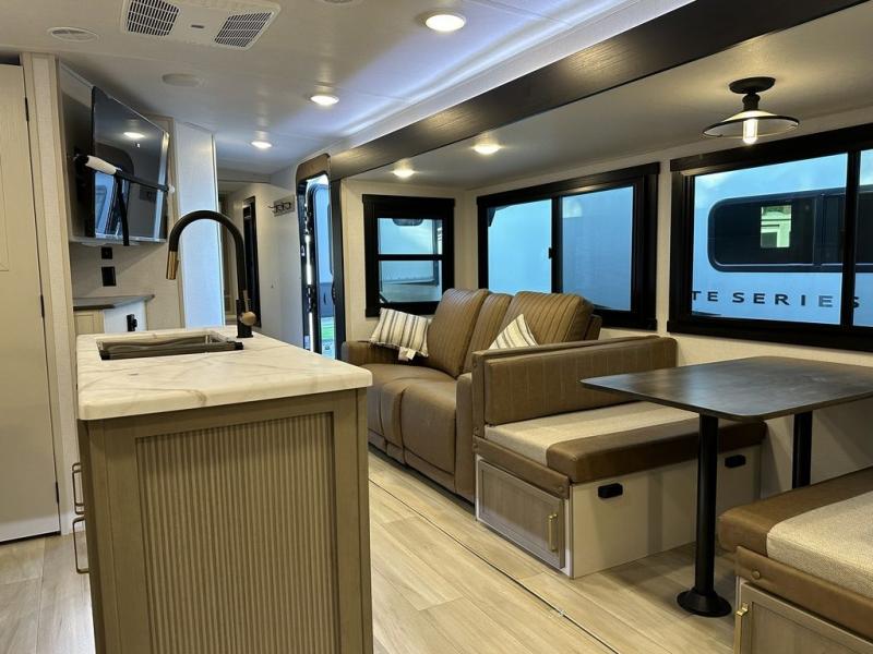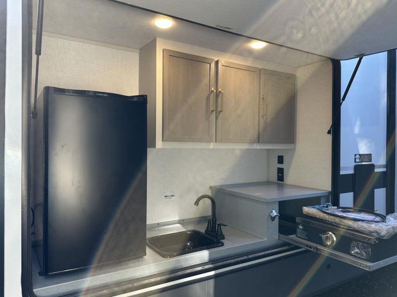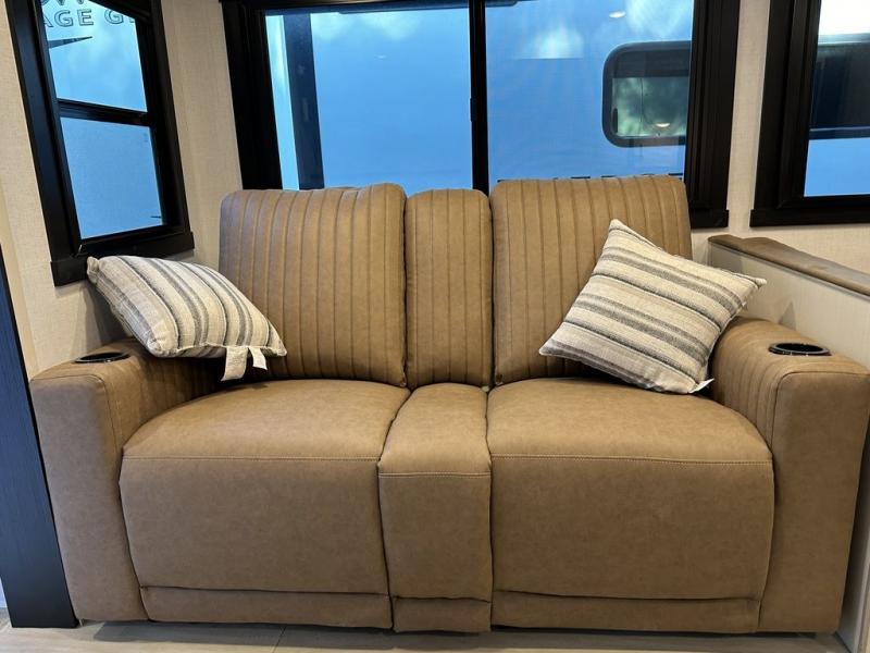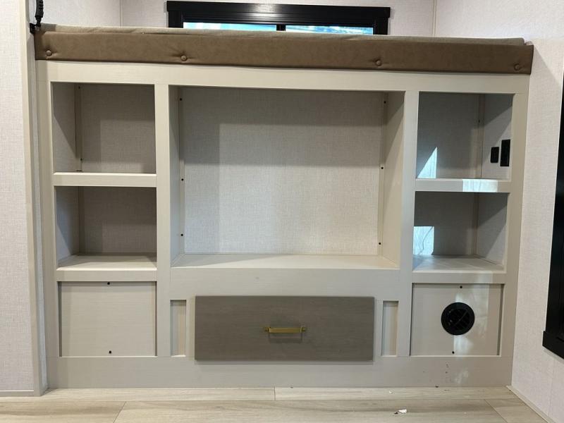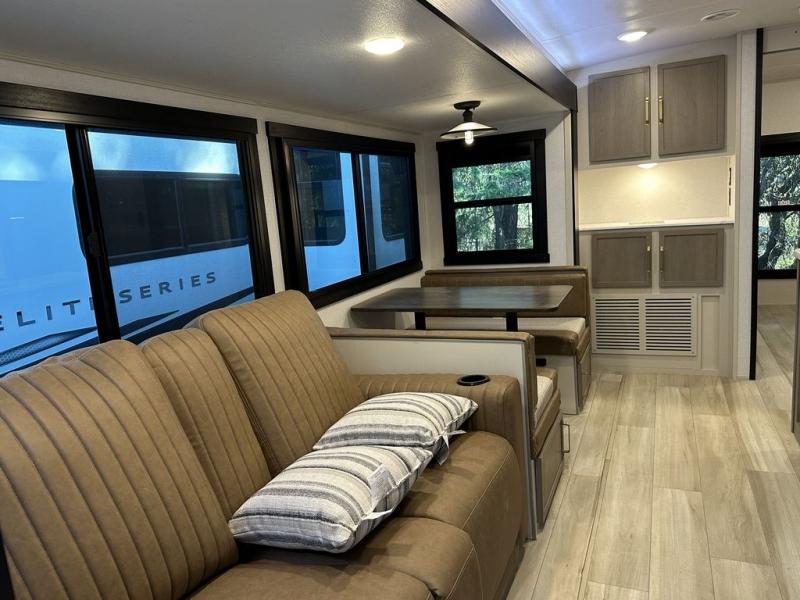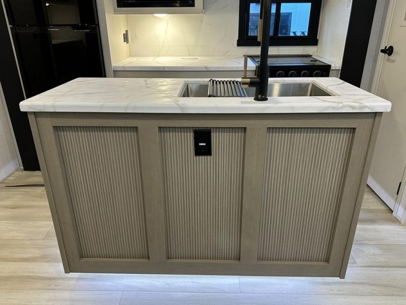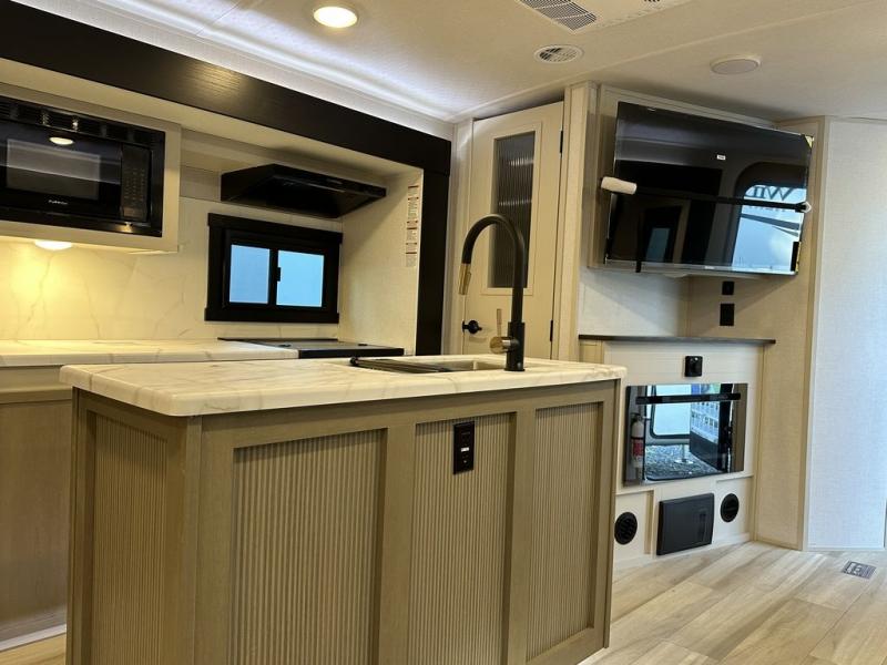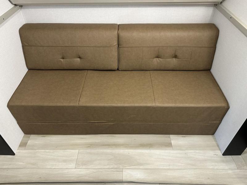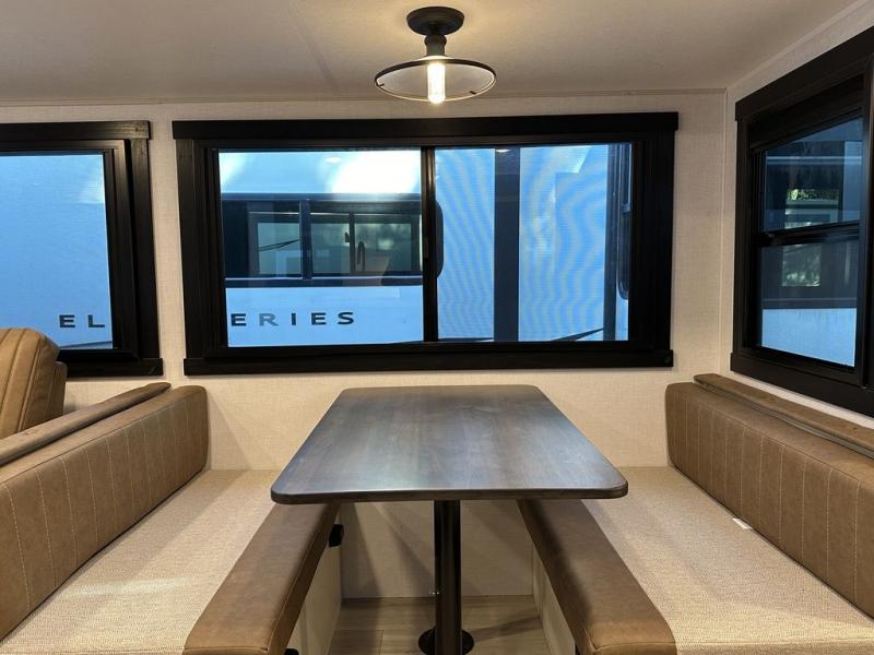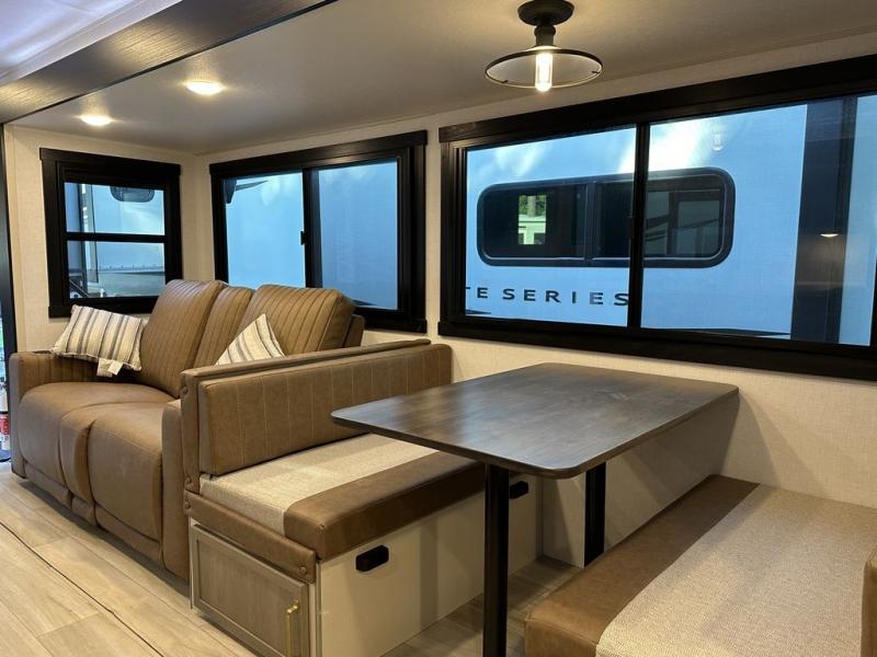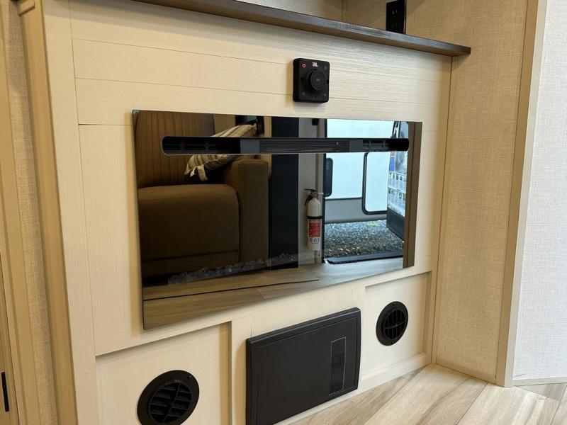 Your kids or friends are ready for a trip in this Wildwood Heritage Glen travel trailer, but are you? As the kiddos or your buddies claim the private bunkhouse for themselves, which includes two bunk beds and a convertible sofa bed, you can escape to your own privacy in the front bedroom with a queen bed with Versa Tilt and lots of storage. There is even washer/dryer prep for added convenience. The main living area and kitchen might be the next indoor hangout spot thanks to the chef-size walk-in pantry and 12V refrigerator. The cook even has a choice of making meals on the outside kitchen/bar which also includes an LP quick connect nearby. On rainy days, the theatre seats and booth dinette will offer a place to watch TV and play games, and the panoramic windows will always offer beautiful scenery no matter the weather conditions.
