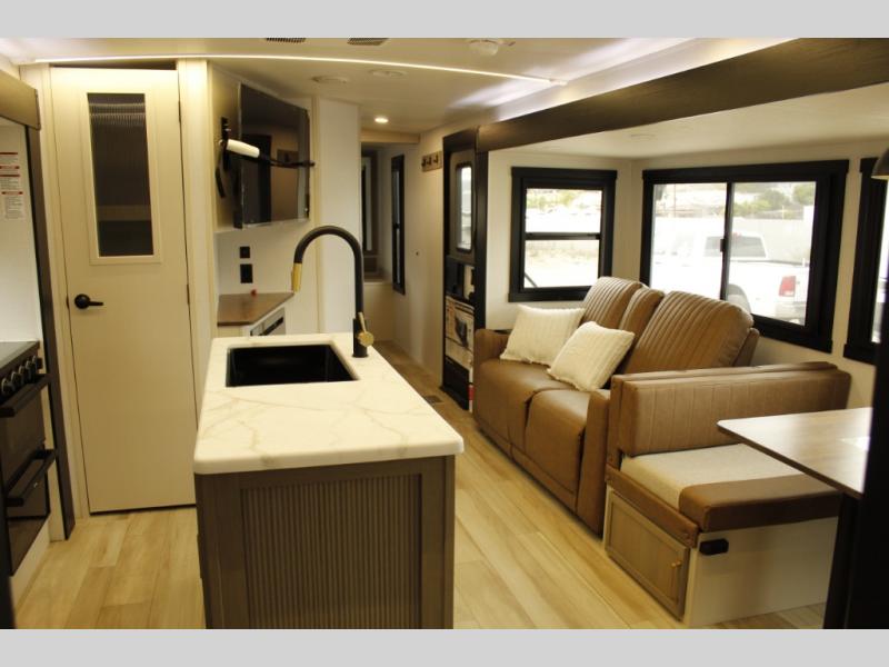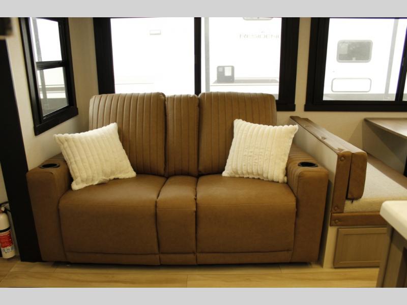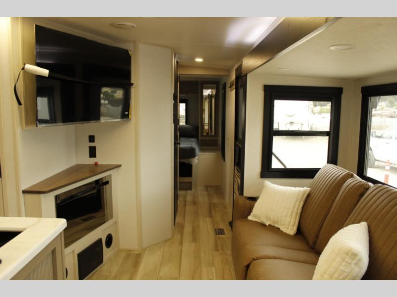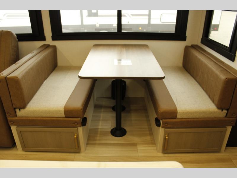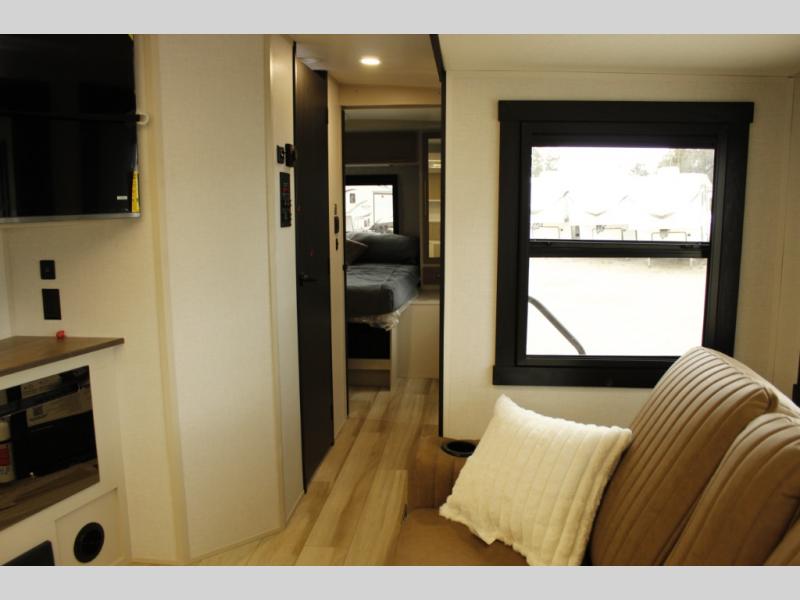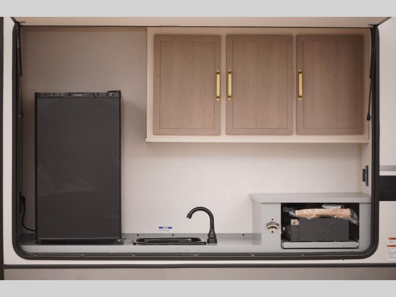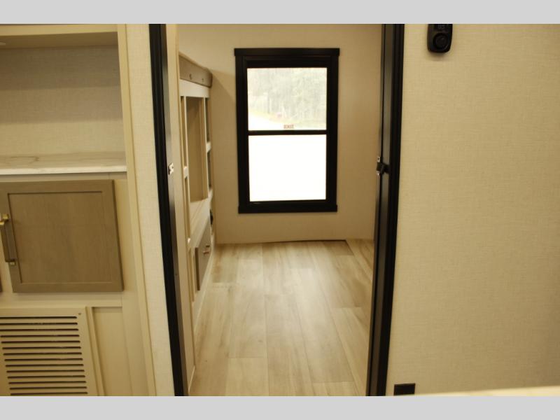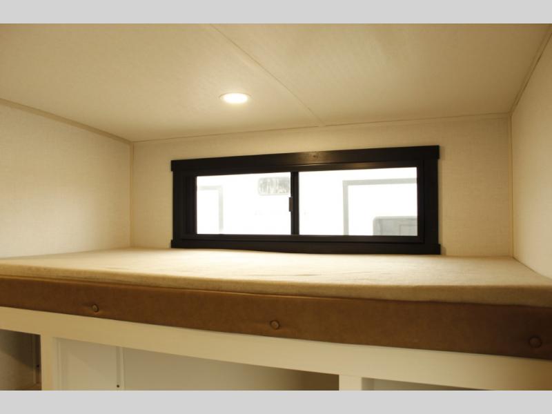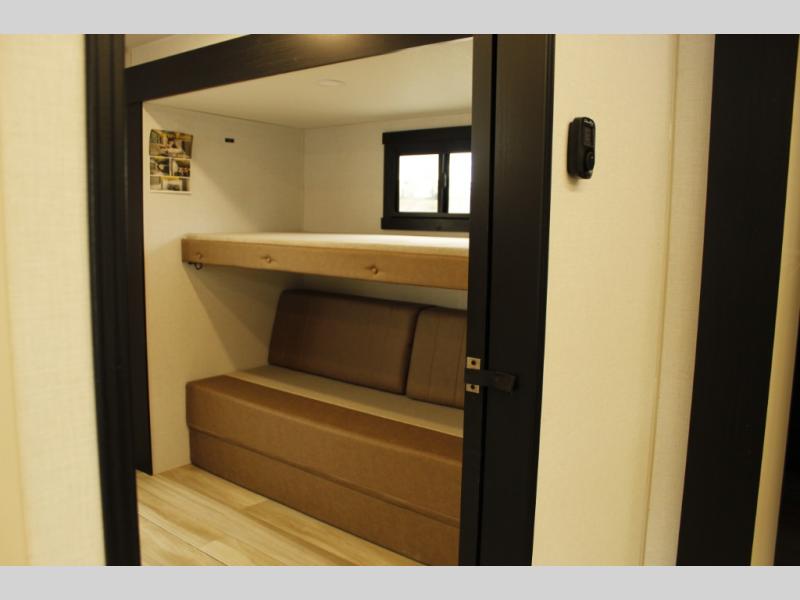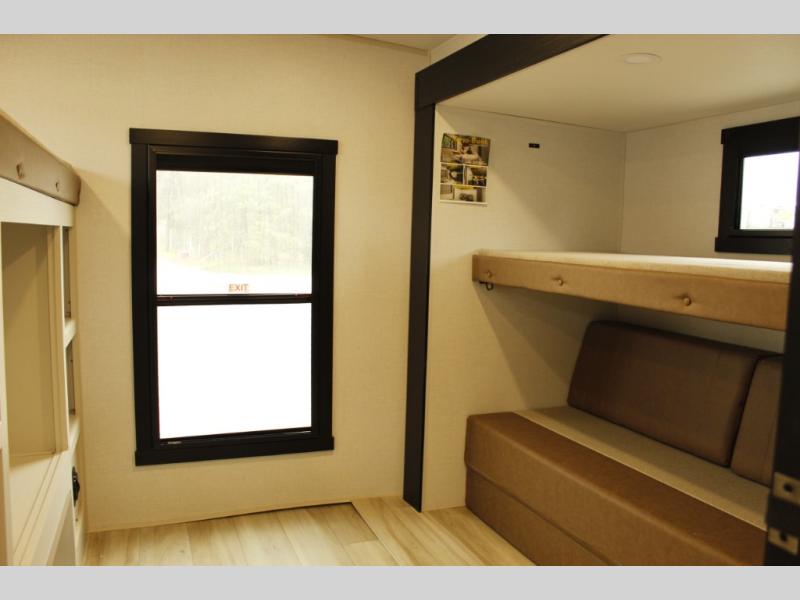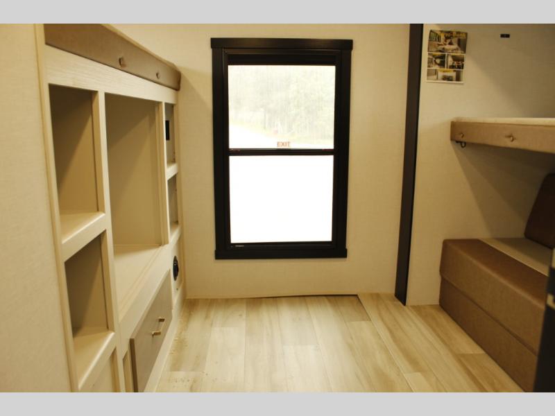 Your kids or friends are ready for a trip in this Wildwood Heritage Glen travel trailer, but are you? As the kiddos or your buddies claim the private bunkhouse for themselves, which includes two bunk beds and a convertible sofa bed, you can escape to your own privacy in the front bedroom with a queen bed with Versa Tilt and lots of storage. There is even washer/dryer prep for added convenience. The main living area and kitchen might be the next indoor hangout spot thanks to the chef-size walk-in pantry and 12V refrigerator. The cook even has a choice of making meals on the outside kitchen/bar which also includes an LP quick connect nearby. On rainy days, the theatre seats and booth dinette will offer a place to watch TV and play games, and the panoramic windows will always offer beautiful scenery no matter the weather conditions.